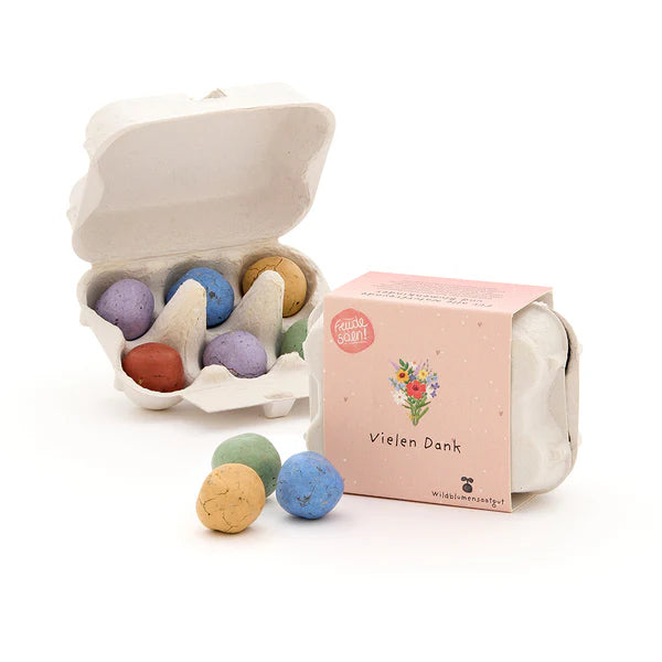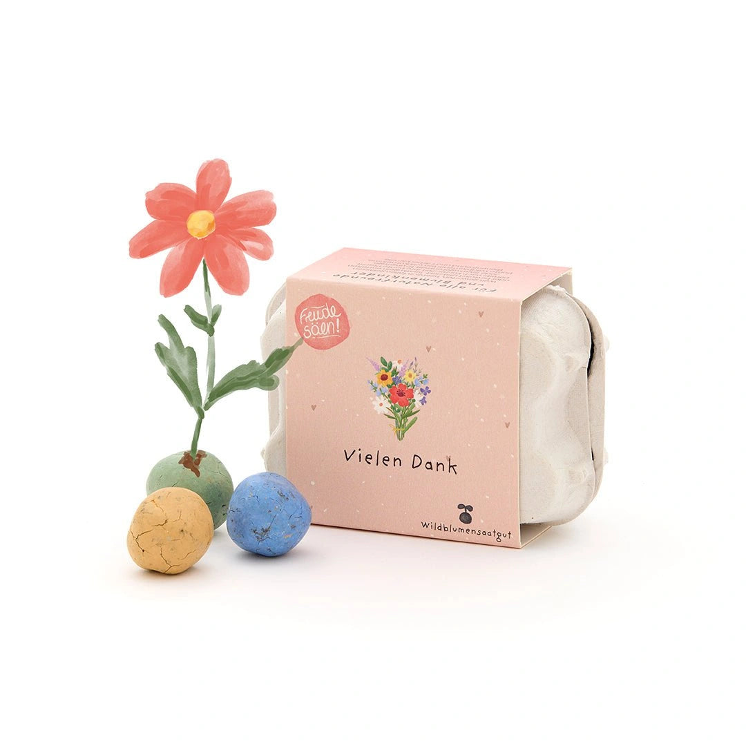 Kleines, wachsendes Dankeschön: Die 6 bunten Blumenmurmeln im Mini-Eierkarton enthalten Wildblumen-Saatgut – eine originelle Geschenkidee für alle, denen du "Vielen Dank" sagen möchtest.