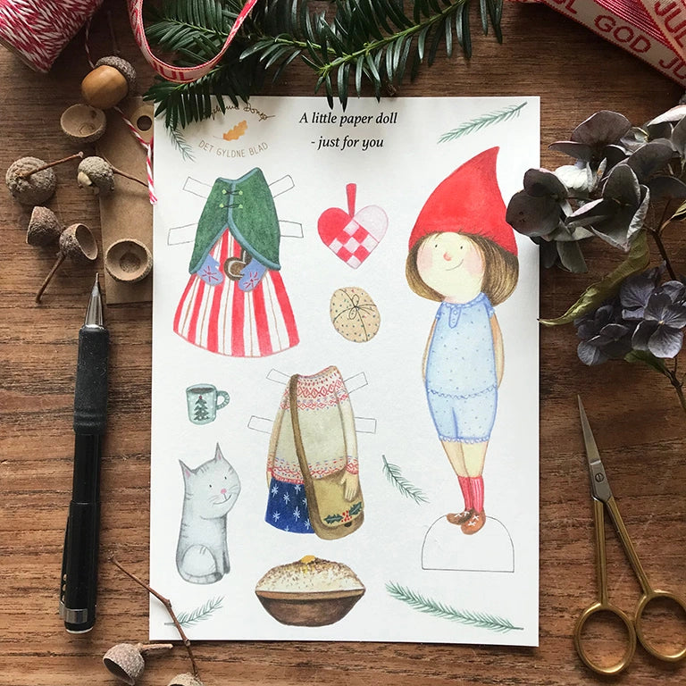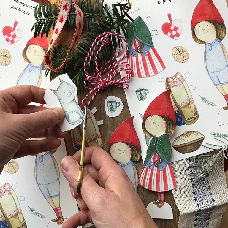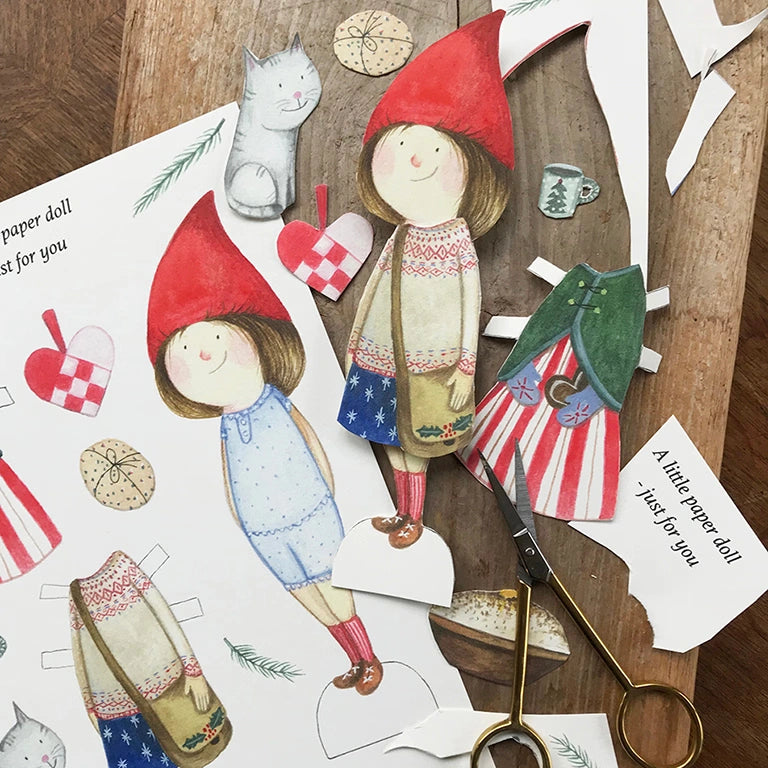 Eine süße kleine Wichtelpuppe zum Anziehen mit feinen Details, Katze und Milchreis. Die Puppe muss selbst ausgeschnitten werden – eine schöne Beschäftigung für Groß und Klein in der Weihnachtszeit, die für Weihnachtsstimmung, Spiel und Spaß sorgt.