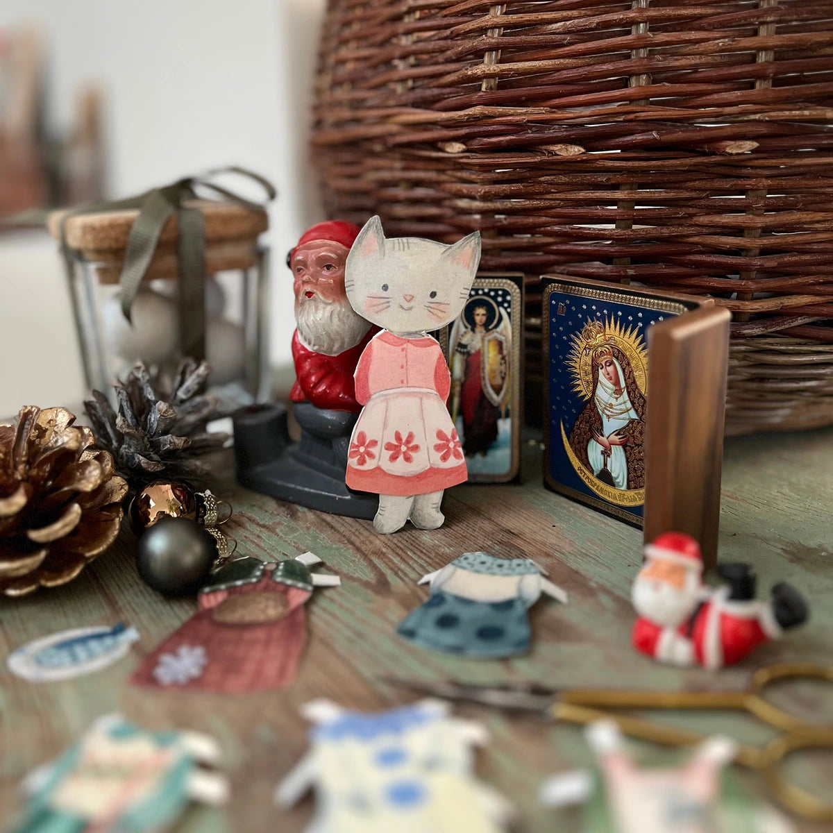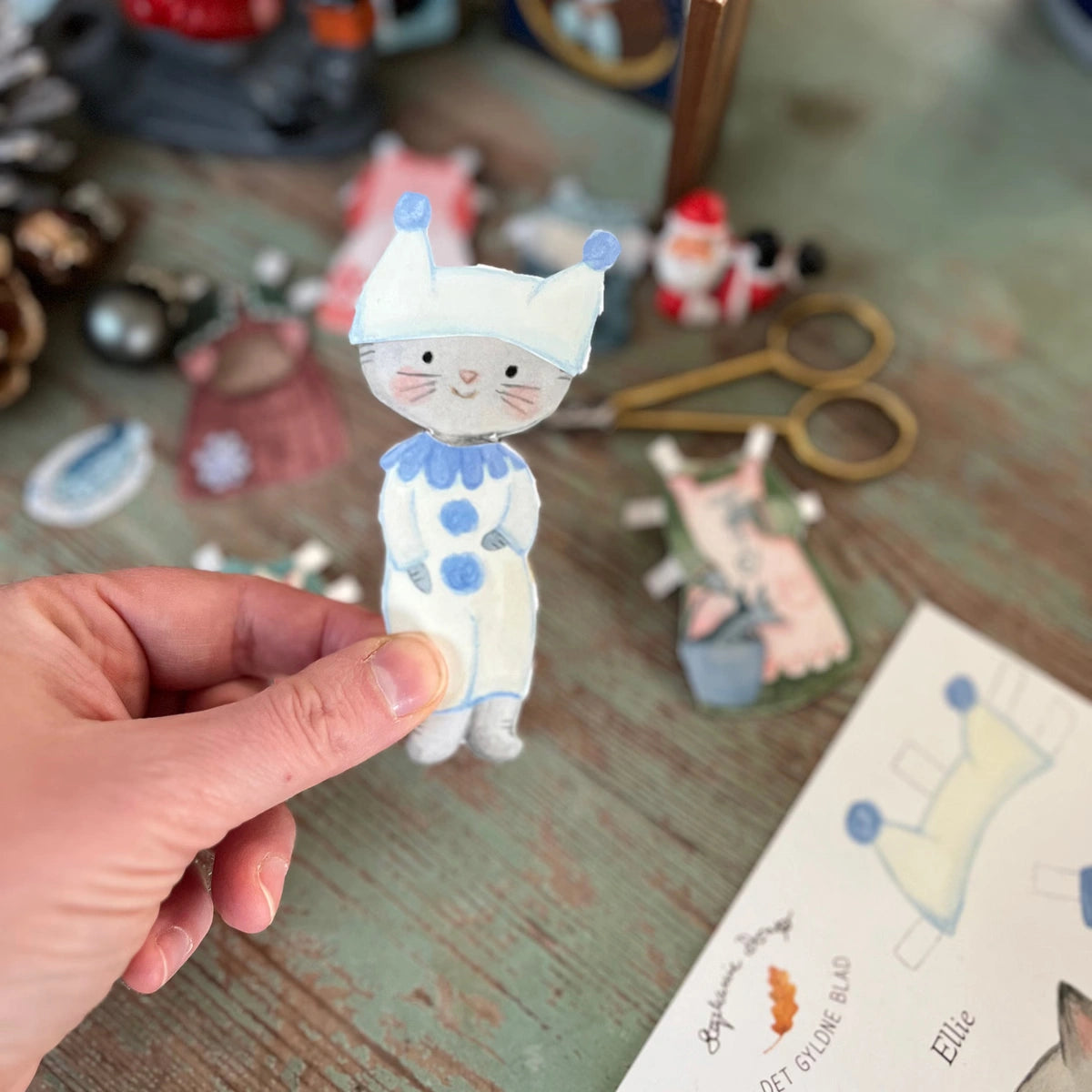 Die süße Katze Ellie, eine neue Ankleidepuppe hier im Shop. Ellie hat sowohl Fisch auf dem Tablett als auch ein süßes Pierrot-Kostüm und mehrere Kleider zum Wechseln.