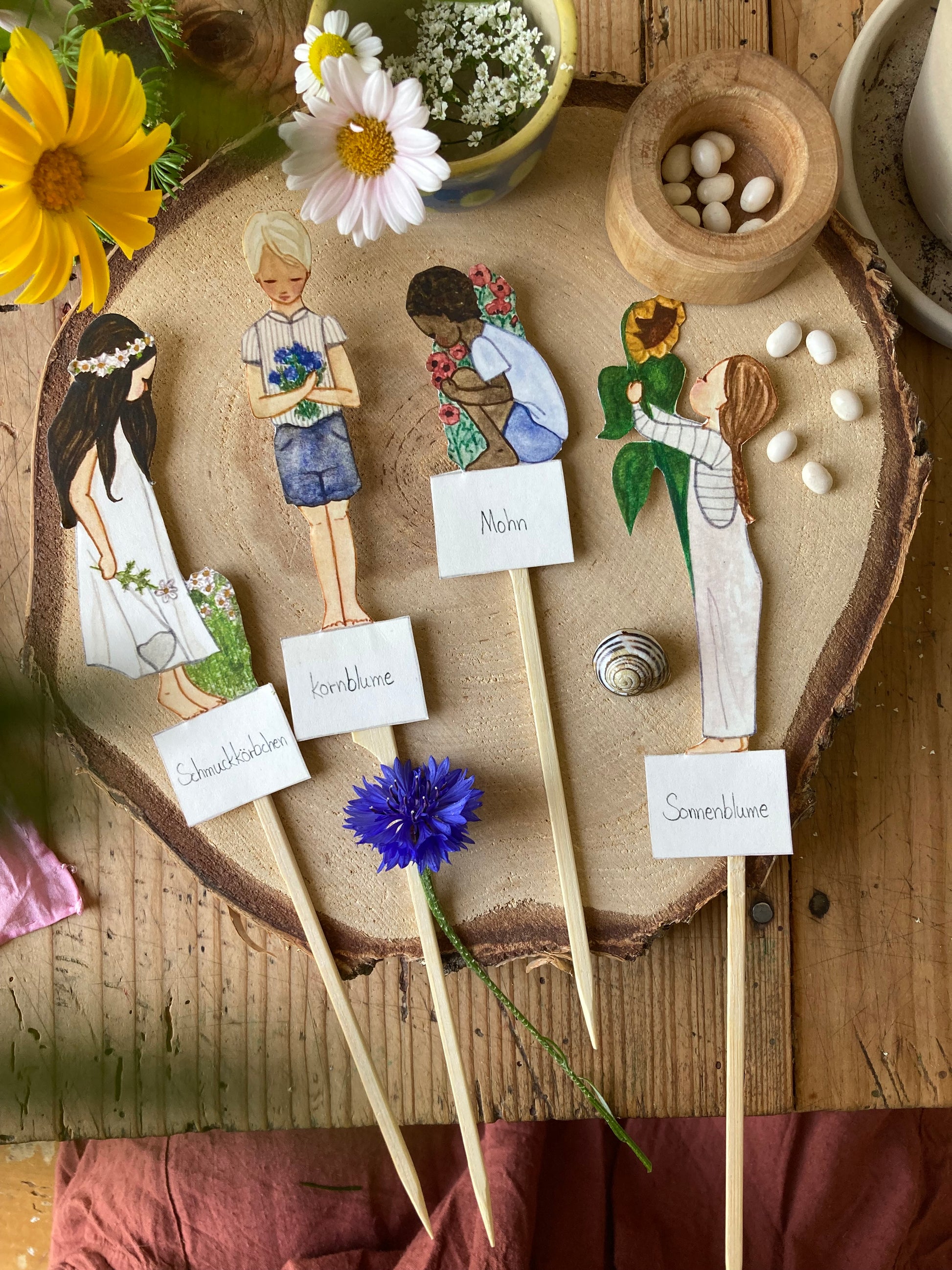 Die Sonne scheint durch die Fenster und es ist Zeit, Samen auf die Fensterbank zu pflanzen. Clematis, Kornblume, Mohn, Sonnenblume. Schneide die kleinen Kinder aus, klebe sie auf die Pflanzenstäbchen und lege sie zusammen mit deinem Samen in die Erde.