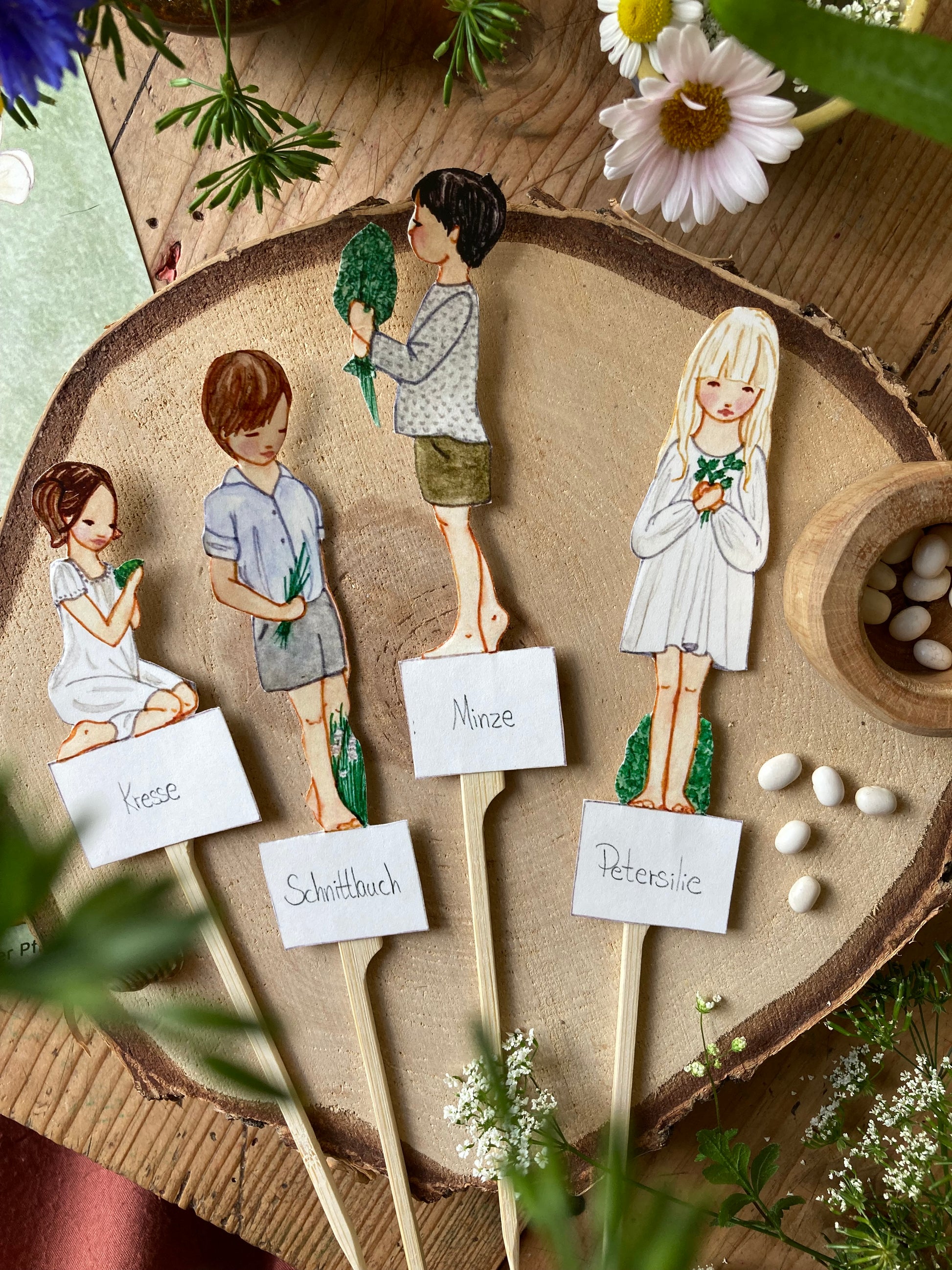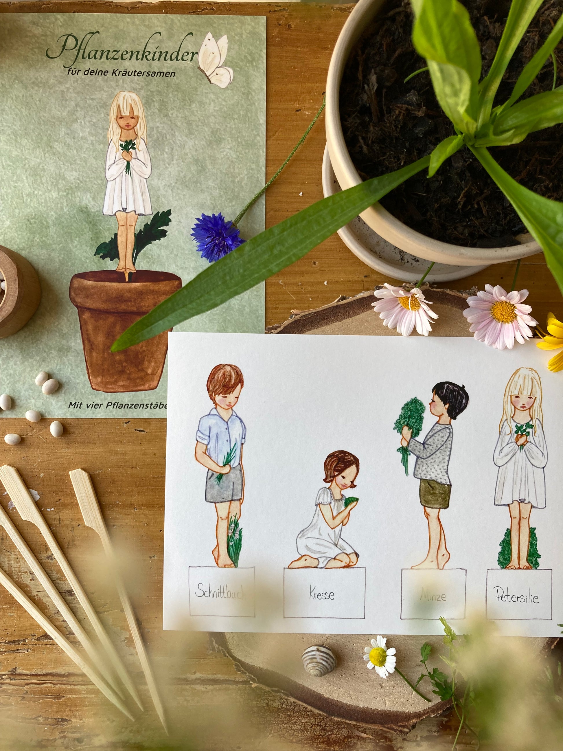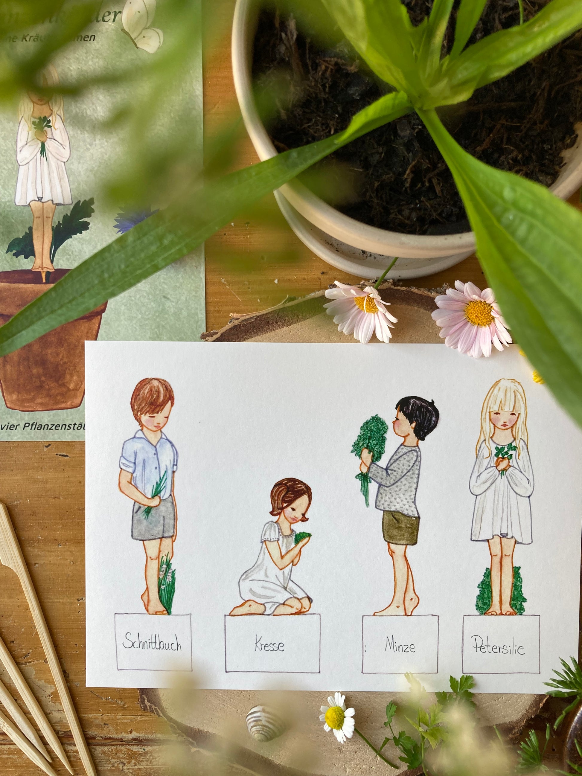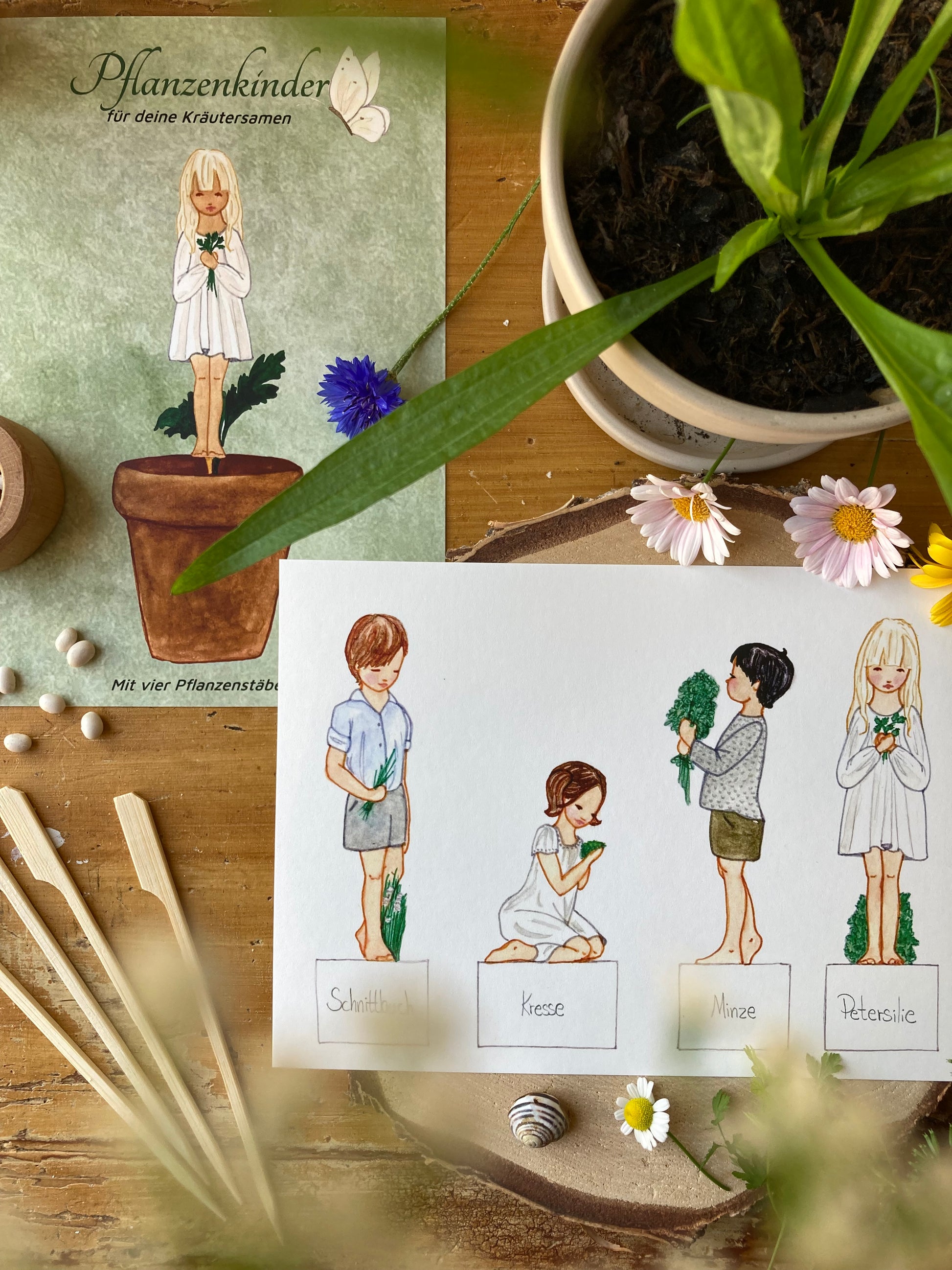 Die Sonne scheint durch die Fenster und es ist Zeit, Samen auf die Fensterbank zu pflanzen. Machen Sie das Erlebnis besonders gemütlich mit diesen süßen Kindern, die Kräuter pflanzen. Schnittlauch, Kresse, Minz, Petersilie. Schneide die kleinen Kinder aus, klebe sie auf die Pflanzenstäbchen und lege sie zusammen mit deinen Samen in die Erde.