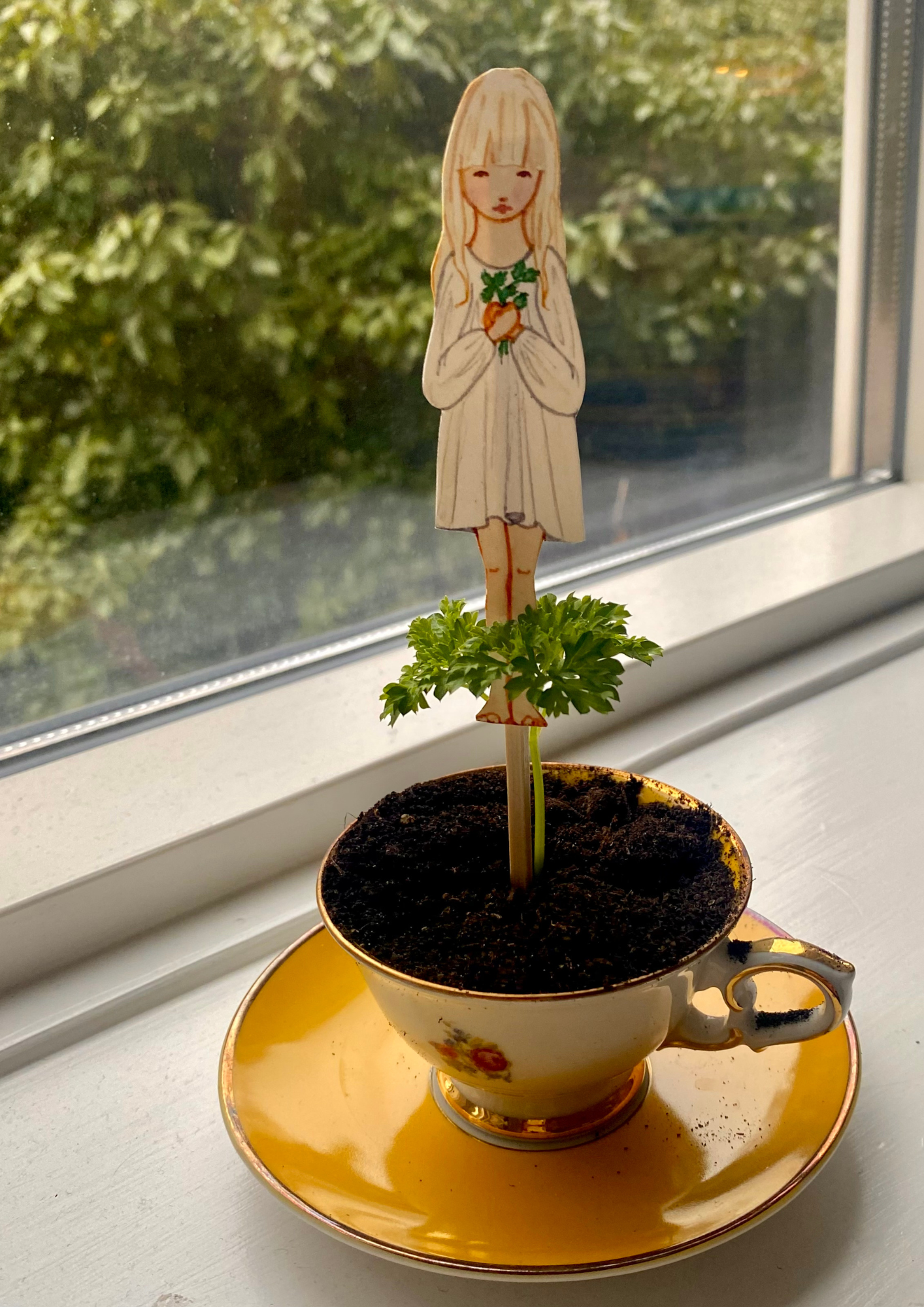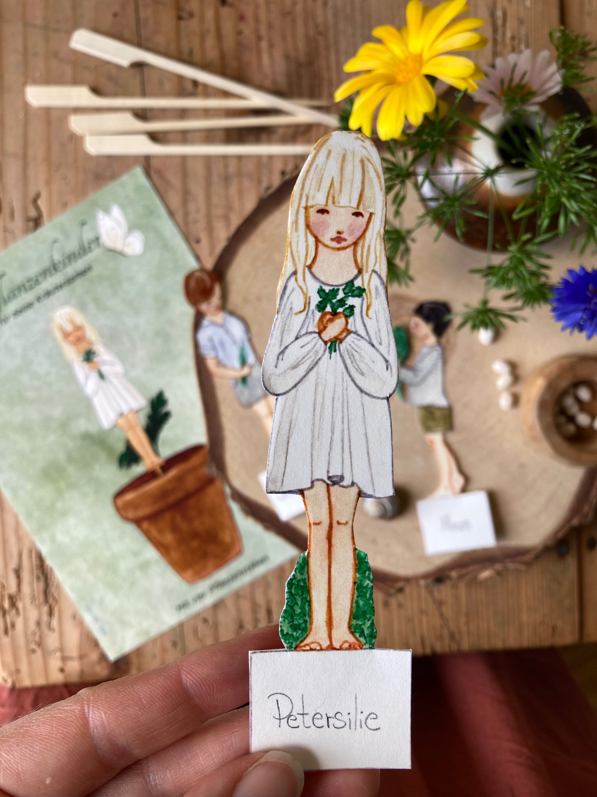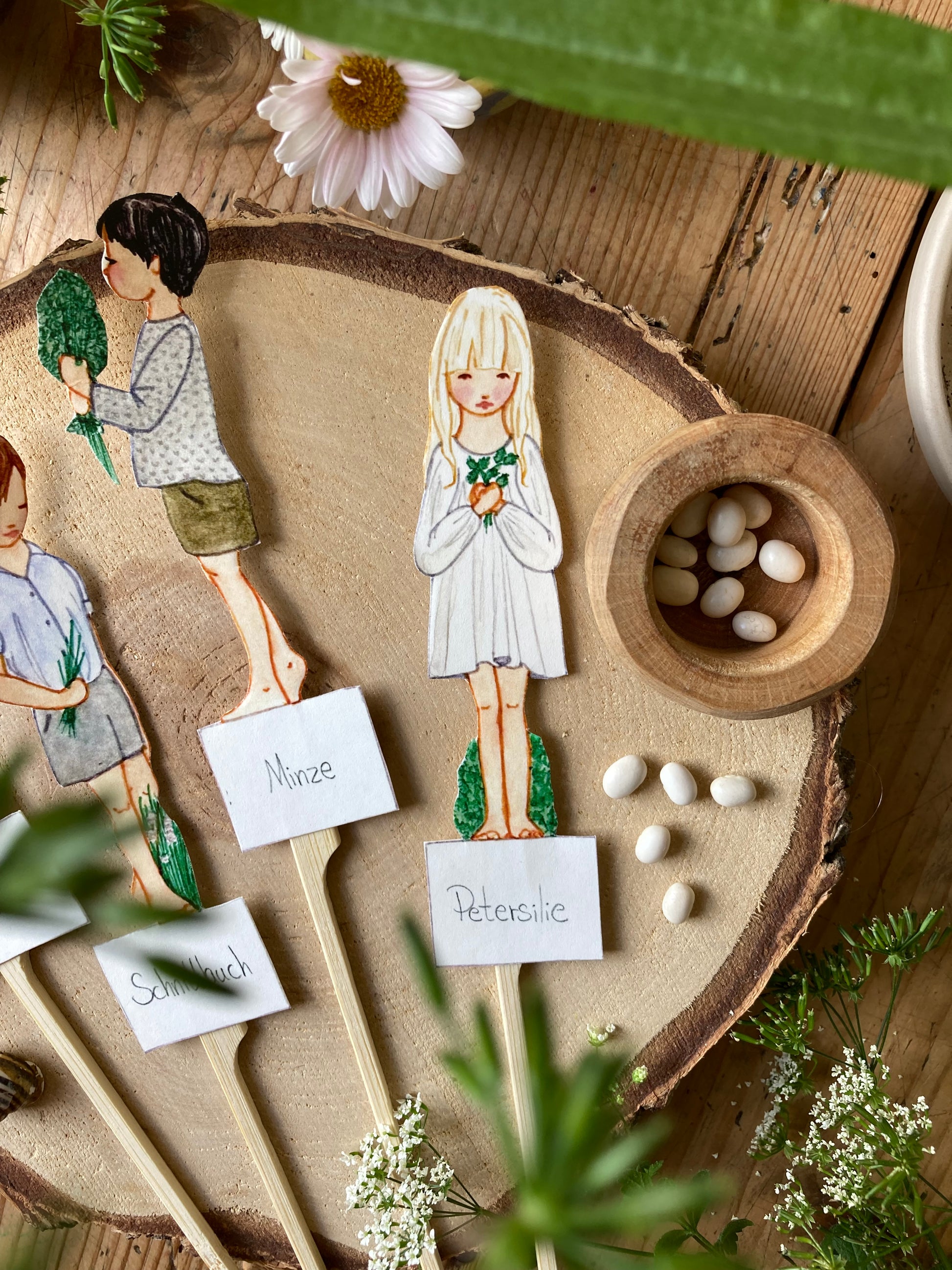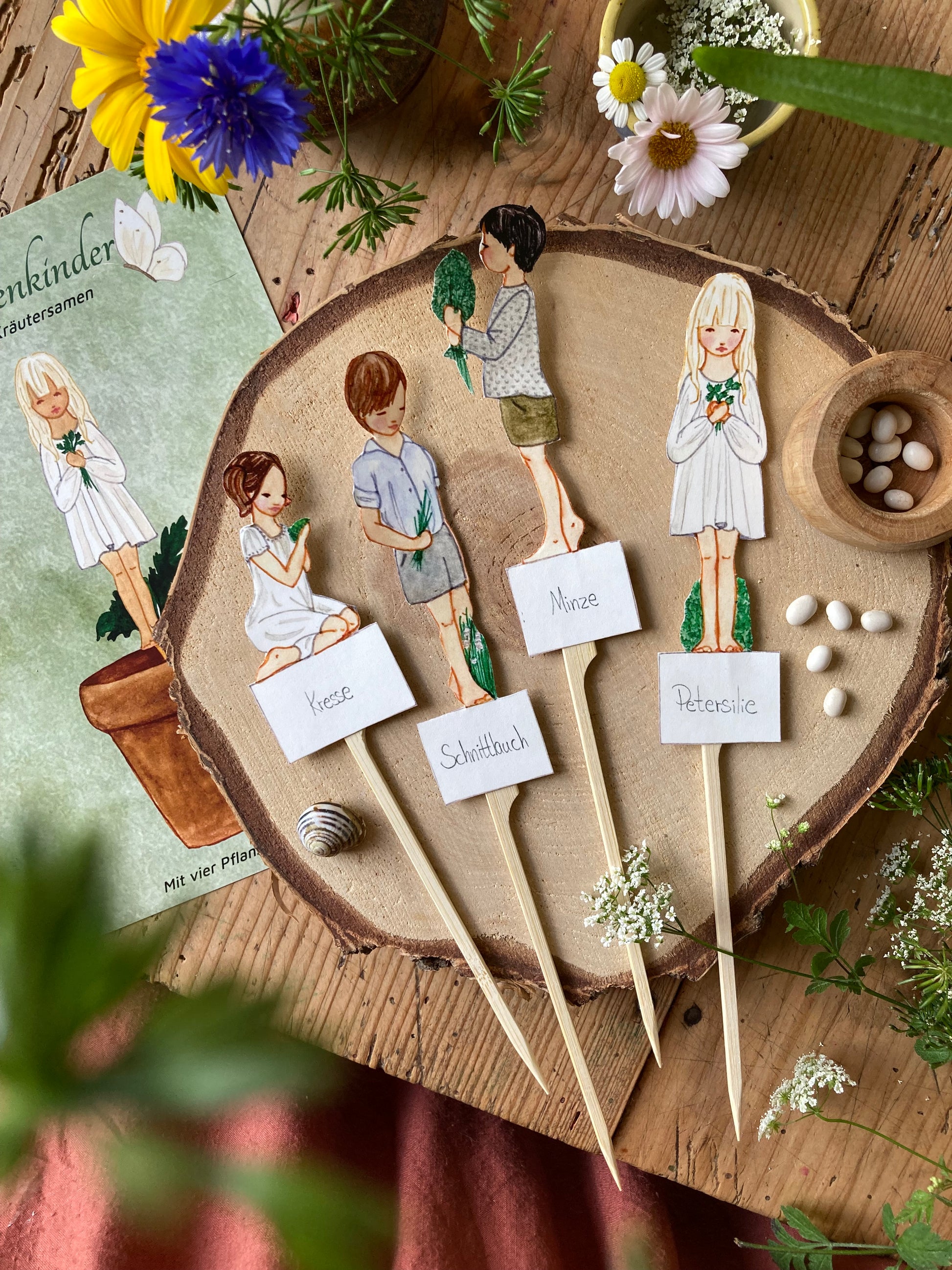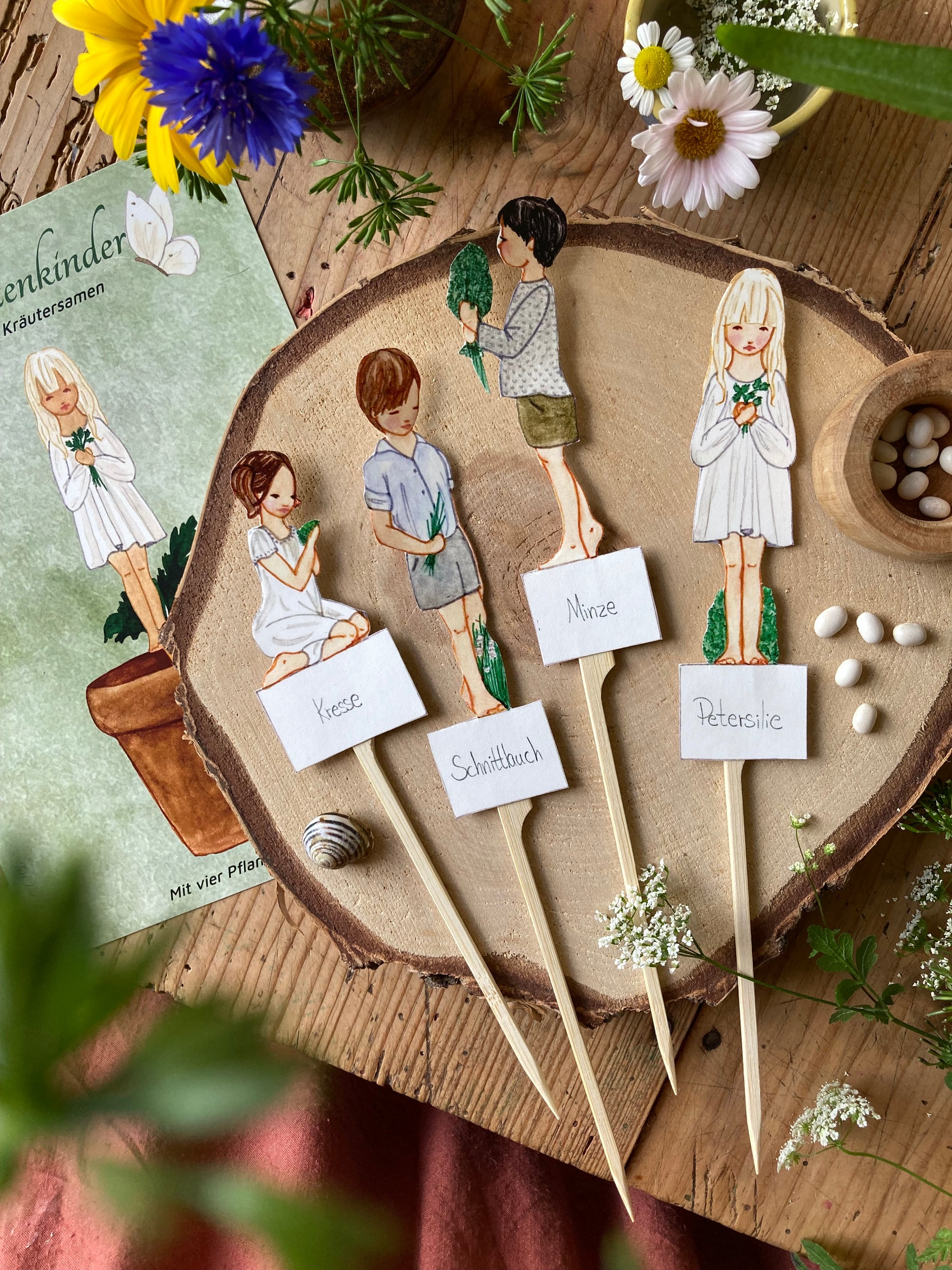 Die Sonne scheint durch die Fenster und es ist Zeit, Samen auf die Fensterbank zu pflanzen. Machen Sie das Erlebnis besonders gemütlich mit diesen süßen Kindern, die Kräuter pflanzen. Schnittlauch, Kresse, Minz, Petersilie. Schneide die kleinen Kinder aus, klebe sie auf die Pflanzenstäbchen und lege sie zusammen mit deinen Samen in die Erde.