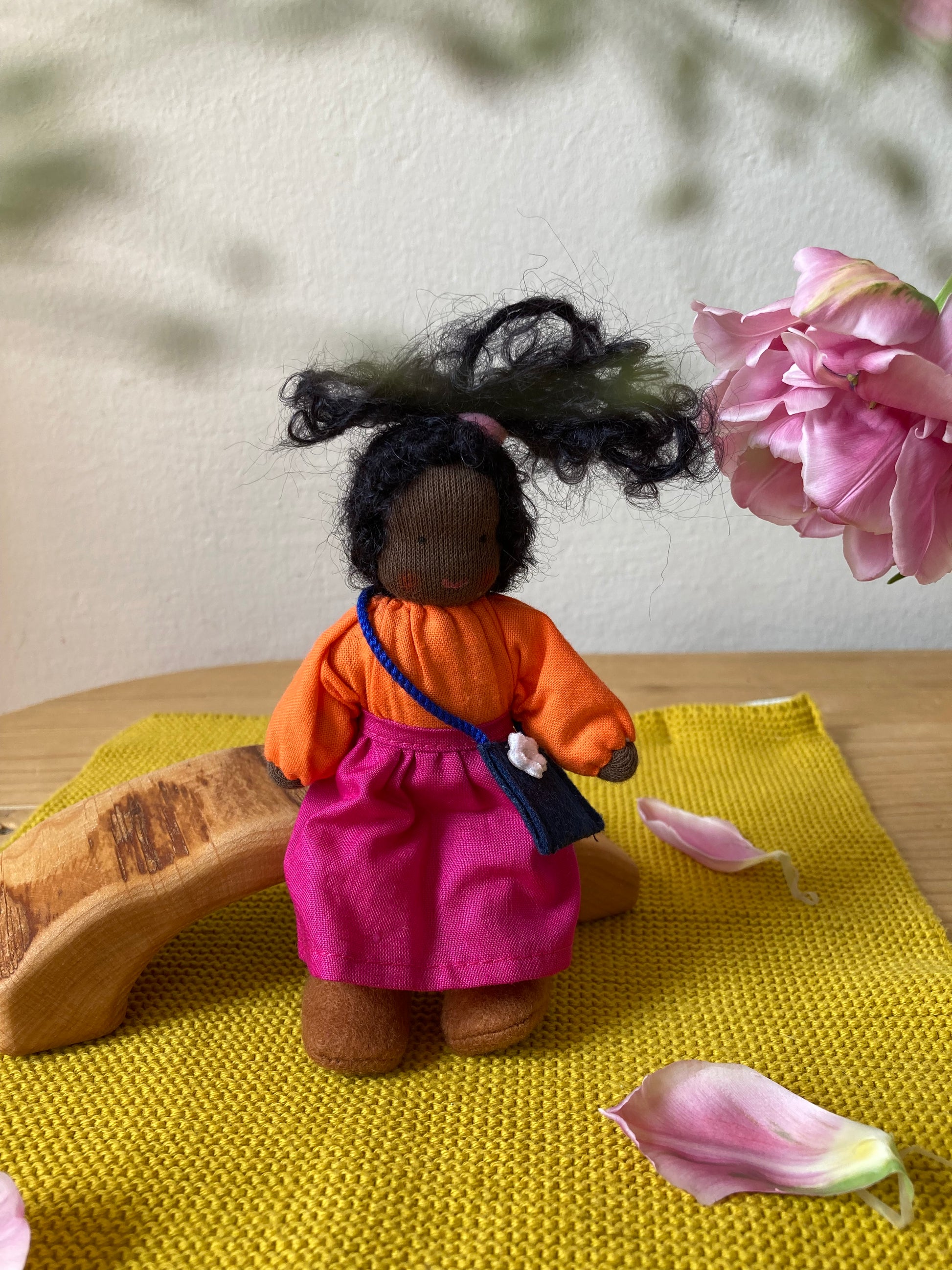 Stoffe: Baumwollstoff, gefüllt mit weicher Polyesterwolle. Durch einen eingenähten Draht können Arme und Beine bewegt werden. Sollten Sie die Püppchen waschen müssen: Unsere Püppchen bevorzugen schonende Handwäsche. Das Gesichtchen bitte nur vorsichtig waschen. Die Farben vom Gesicht sind wasserfest, sie können aber sehr nachlassen, wenn beim Waschen gerieben wird und auch der Stoff kann aufgerieben werden. Dieses Produkt ist ausgezeichnet mit dem »spiel gut« Siegel.