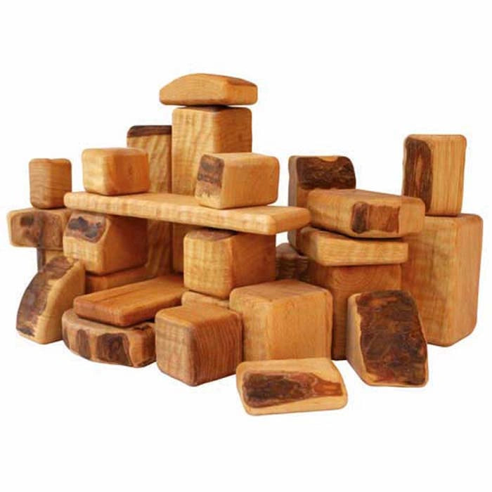 Die Produkte sind aus regionalem Erlenholz gefertigt. Jedes Teil wird individuell geschnitzt, zugesägt und geschliffen, alle Kanten werden abgerundet. Manche Teile verfügen über die Baumborke, die fest am Holz sitzt. Diese gebürsteten Teile trainieren neben den geschliffenen Oberflächen nachhaltig den Tastsinn.