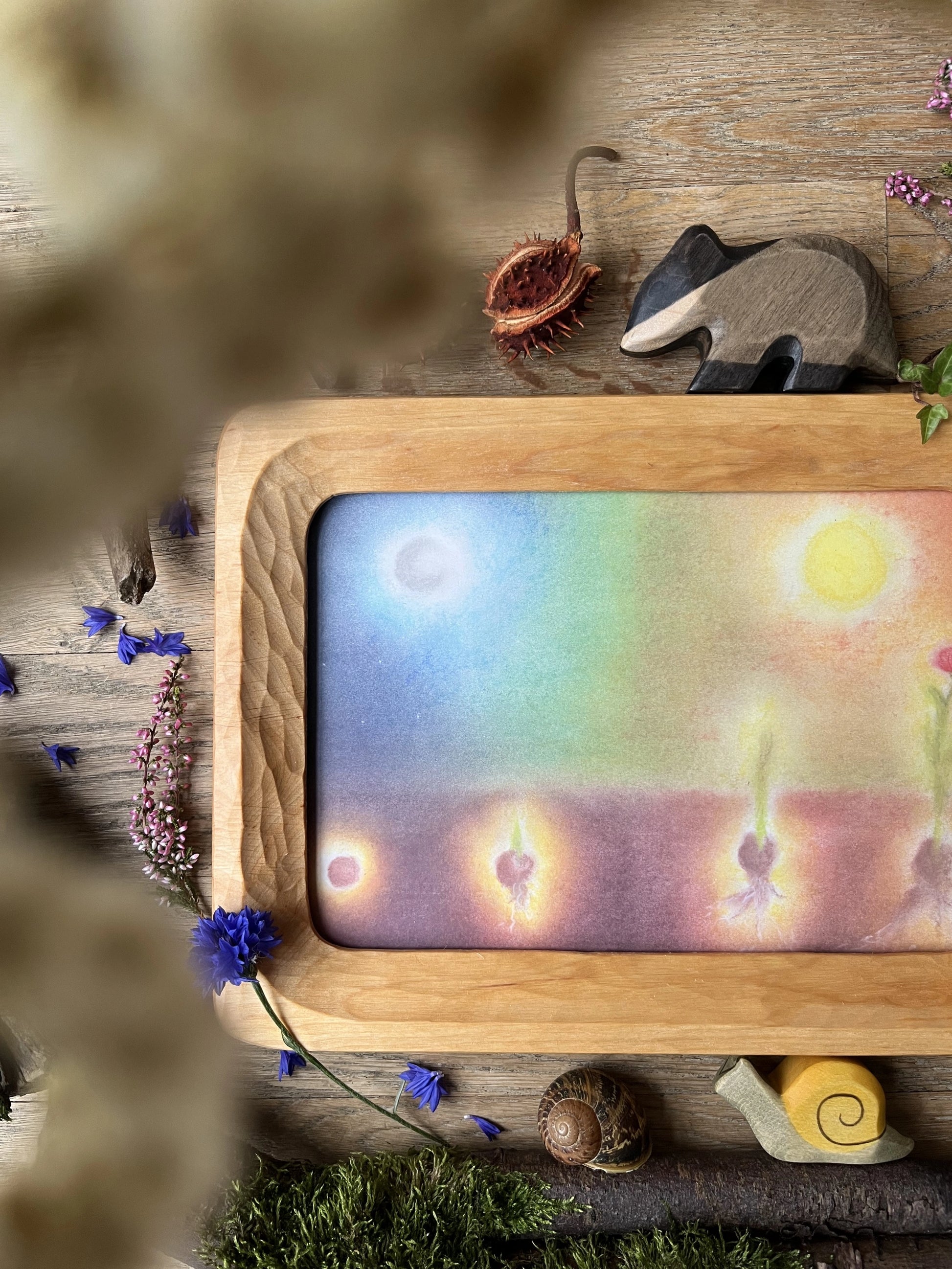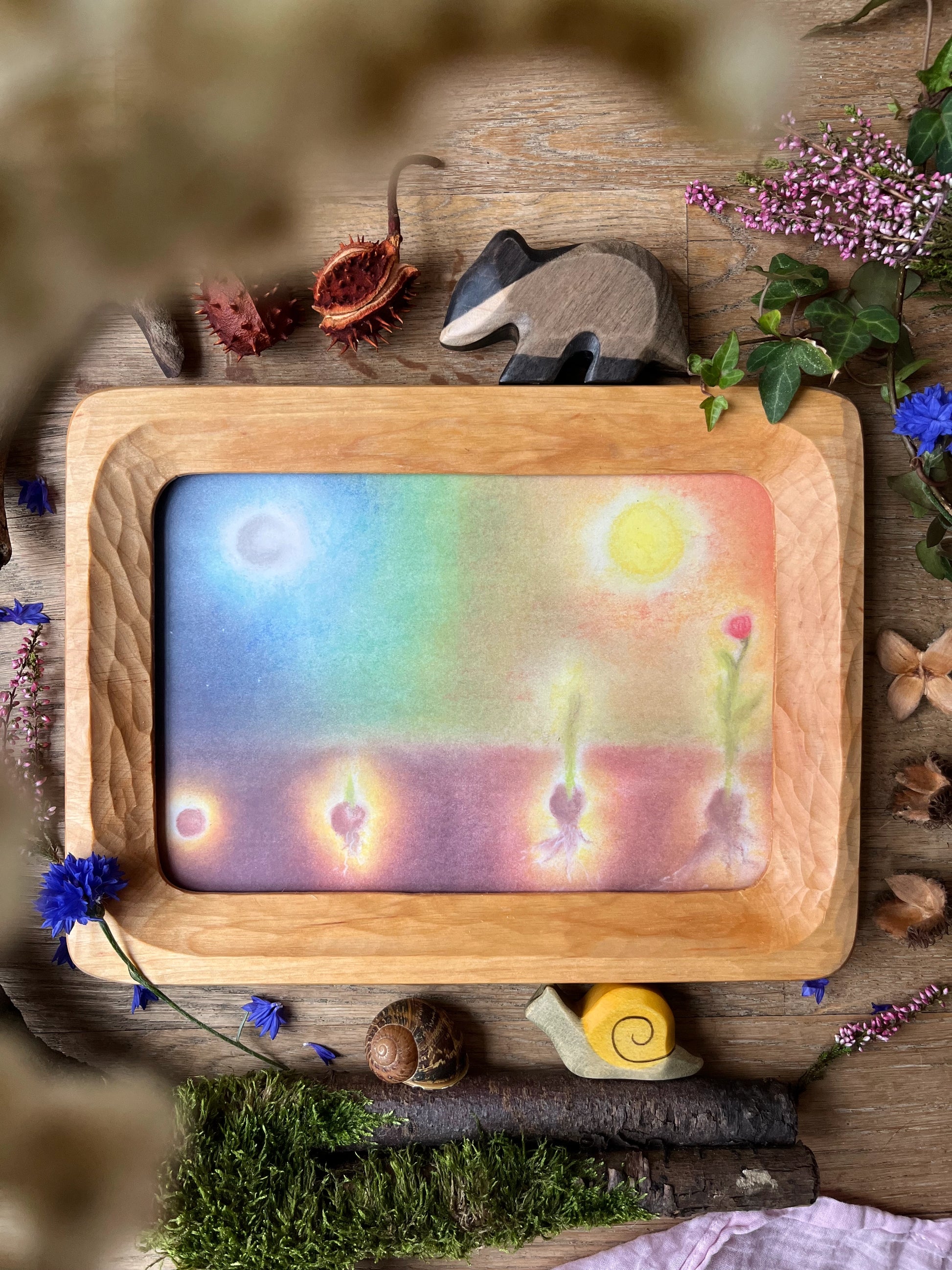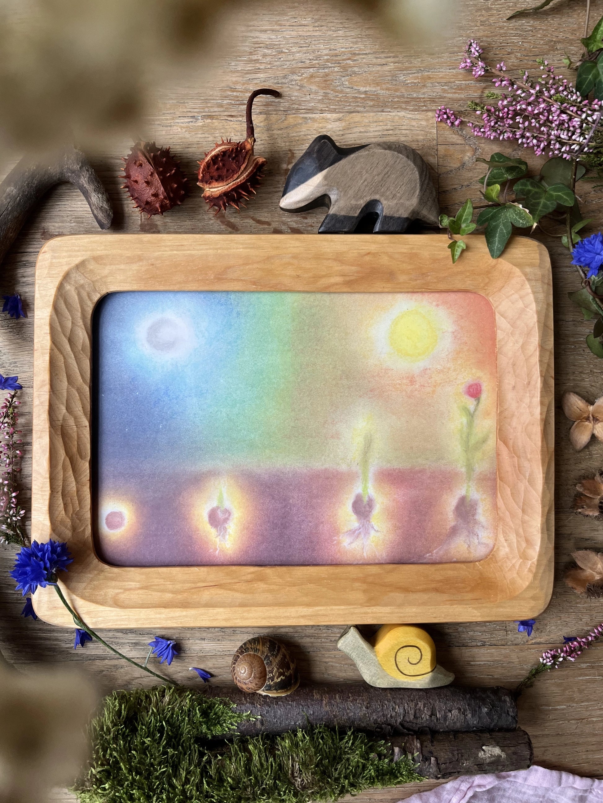 Der Postkarten-Wechselrahmen ist aus geöltem Erlenholz und wurde in liebevoller Handarbeit hergestellt. Dieser Rahmen hat die Möglichkeit, dass man ihn hinhängen kann.