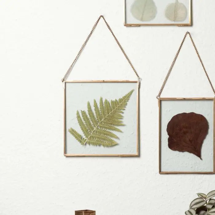 Dieser wunderschöne Bilderrahmen aus Eisen und Glas ist die ideale Wahl, um deine gepressten Blätter, Blüten, Lieblingsfotos, Skizzen, Collagen, Porträts, Federn oder kleinen Kunstwerke wie Postkarten und Aquarelle zu präsentieren. Der Glasrahmen mit seinem transparenten doppelseitigen Design ermöglicht es Dir, zwei Bilder hintereinander zu platzieren und aufzuhängen. Mit der goldenen Metallkette lässt sich der Rahmen leicht an die Wand hängen.