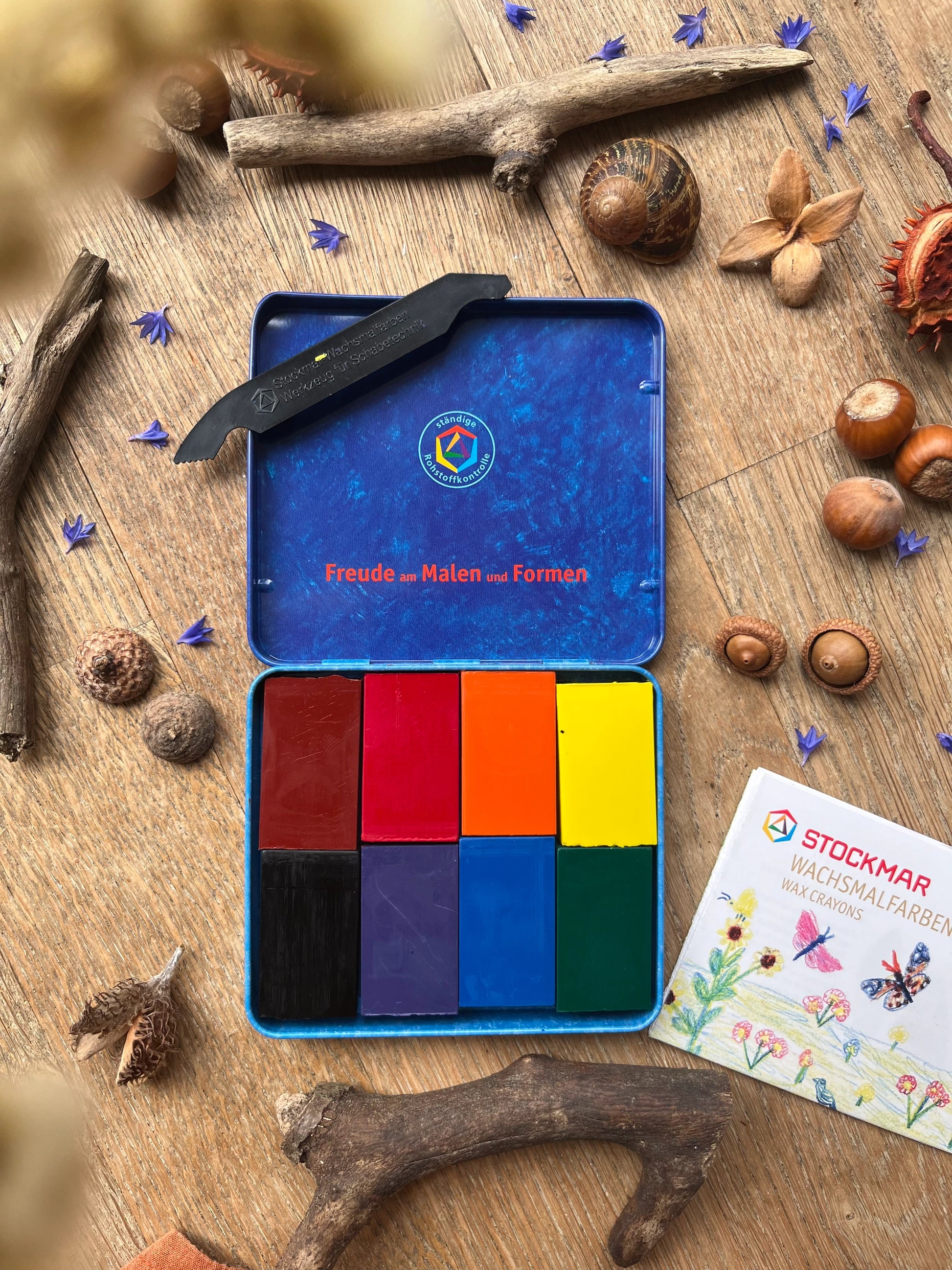 Stockmar Wachsmalfarben kennt jeder. Kein Wunder, denn sie erfüllen höchste pädagogische, ästhetische und künstlerische Ansprüche. Formschön, appetitlich verpackt und angenehm nach Bienenwachs duftend, sprechen Stockmar Wachsmalstifte die kindlichen Sinne an. Wie die Farben leuchten, und was man damit alles machen kann! Zeichnen, malen, Farbe satt auftragen, schichten, Farbe wieder freikratzen, Farben schmelzen: Stockmar Wachsmalstifte versprechen jahrelang reinste Malfreuden. Hervorragende Maleigenschaften (nichts krümelt, klebt, schmiert o.ä.), gesundheitliche Unbedenklichkeit und ein kunstpädagogisch durchdachtes Konzept machen Stockmar Wachsmalstifte zur Nummer eins.