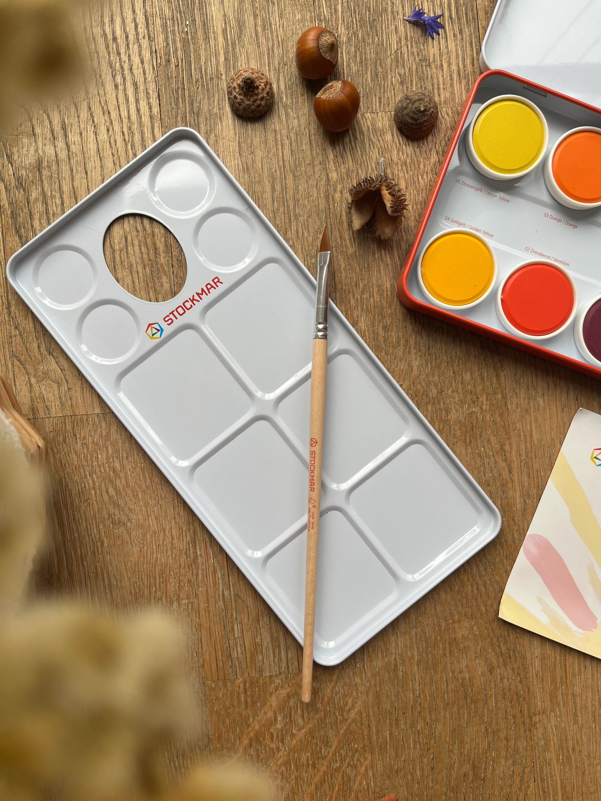 Der Stockmar Deckfarbkasten - ein Produkt in bewährter Stockmar Künstlerqualität. Der kunstvoll gestaltete Farbkasten, ganz klassisch aus Metall, enthält 12 wasservermalbare Farben in leicht herausnehmbaren Farbnäpfchen. Die Stockmar Mischpalette kann, da sie nicht fest in den Kasten integriert ist, dort auf dem Malarbeitsplatz abgelegt werden, wo sie gerade benötigt wird, und ist natürlich auch einfacher zu reinigen als ein als Palette genutzter Farbkastendeckel. Darüber hinaus enthält der Stockmar Deckfarbkasten eine Tube Deckweiß und einen hochwertigen, formstabilen Katzenzungenpinsel aus Ponex-Kunsthaar, von der traditionsreichen Pinselmanufaktur Zahn für Stockmar hergestellt.