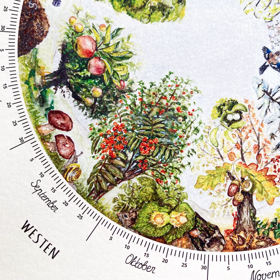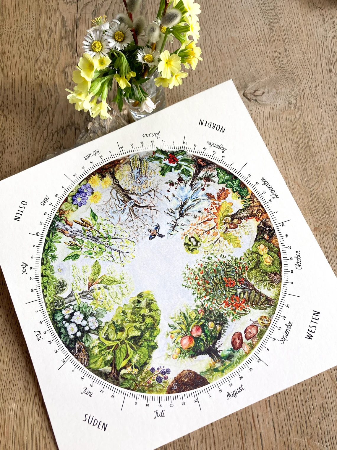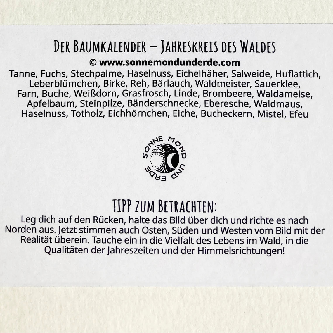 Stell dir vor, du liegst im weichen Moos mitten im Wald und blickst hinauf zu den Baumkronen. Bei einem solchen Waldbad ist die Idee zu diesem Baumkalender entstanden. Für alle, die den Wald lieben, die gerne eintauchen in seine Düfte und in das frühlingshafte Vogelgezwitscher, ... für alle, die mit Shinrin Yoku Erholung, Ruhe und Heilung finden, ist diese Karte ein wunderbares Geschenk. Der Jahreskreis des Waldes bietet die Möglichkeit für eine kleine Auszeit mitten in der alltäglichen Hektik: Waldbaden light sozusagen, wenn gerade mal keine Zeit ist, um tatsächlich in den Wald zu gehen. Leg dich einfach auf den Rücken, betrachte die Karte über dir und geh auf Entdeckungsreise: Welche Bäume sind es, die ein schützendes Dach über deinem Kopf bilden? Was wächst da alles auf dem Waldboden? Wie viele Tiere findest du versteckt unter den Büschen und hinter den Bäumen? Den Baumkalender habe ich mit vielen liebevollen Details von Hand mit leuchtenden Aquarellfarben gemalt und mich dabei von der Natur rings um unseren Hof, aber auch von Montessori und Waldorf inspirieren lassen. Vor allem Kinder lieben es, anhand bunter Bilder spielerisch die Jahreszeiten zu erkunden.
