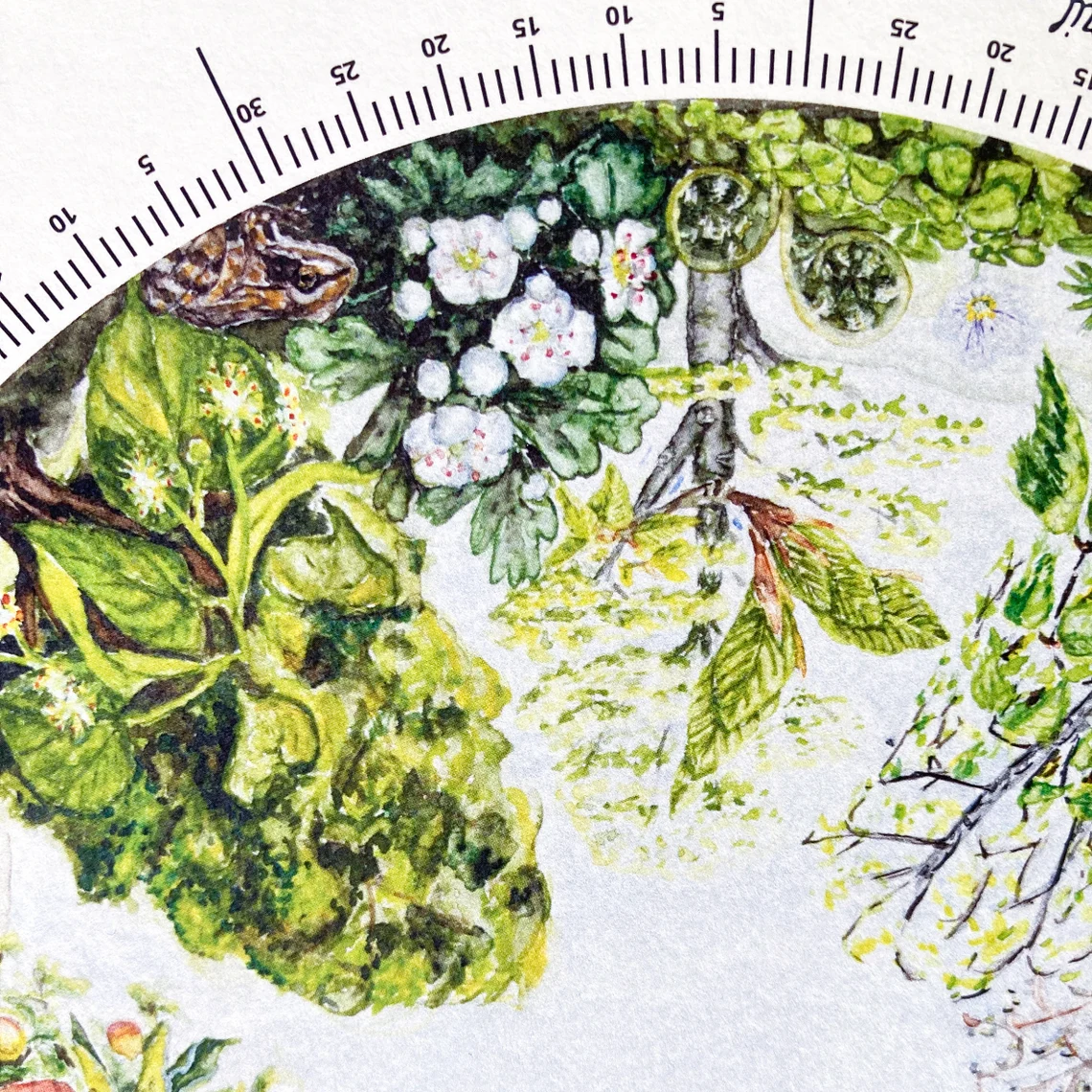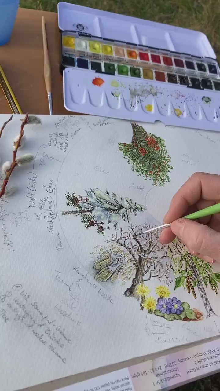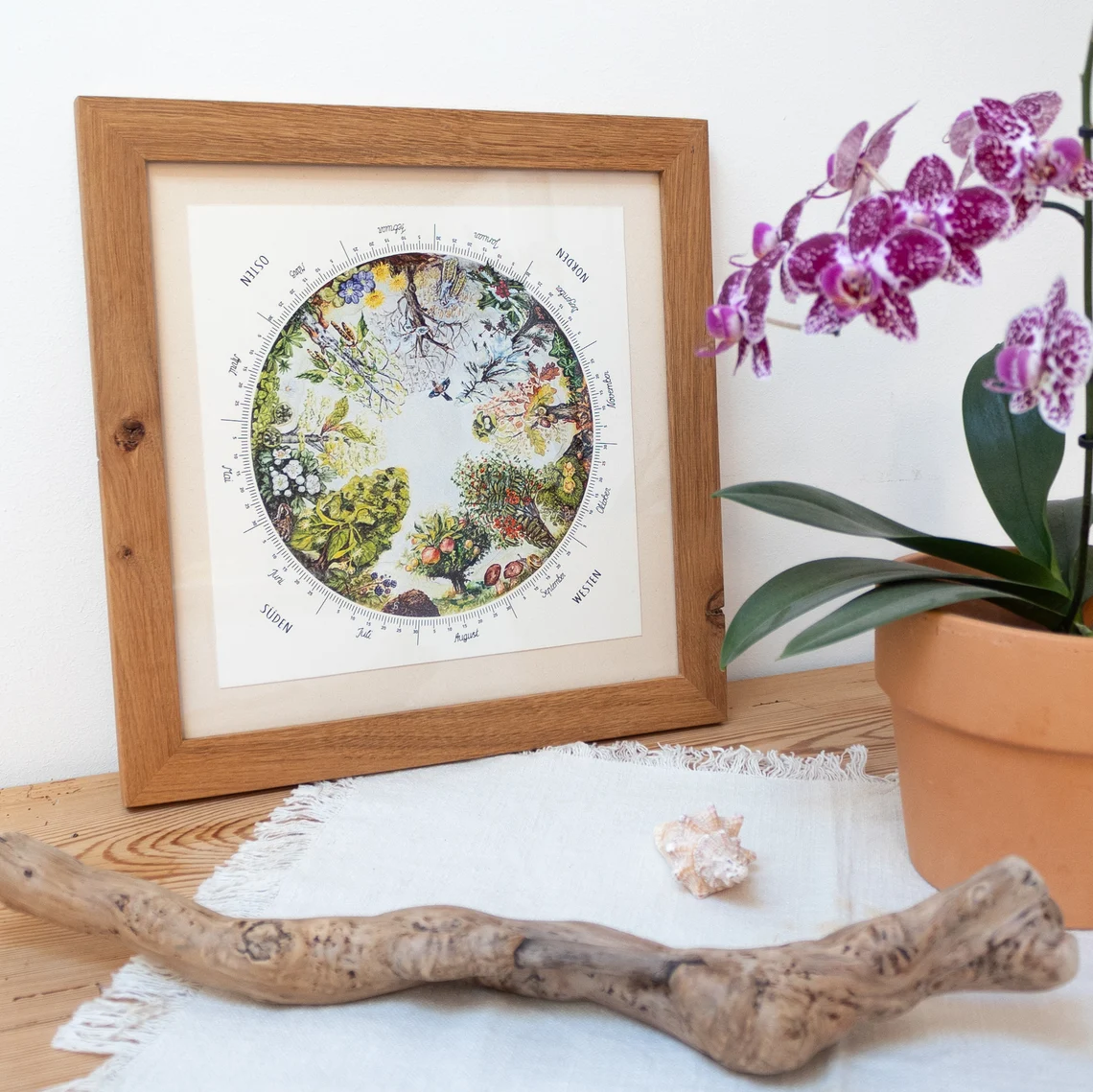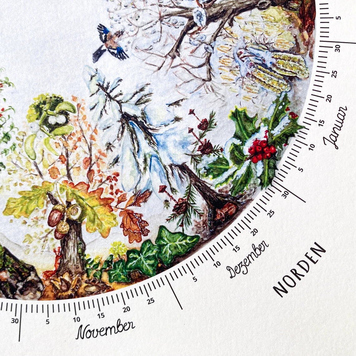 Stell dir vor, du liegst im weichen Moos mitten im Wald und blickst hinauf zu den Baumkronen. Bei einem solchen Waldbad ist die Idee zu diesem Baumkalender entstanden. Für alle, die den Wald lieben, die gerne eintauchen in seine Düfte und in das frühlingshafte Vogelgezwitscher, ... für alle, die mit Shinrin Yoku Erholung, Ruhe und Heilung finden, ist diese Karte ein wunderbares Geschenk. Der Jahreskreis des Waldes bietet die Möglichkeit für eine kleine Auszeit mitten in der alltäglichen Hektik: Waldbaden light sozusagen, wenn gerade mal keine Zeit ist, um tatsächlich in den Wald zu gehen. Leg dich einfach auf den Rücken, betrachte die Karte über dir und geh auf Entdeckungsreise: Welche Bäume sind es, die ein schützendes Dach über deinem Kopf bilden? Was wächst da alles auf dem Waldboden? Wie viele Tiere findest du versteckt unter den Büschen und hinter den Bäumen? Den Baumkalender habe ich mit vielen liebevollen Details von Hand mit leuchtenden Aquarellfarben gemalt und mich dabei von der Natur rings um unseren Hof, aber auch von Montessori und Waldorf inspirieren lassen. Vor allem Kinder lieben es, anhand bunter Bilder spielerisch die Jahreszeiten zu erkunden.