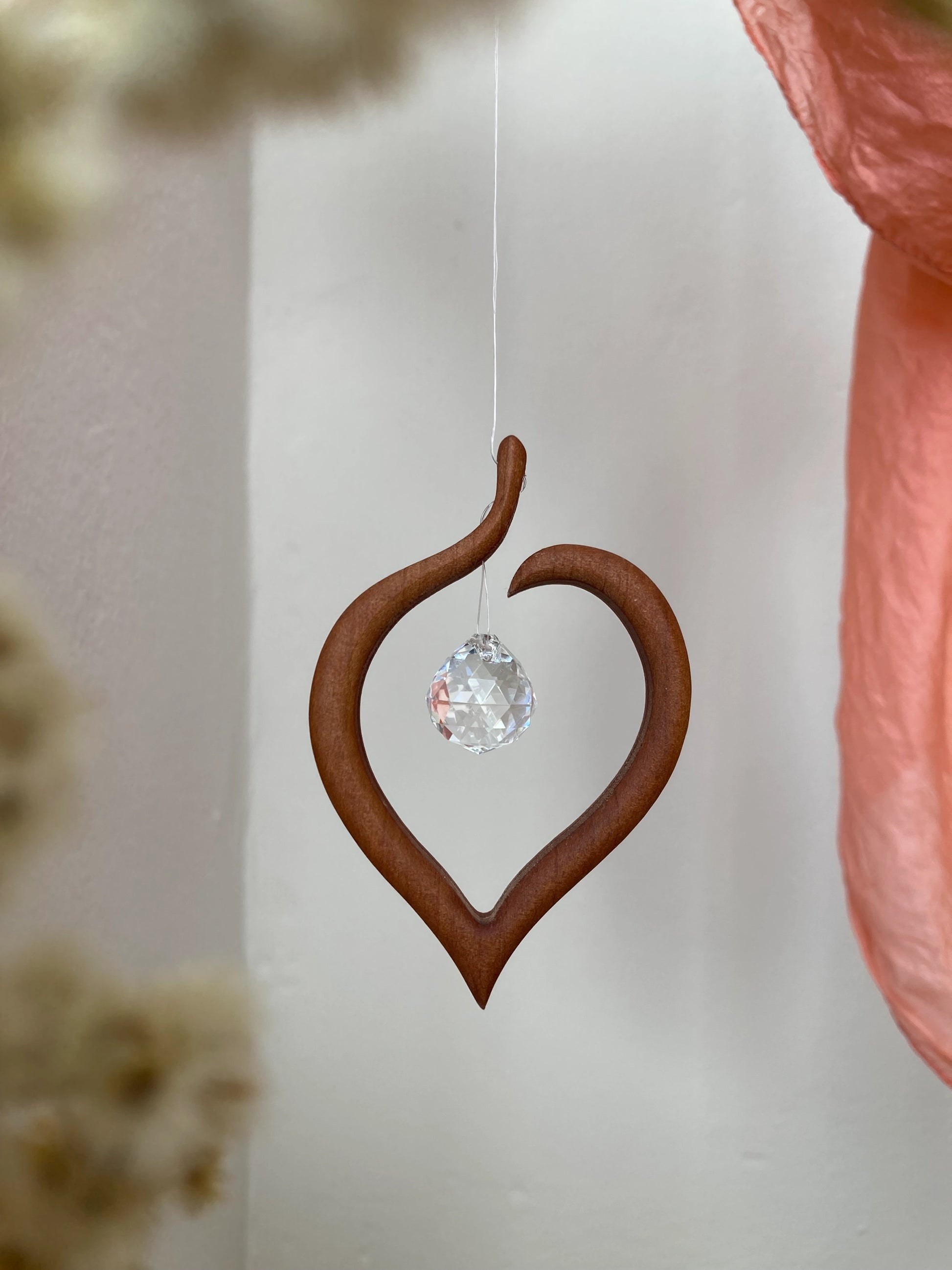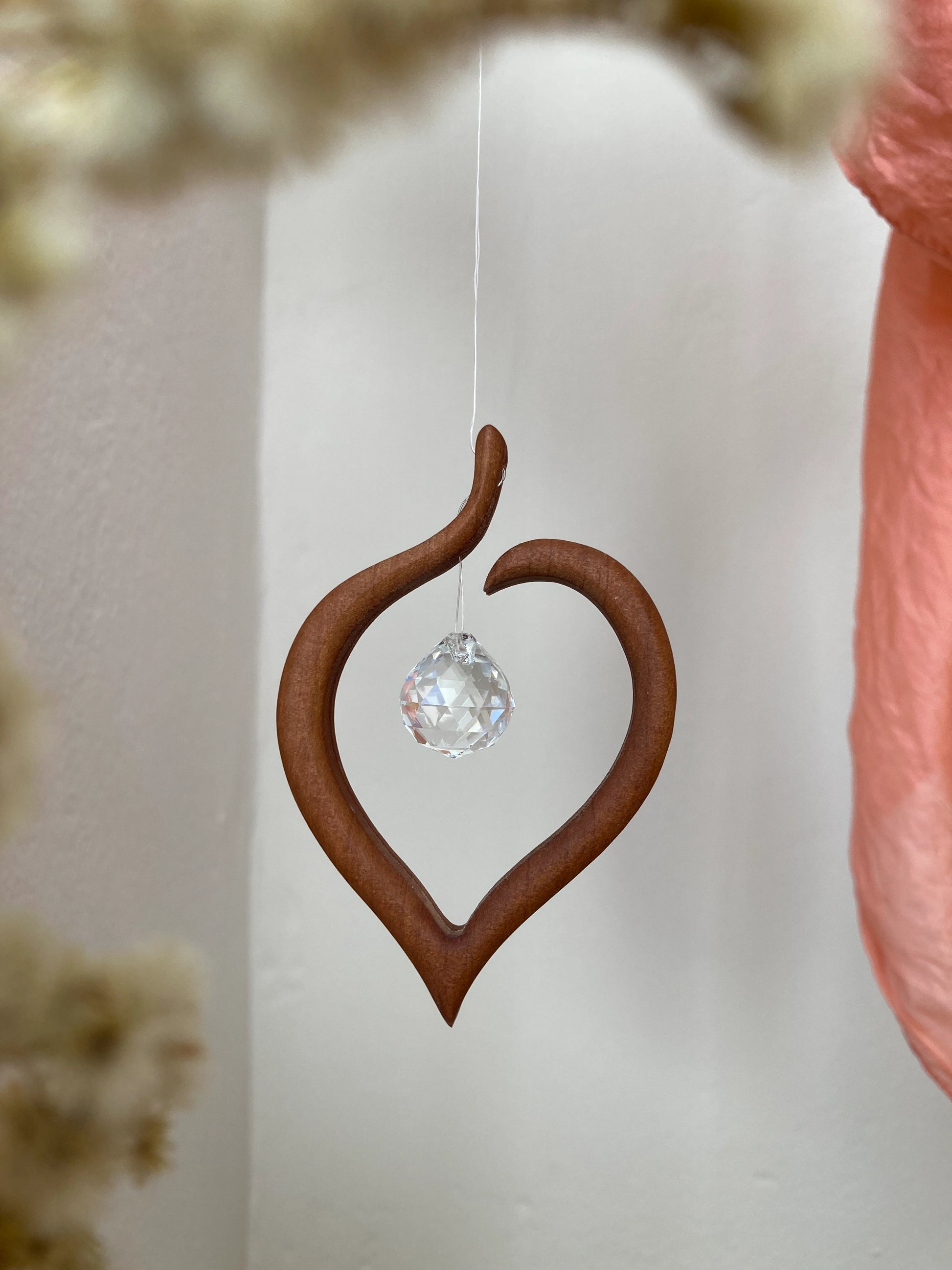Lindenblatt - kleine Kostbarkeit Zart wie der Frühling. Schätze sind zum Erfreuen da. Unsere Schätze sollen nicht in Schubladen verschwinden, sondern im Fenster hängend betrachtet werden. So können sie spielend jeden Tag verschönern. Ein im Fenster hängender Regenbogenkristall bringt mit der Brechung des Lichts positive Energie in den Raum. Die handwerklich gefertigten Naturholzobjekte aus Birnbaum oder Kirschbaum bilden dafür eine hervorragende Basis. Mit den funkelnden Akzenten aus feinsten geschliffenen Glaskristallen ist der Fensterschmuck perfekt.