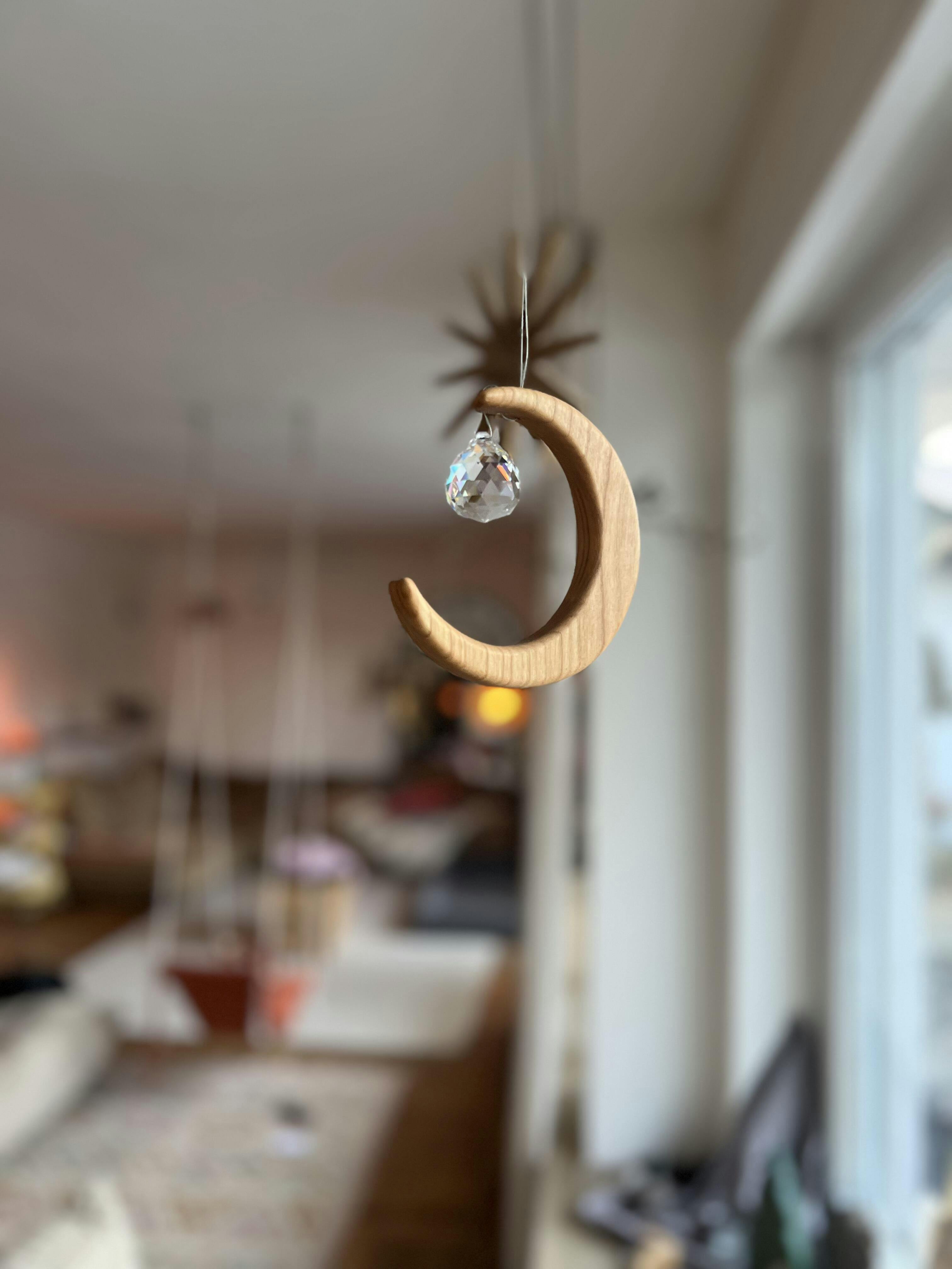 Mond - Trabant der Erde, Wächter der hellen Nacht. Am Himmel sind die verschiedensten Objekte zu finden. Das geht weit über die klassischen Sonne-, Mond- und Sterne-Gedanken hinaus. Auch Engel lassen sich am Himmel verorten. Lassen Sie sich von den himmlischen Kräften verzaubern. Ein im Fenster hängender Regenbogenkristall bringt mit der Brechung des Lichts positive Energie in den Raum. Die handwerklich gefertigten Naturholzobjekte aus Birnbaum oder Kirschbaum bilden dafür eine hervorragende Basis. Mit den funkelnden Akzenten aus feinsten geschliffenen Glaskristallen ist der Fensterschmuck perfekt.