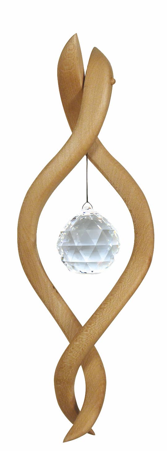 Naga - Urtümliche Schlangengöttin. Voller Kraft und doch zart in der Umarmung. Stilistischer Fensterschmuck. Stilistische Figuren finden ihre Inspiration meist in der Natur. Sie erinnern uns an Objekte, die wir schon einmal gesehen haben. Durch die angeregte Fantasie können die unterschiedlichsten Bilder entstehen. Unsere Fensterdekorationen lassen den Raum regelrecht erstrahlen. Auch in der jahrtausendalten chinesischen Lehre des Feng Shui spielen Kristalle eine zentrale Rolle. Ein im Fenster hängender Regenbogenkristall bringt mit der Brechung des Lichts positive Energie in den Raum. Die handwerklich gefertigten Naturholzobjekte aus Birnbaum oder Kirschbaum bilden dafür eine hervorragende Basis. Mit den funkelnden Akzenten aus feinsten geschliffenen Glaskristallen ist der Fensterschmuck perfekt.