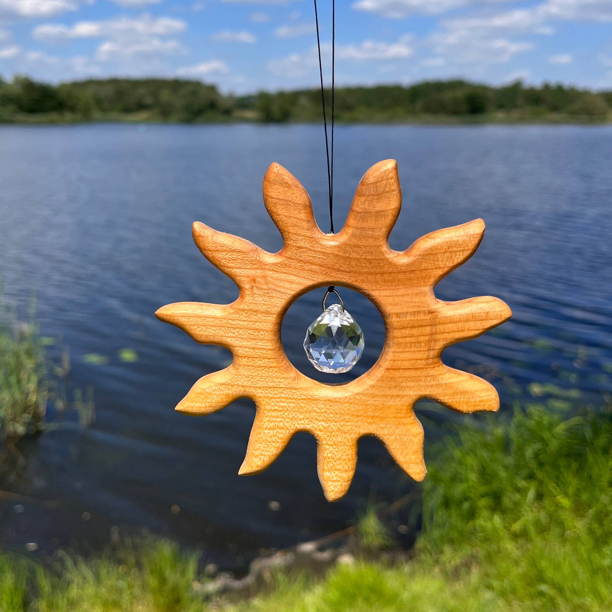 Sonne - Mutter aller Sterne, Spenderin ewiger Energie. Am Himmel sind die verschiedensten Objekte zu finden. Das geht weit über die klassischen Sonne-, Mond- und Sterne-Gedanken hinaus. Auch Engel lassen sich am Himmel verorten. Ein im Fenster hängender Regenbogenkristall bringt mit der Brechung des Lichts positive Energie in den Raum. Die handwerklich gefertigten Naturholzobjekte aus Birnbaum oder Kirschbaum bilden dafür eine hervorragende Basis. Mit den funkelnden Akzenten aus feinsten geschliffenen Glaskristallen ist der Fensterschmuck perfekt.