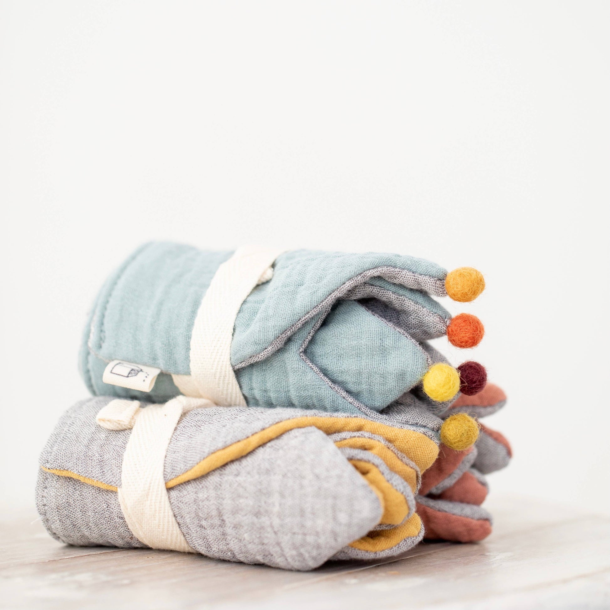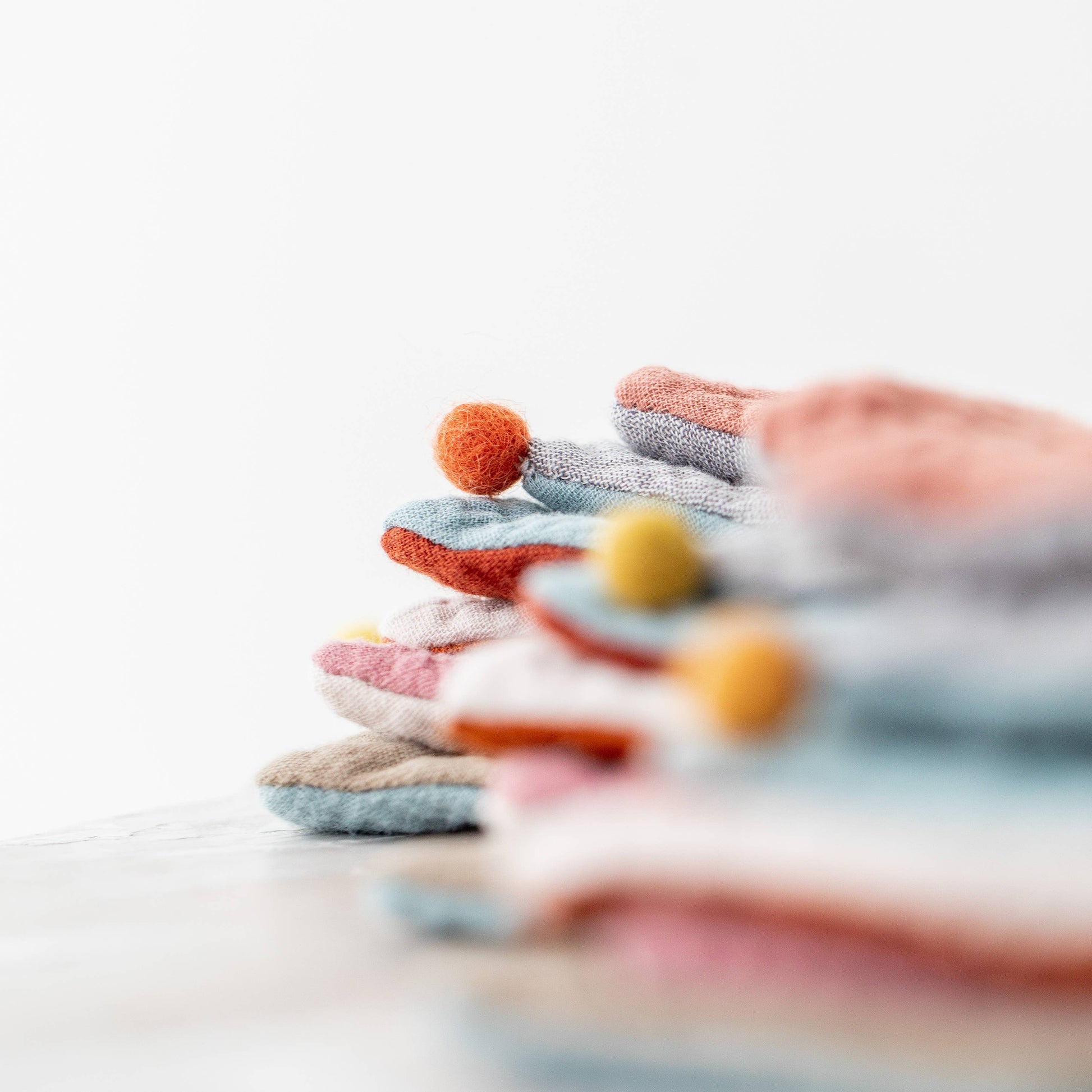 MATERIALIEN: · GOTS-zertifizierter Bio-Baumwollstoff · Füllung aus 50 % Baumwolle und 50 % Bambus · Baumwollband · Handgefertigte Filzkugeln