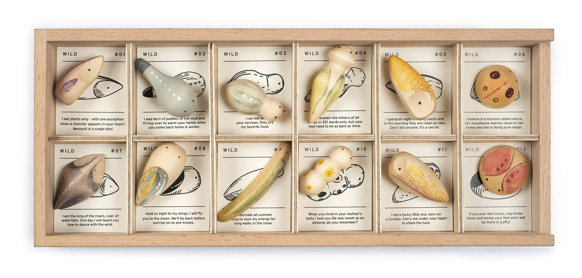 "Wild" ist eine Sammlung von 12 Kreaturen aus der Tierwelt. An der Grenze zwischen Fantasie und Realität hat jede ihre eigene Superkraft und Geschichte, die auf ihrer Karte als Einladung zum Spielen geschrieben steht. Das Sortiertablett dient zur Aufbewahrung und zum Sammeln, kann aber auch eine perfekte Ergänzung zu jeder offenen Spielaktivität sein.