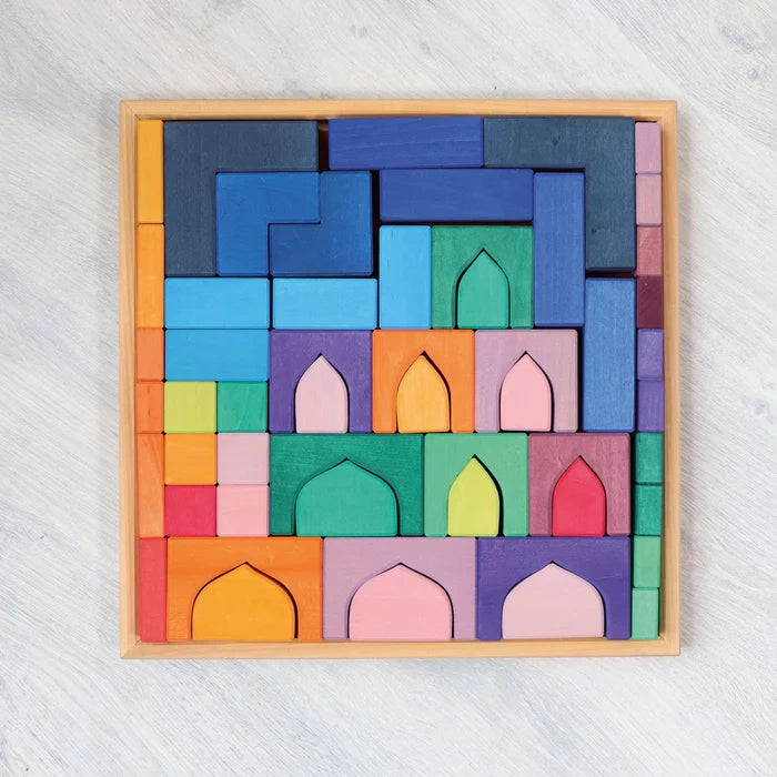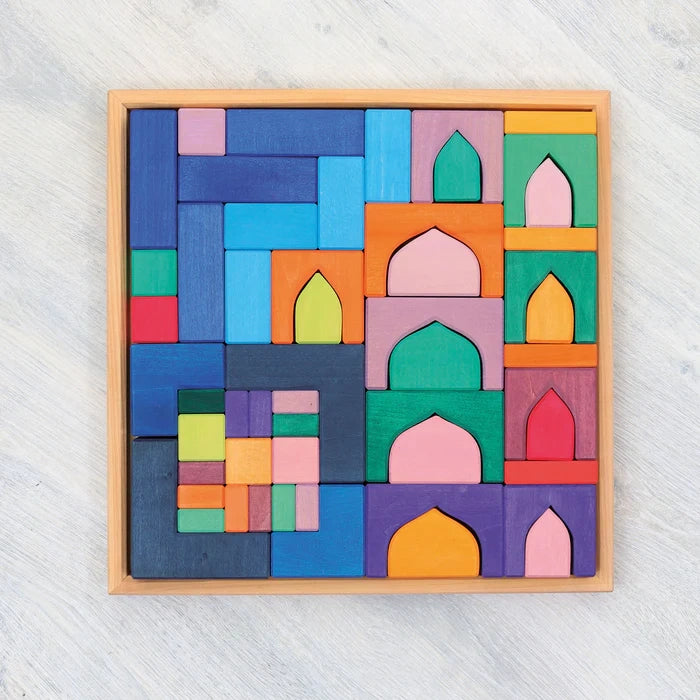 Mit diesem Bauset entstehen Welten wie aus 1001 Nacht. Schon die Kleinsten werden durch die intensive Farb- und Formensprache angesprochen. Je grösser die Kinder sind, umso fantasievoller und detaillierter werden die orientalischen Paläste - wunderbar zu kombinieren zum Beispiel mit Glassteinen, Seidentüchern, Sand und Püppchen. Beim Bauen und Spielen werden ganz nebenbei die Feinmotorik und das räumliche Denken der Kinder geschult.