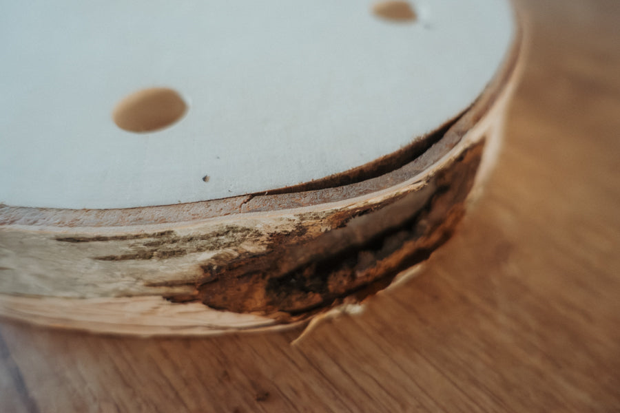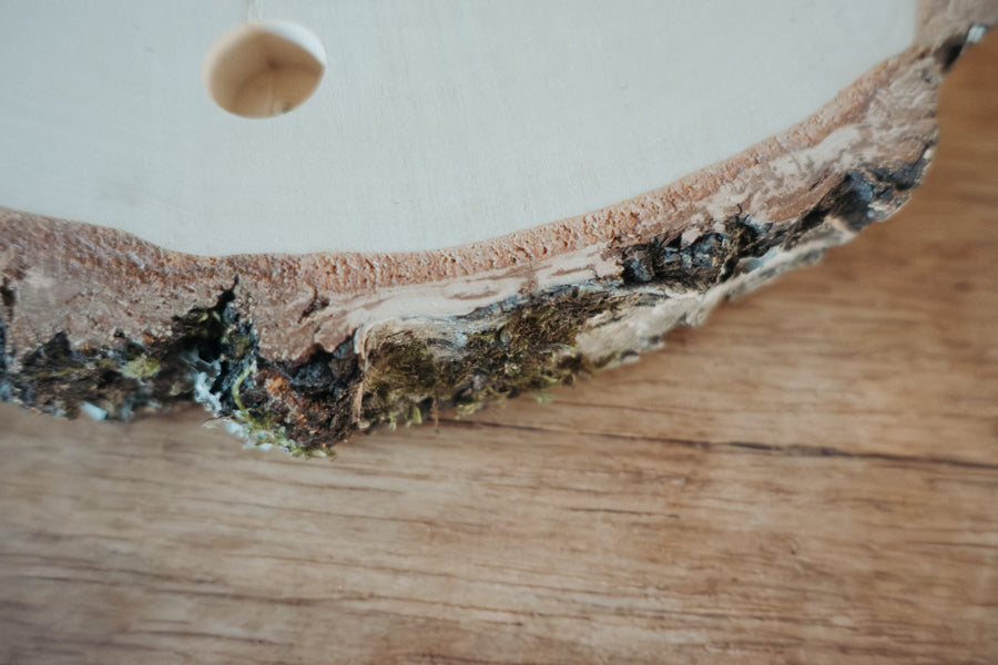 Form & Rinde: Die Scheibe ist nicht immer perfekt rund, kann an einer Seite schmaler ausfallen, Moos oder andere natürliche Kennzeichnungen aufweisen. Es kann auch mal ein kleines Stück Rinde fehlen.