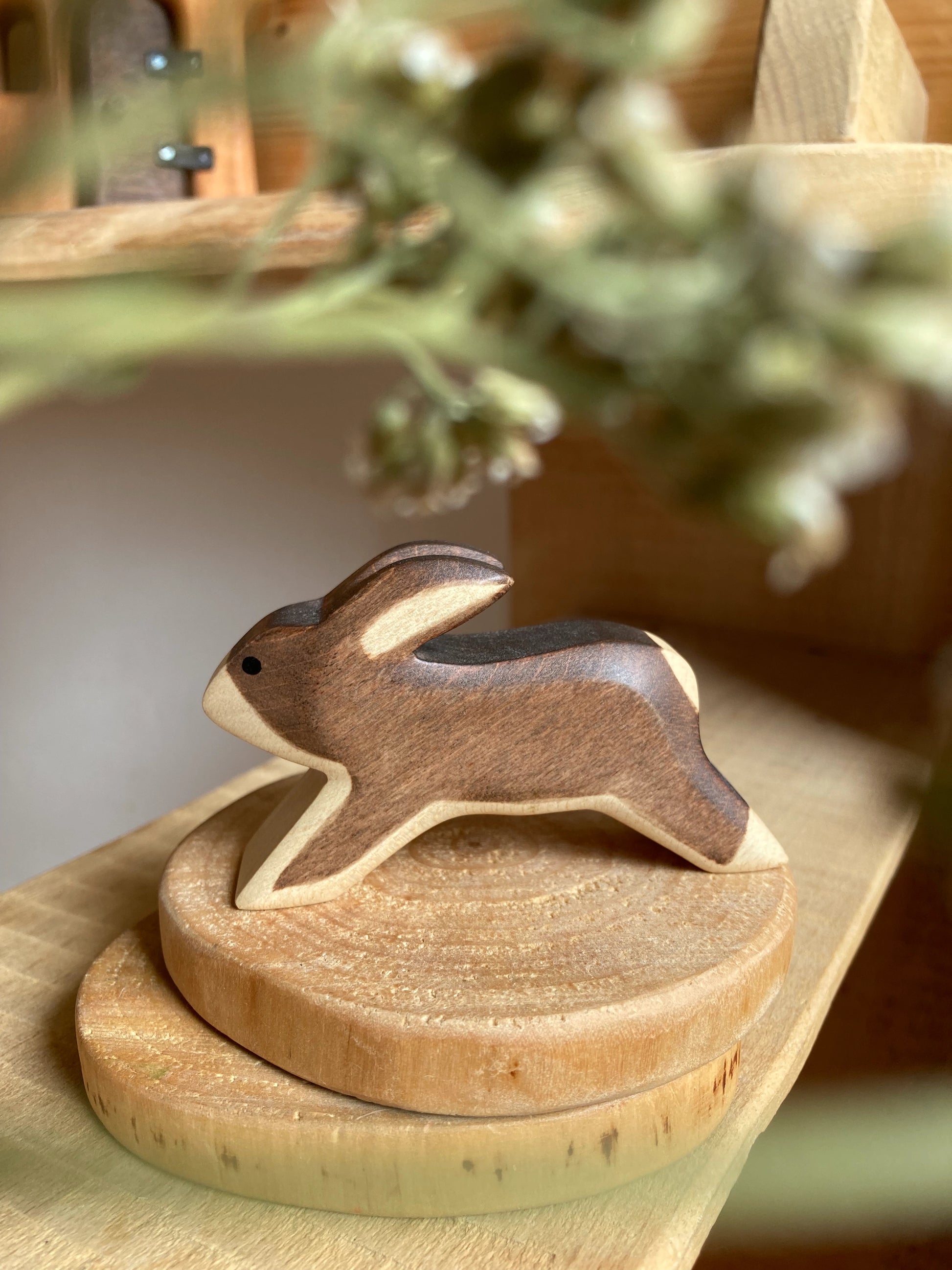 Der niedliche HolzWald Hase hat dunkelbraunes Fell mit einer hellen Unterseite und hellen Hasenohren. Er kann sehr schnelle Haken schlagen und setzt gerade zum Laufen an. Er hoppelt gerne mit den anderen HolzWald Hasen über die Felder oder lässt sich von den Kindern des Bauernhofes mit Karotten füttern.