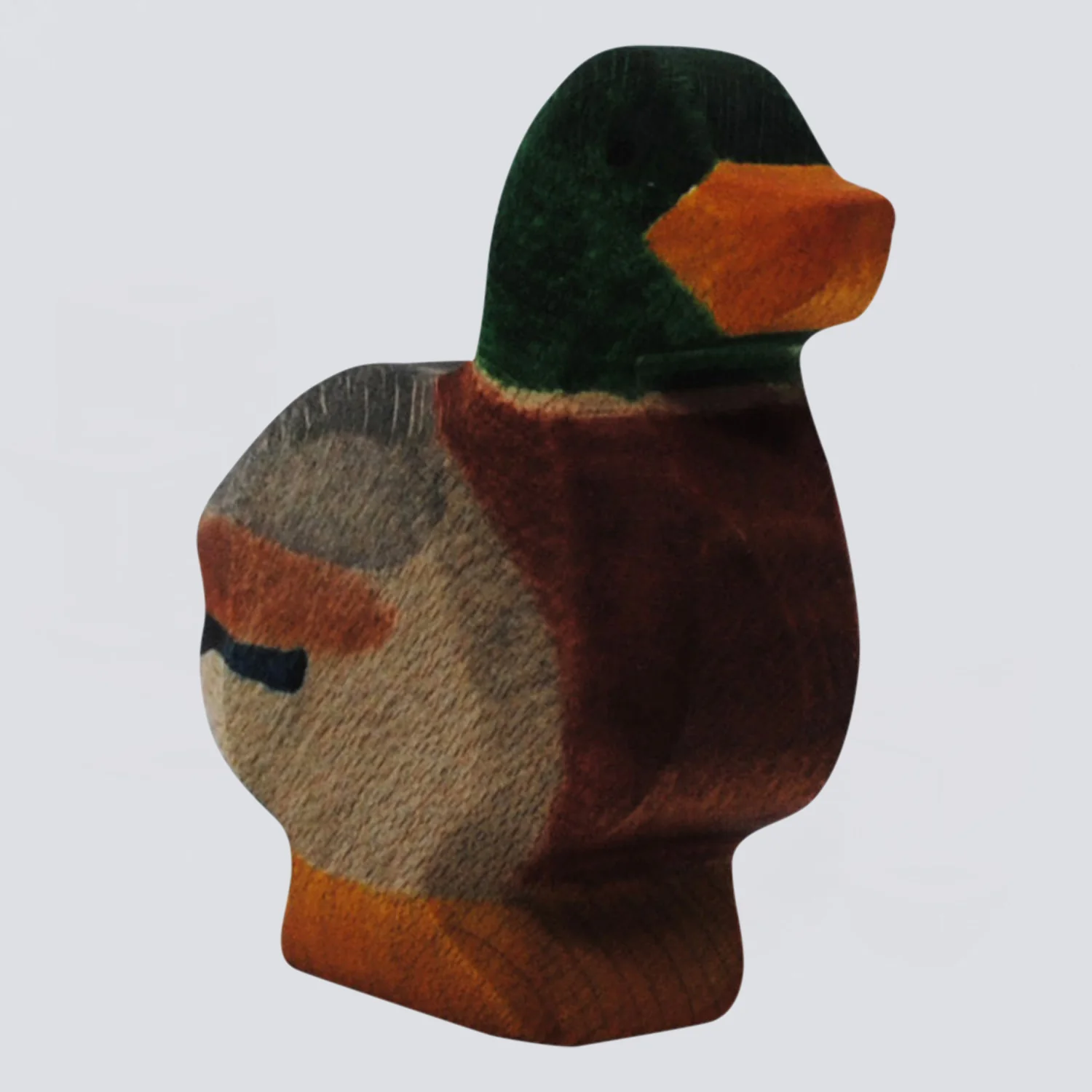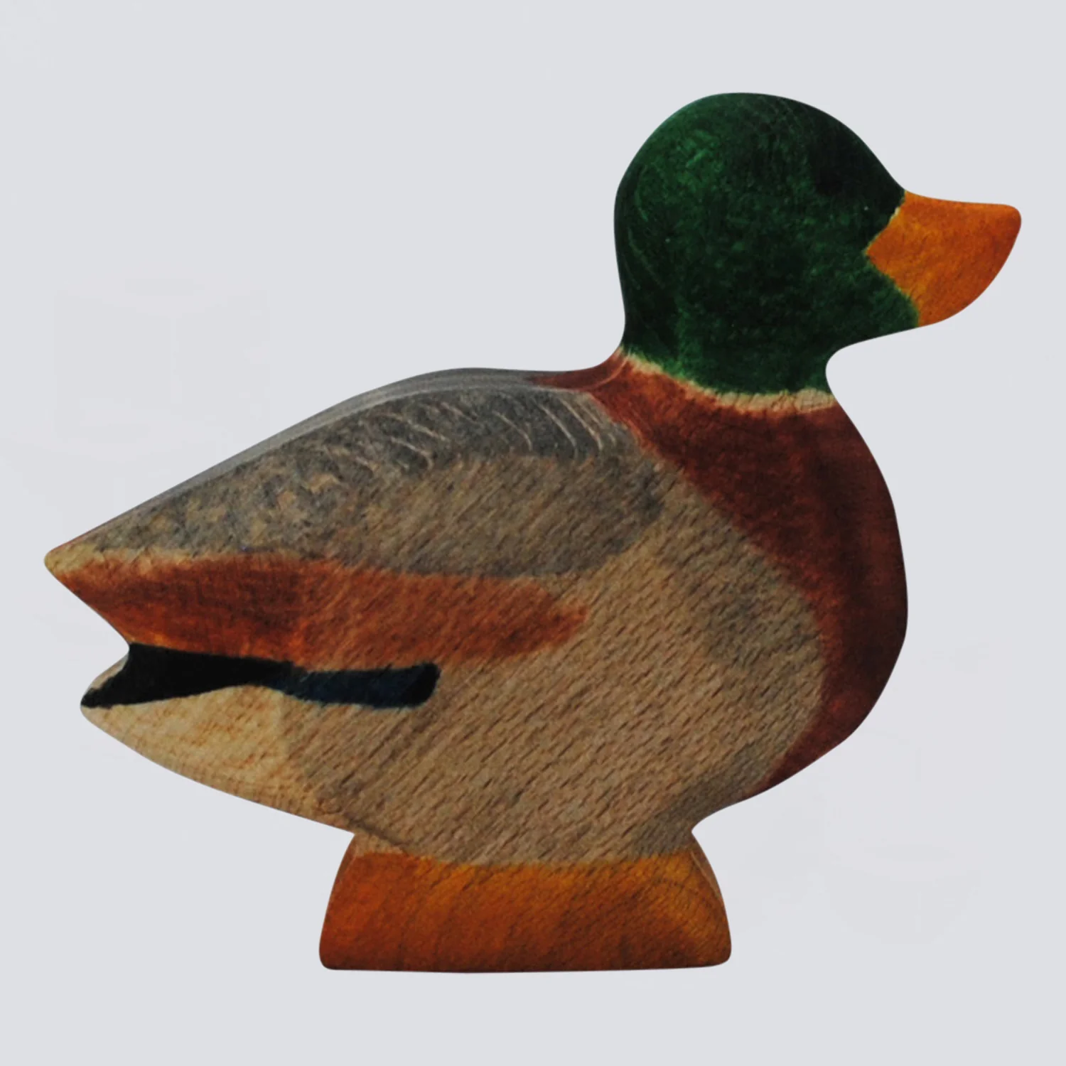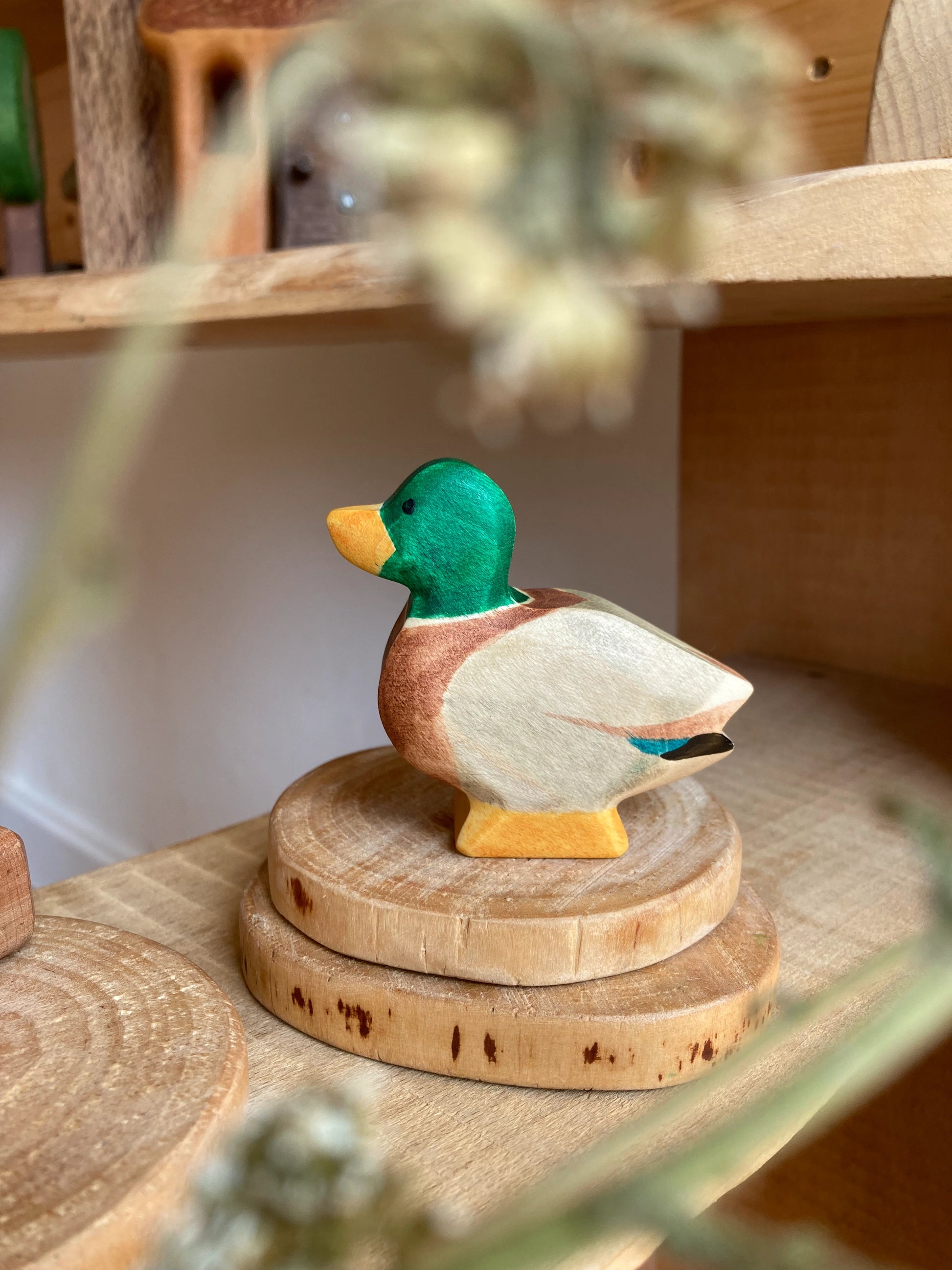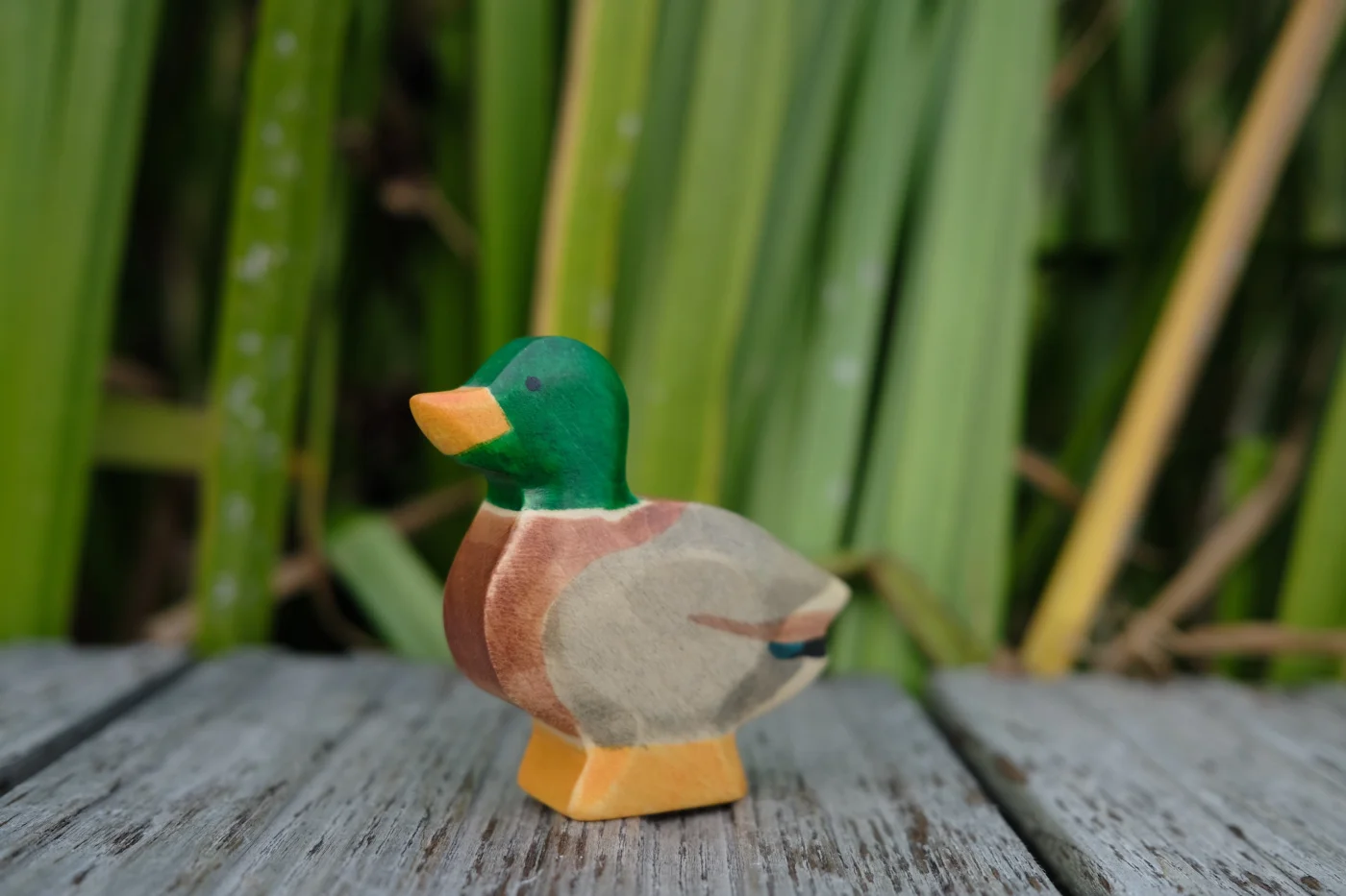Das Federkleid des HolzWald Erpels ist grau-braun, mit einem schillernden grünen Kopf und einem orangefarbenen Schnabel. Auch er kann sehr gut schwimme und weite Strecken zurücklegen.