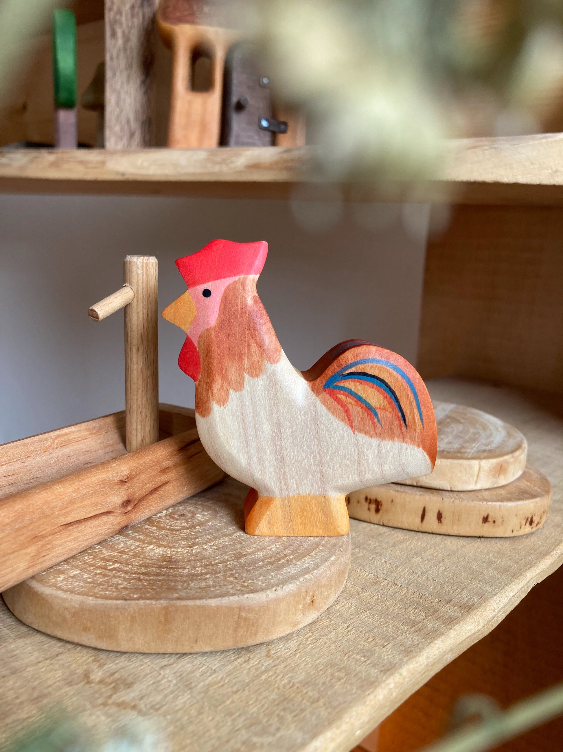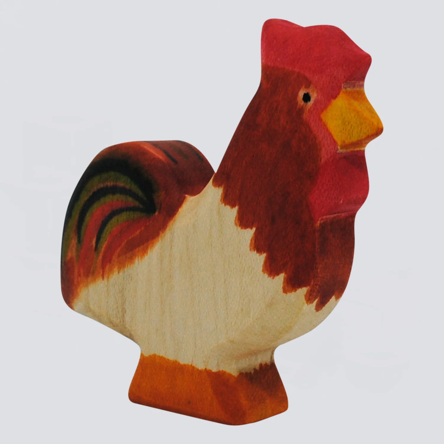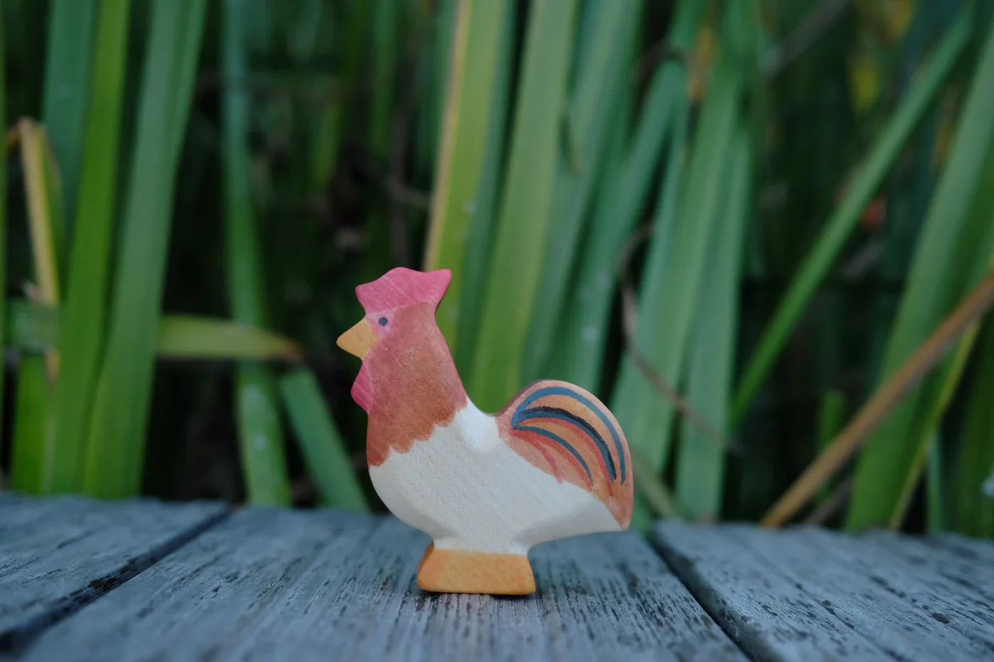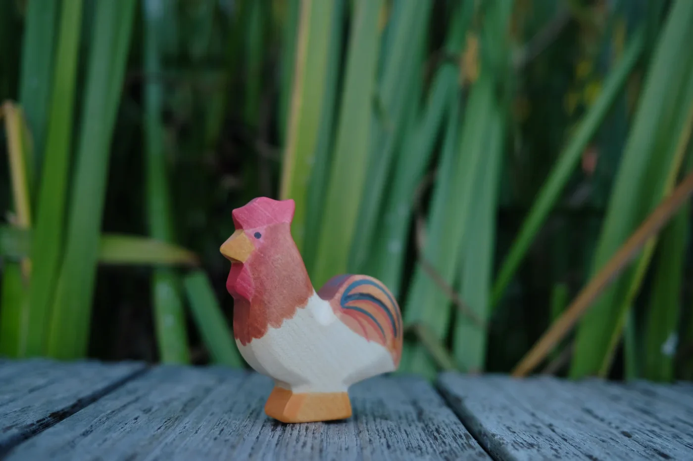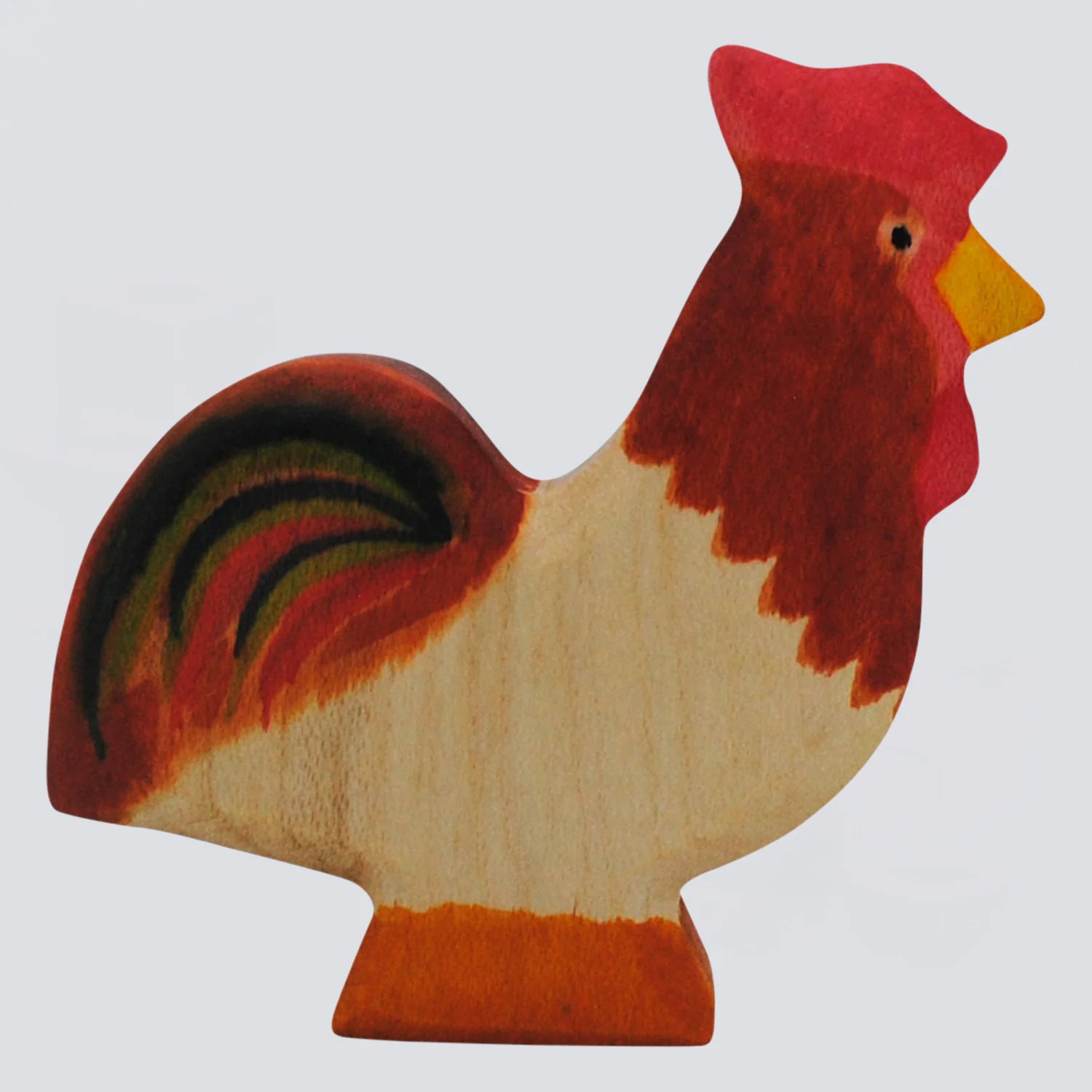 Der HolzWald Hahn präsentiert stolz sein wunderschönes Federkleid, während er auf dem Bauernhof herumspaziert. Er hat einen roten Kamm, einen spitzen orangenen Schnabel und prächtige, bunte Schwanzfedern. Er unternimmt gerne lange Streifzüge über den Bauernhof und trifft sich mit den Hühnern und sucht sich die besten Körner zum Fressen. Frühmorgens lässt sein lautes KIKIRIKI ertönen und weckt damit den ganzen Hof auf.