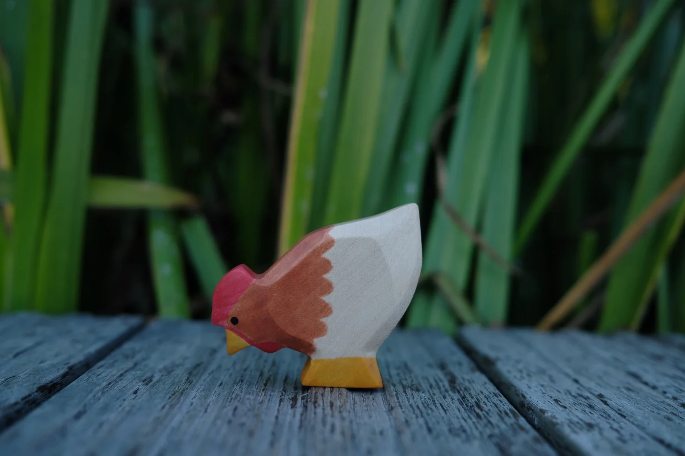 Das HolzWald Huhn hat einen roten Kamm und einen spitzen orangenen Schnabel. Sein Kopf ist nach unten gerichtet, da es sich gerade die leckersten Körner vom Boden pickt. Es lebt auf der Bauernhof und kümmert sich um seine Küken oder gackert mit den anderen Hühnern lauthals um die Wette.