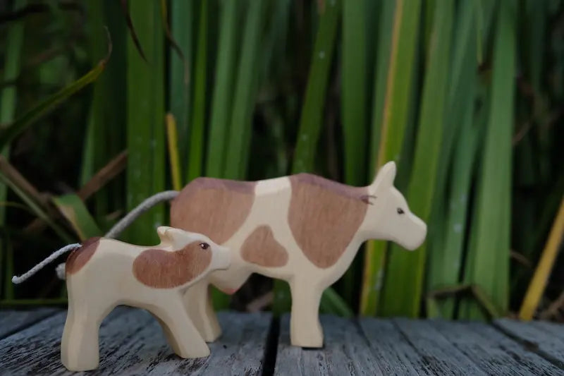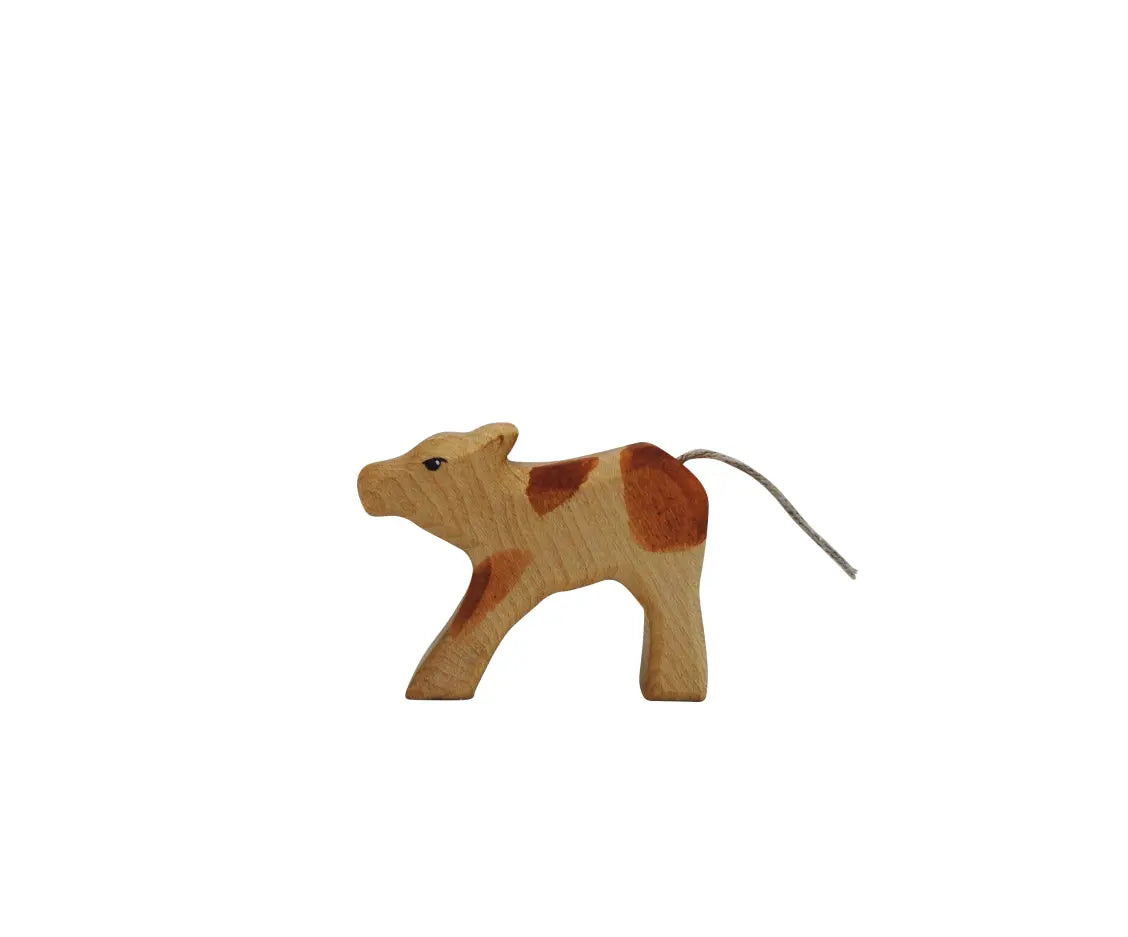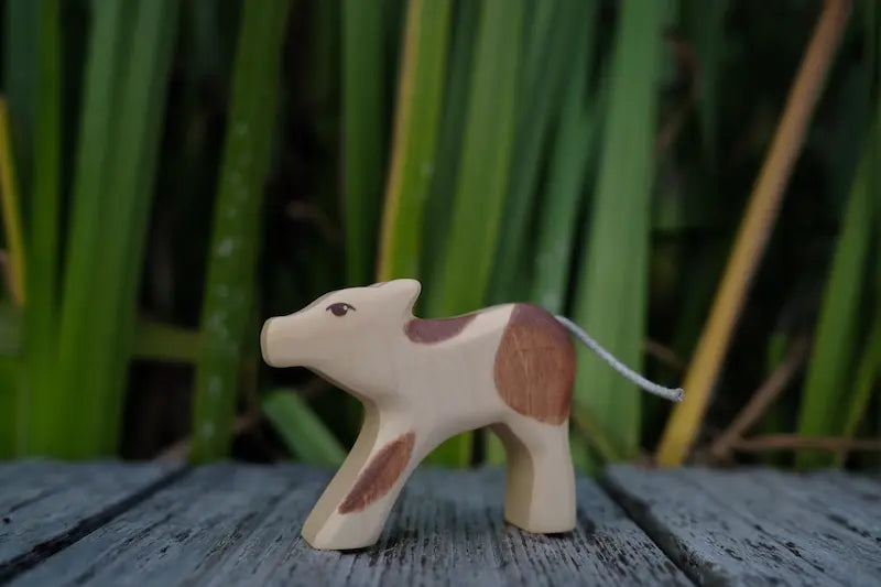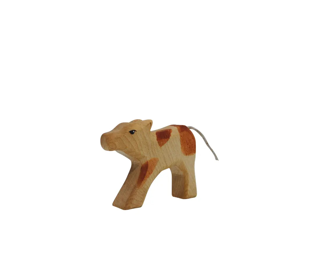 Das niedliche Kälbchen gehört ebenfalls zur HolzWald Kuhfamilie. Es hat die gleichen braunen Flecken wie seine Eltern und hält seinen Kopf etwas gesenkt, um bei seiner Mama zu trinken. Es ist schon sehr verspielt und liebt es, mit seinem Geschwisterchen über die Weide zu tollen.