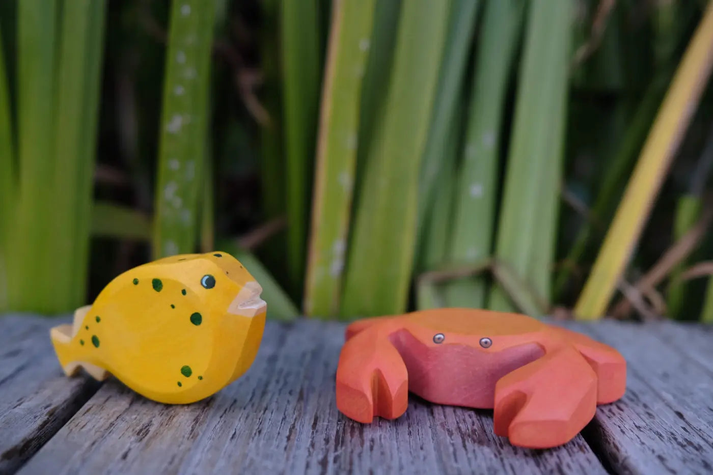 Die Krabbe fällt durch ihre leuchtend orangene Farbe sofort ins Auge. Sie ist eine Meeresbewohnerin, kommt aber auch gerne an Land, wo man sie in ihrem typisch seitlichen Gang über den Strand huschen sieht. Mit den vielen Beinen kann sie dabei sehr schnell werden. Ihre großen Scheren helfen ihr dabei, Würmer und Seetang zu sammeln, die auf ihrem Speiseplan stehen.
