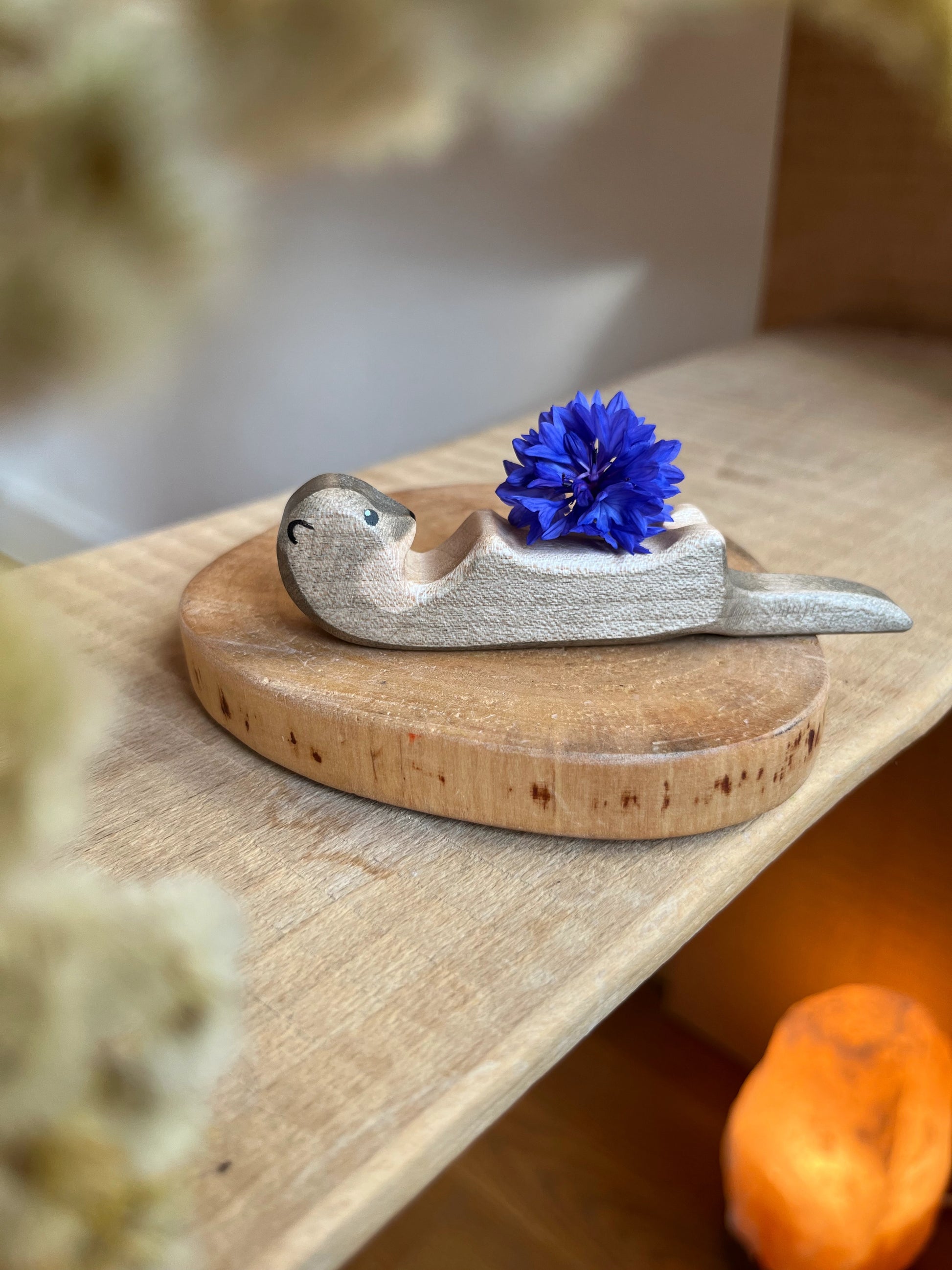 Der entspannte Otter liegt gemütlich auf dem Rücken. Er hat braunes Fell mit einer helleren Färbung am Bauch. Er liebt es, auf dem Wasser zu treiben und sein junges dabei fest an sich zu kuscheln.