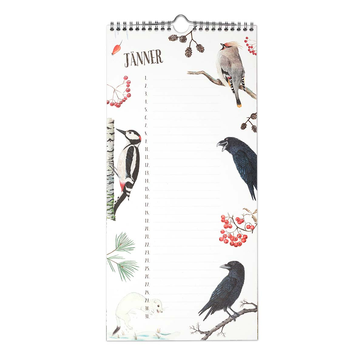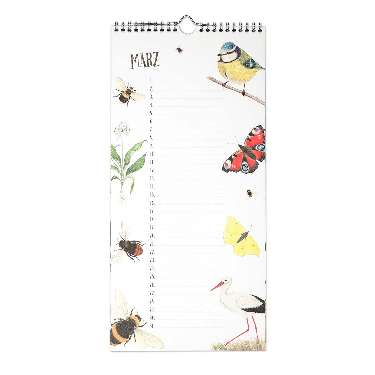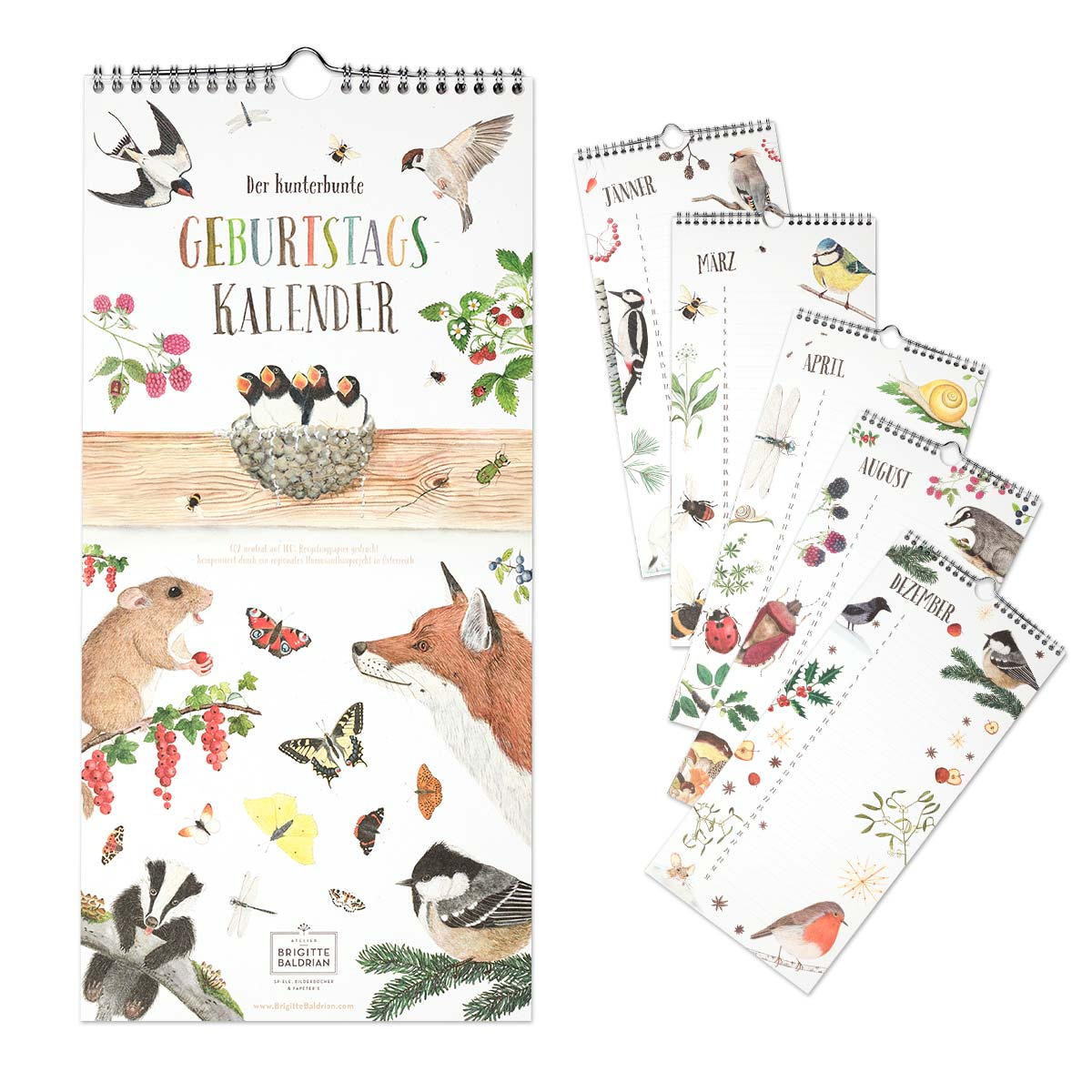 Jeder Monat ist mit jahreszeitlich passenden Pflanzen und Tieren illustriert. So brütet im Mai die Amsel, im Juli blüht die schöne Heckenrose, während im November die Schleiereule über alle Geburtstagskinder wacht. Die Zeilen bieten genügend Platz auch für mehrere Geburtstagskinder an einem Tag.