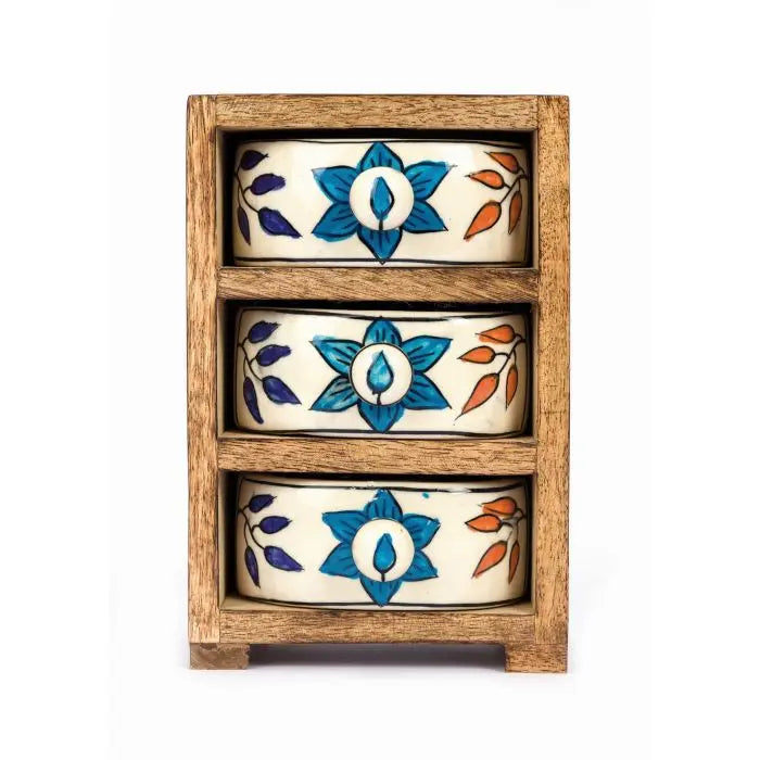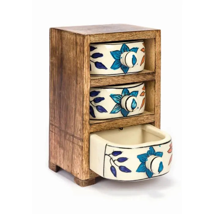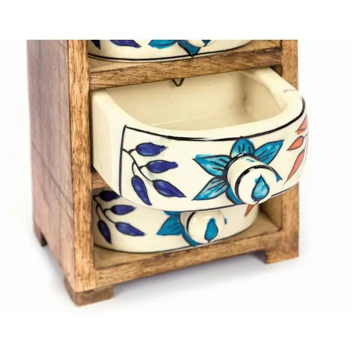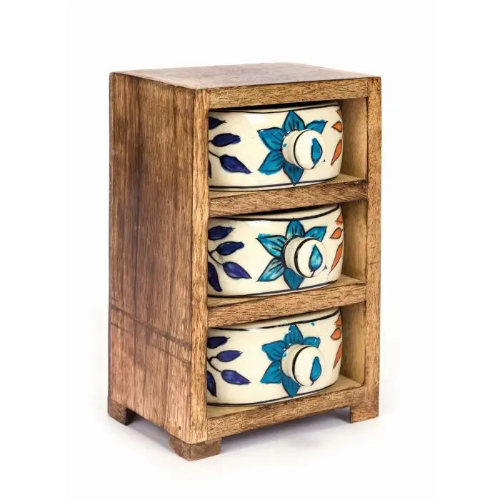 Diese besondere Keramikkommode aus Indien vereint traditionelles Handwerk mit modernem Design. Die Mini Kommode besteht aus nachhaltigem Mango-Holz, während die drei kunstvoll verzierten Schubladen aus Keramik gefertigt sind. Jede Schublade ist individuell handbemalt und zeugt von der hohen Kunstfertigkeit der indischen Handwerker*innen.