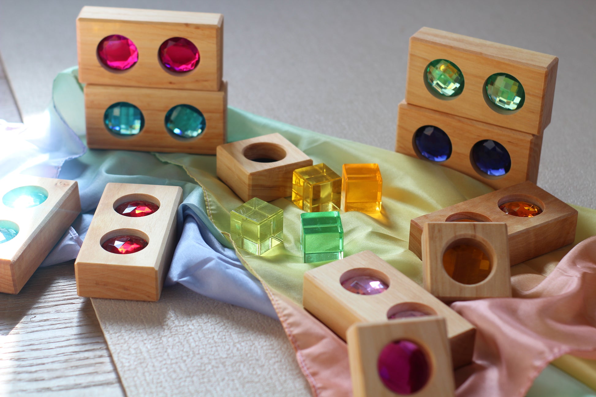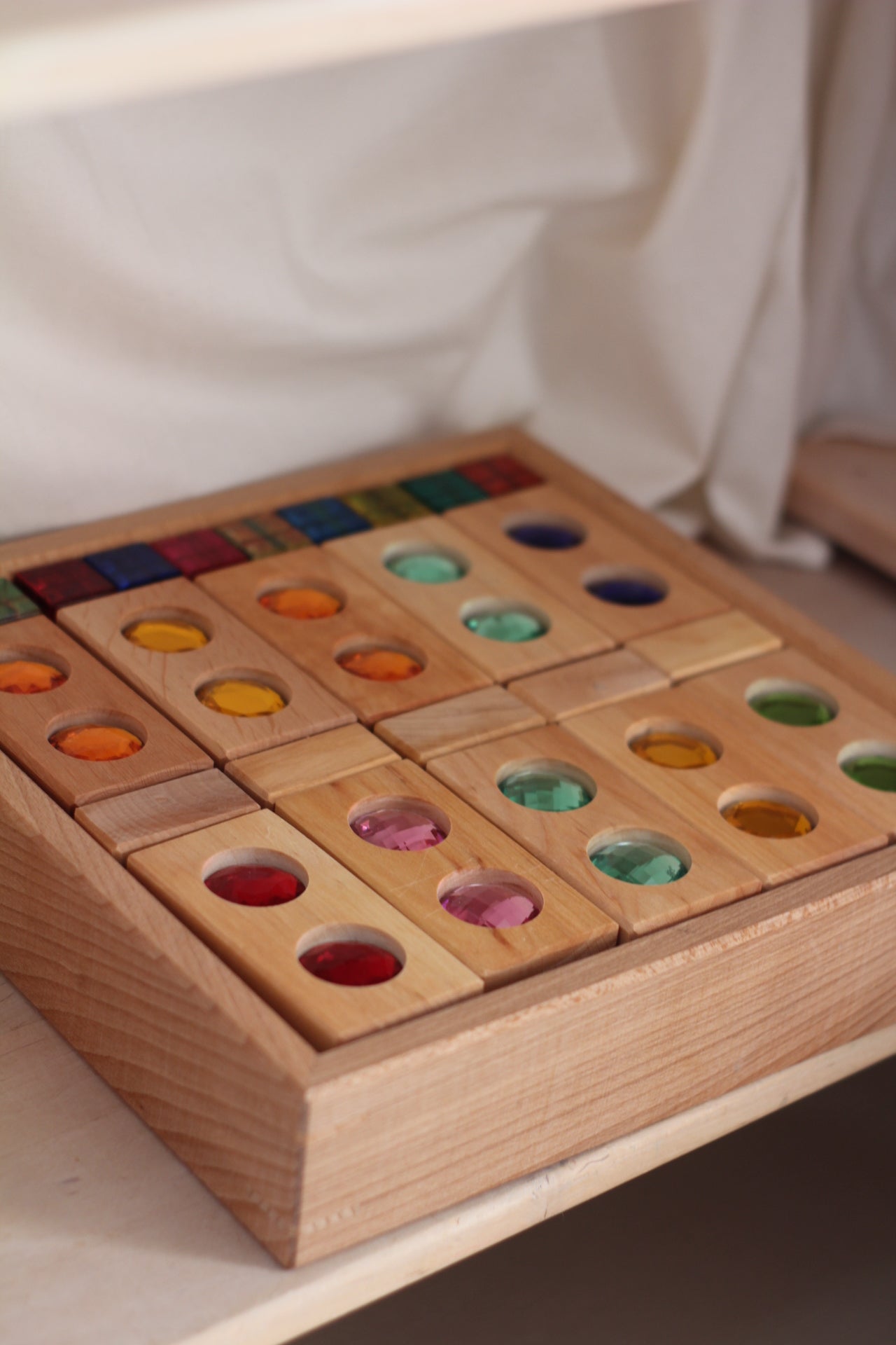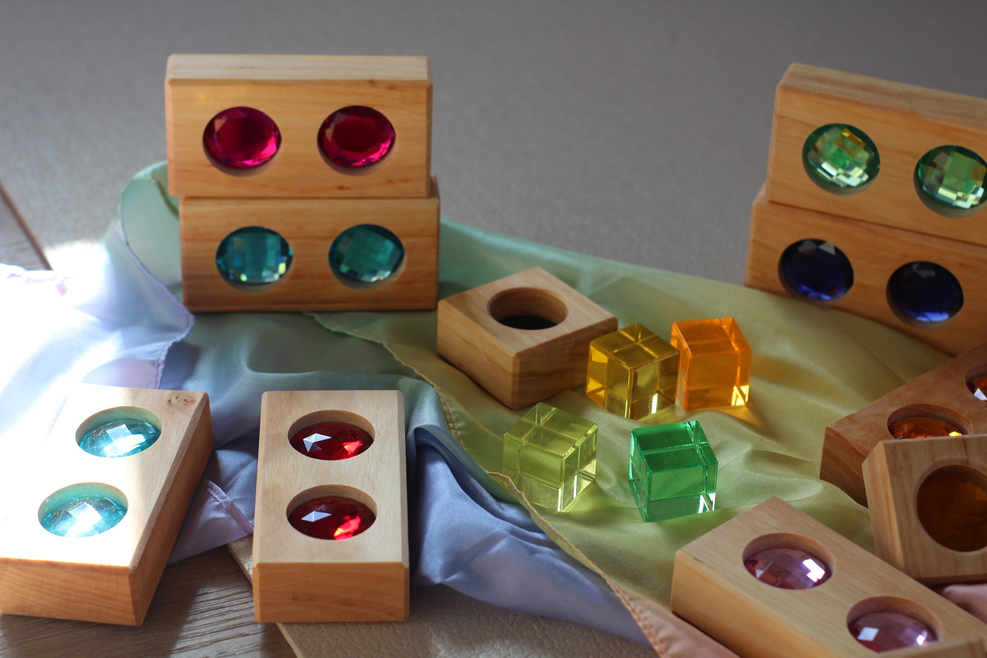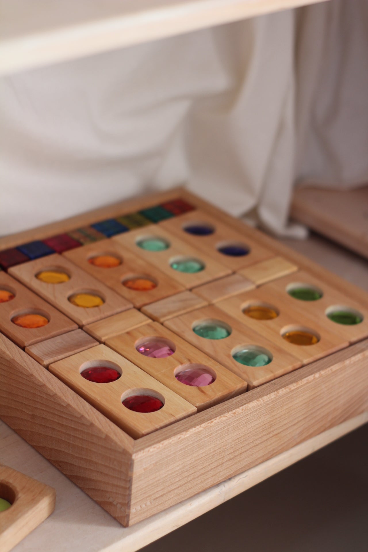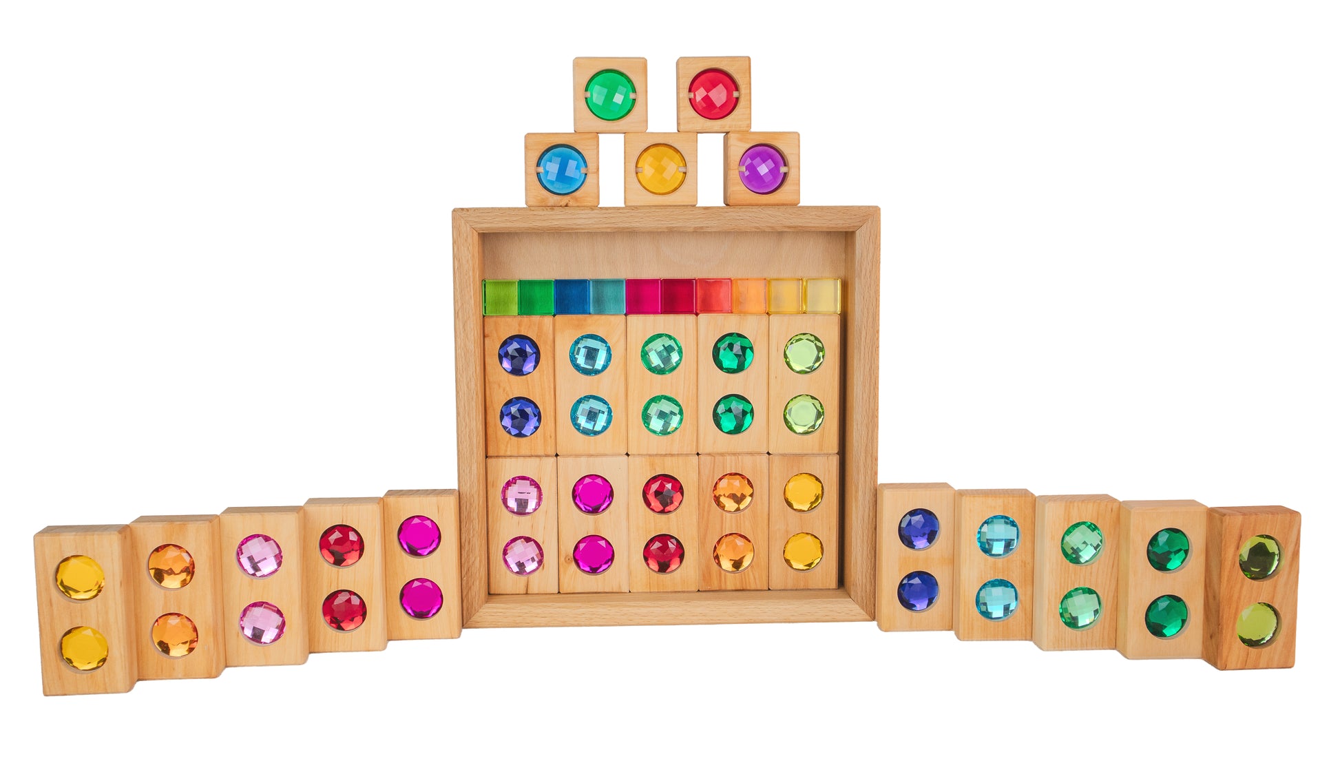 Die „Kleine Farbstraße mit Lichtbauwürfeln“ enthält 20 Quader mit Funkelsteinen, 5 transparente Facettenklötze und zusätzlich 20 Lichtbauwürfel. Insgesamt 45 Teile, aus Erlenholz geölt.