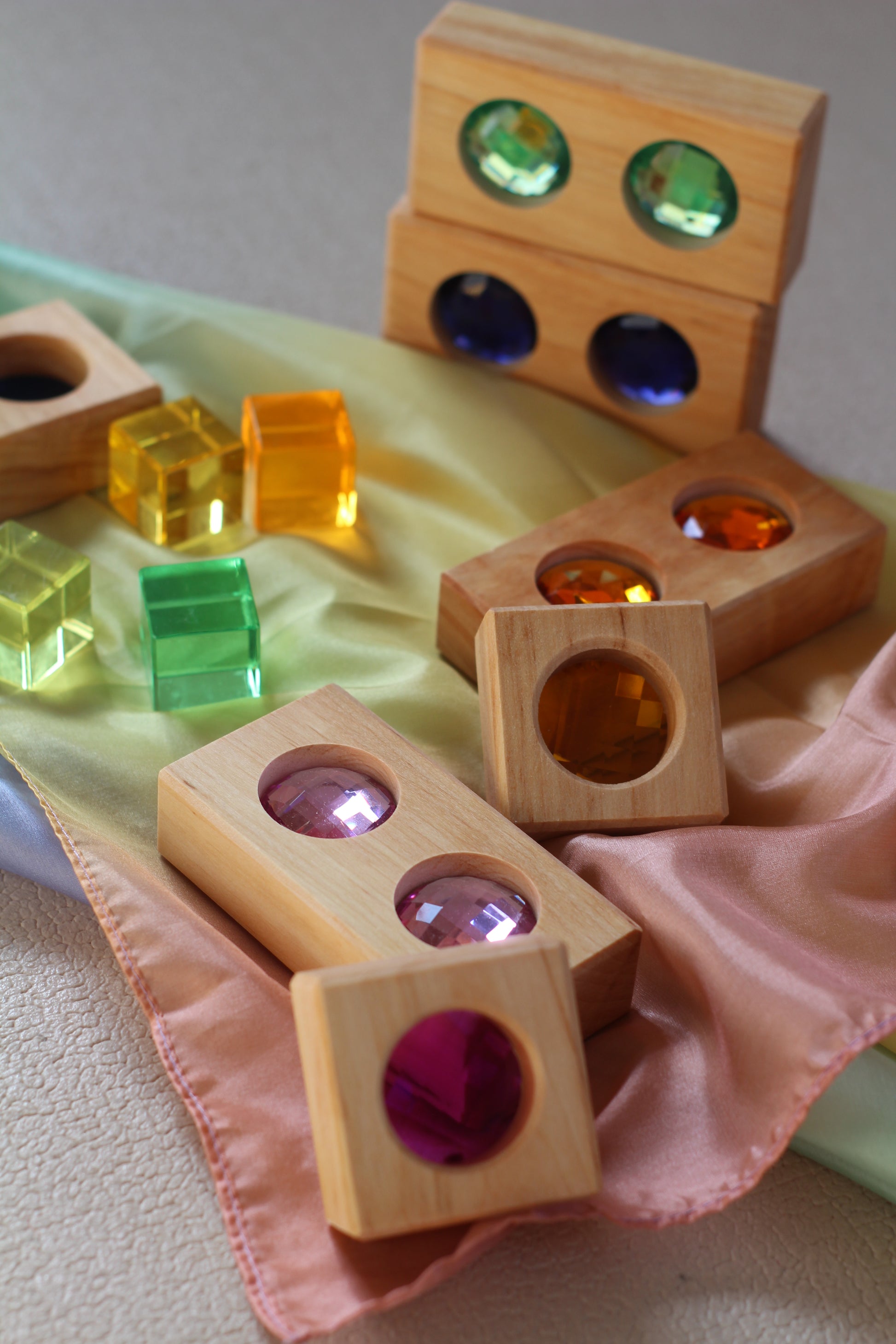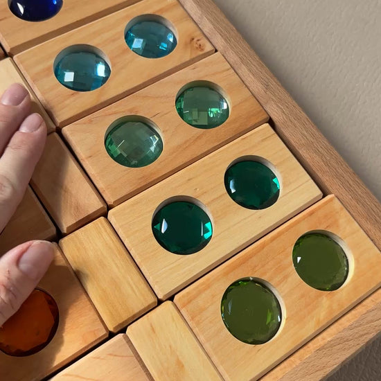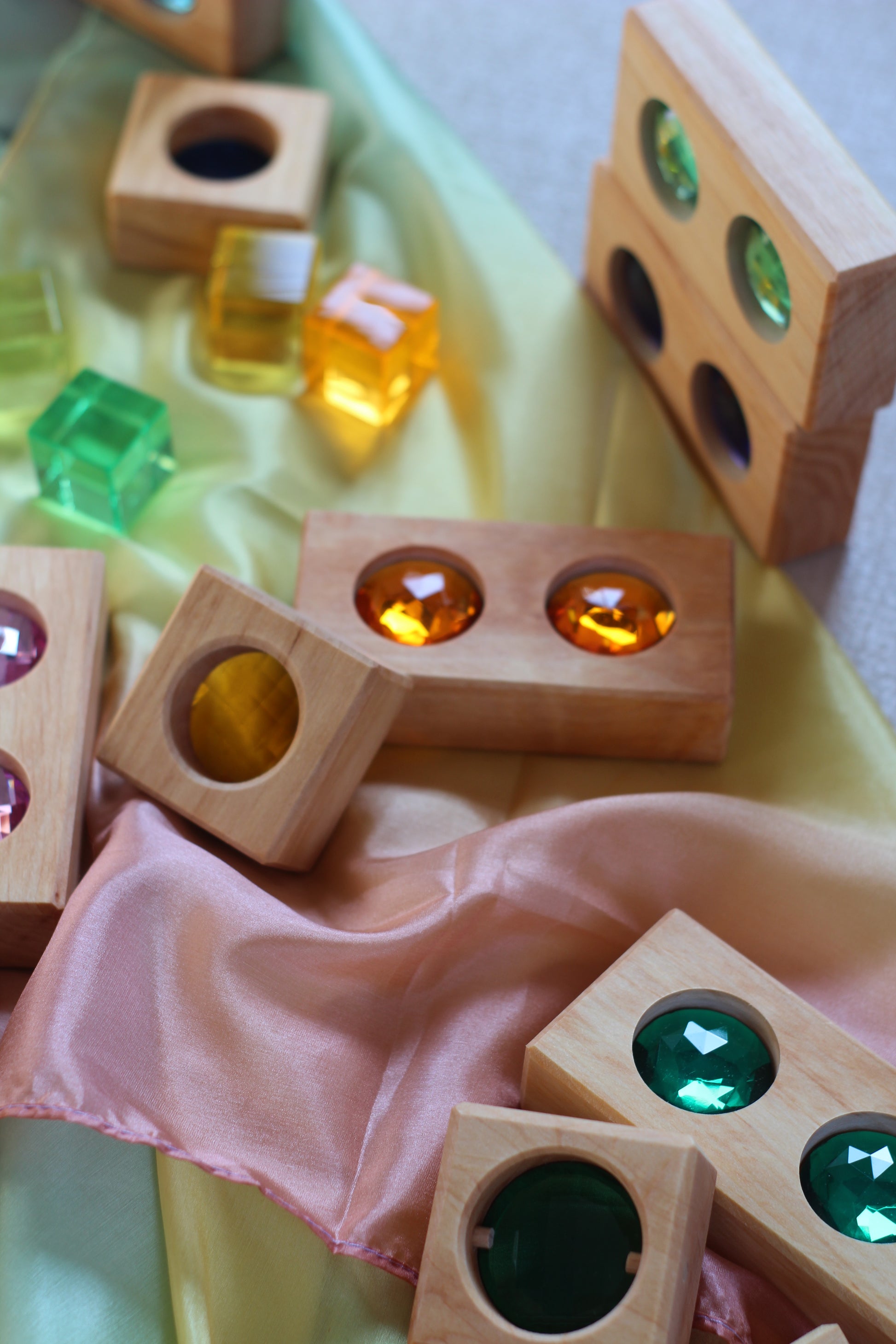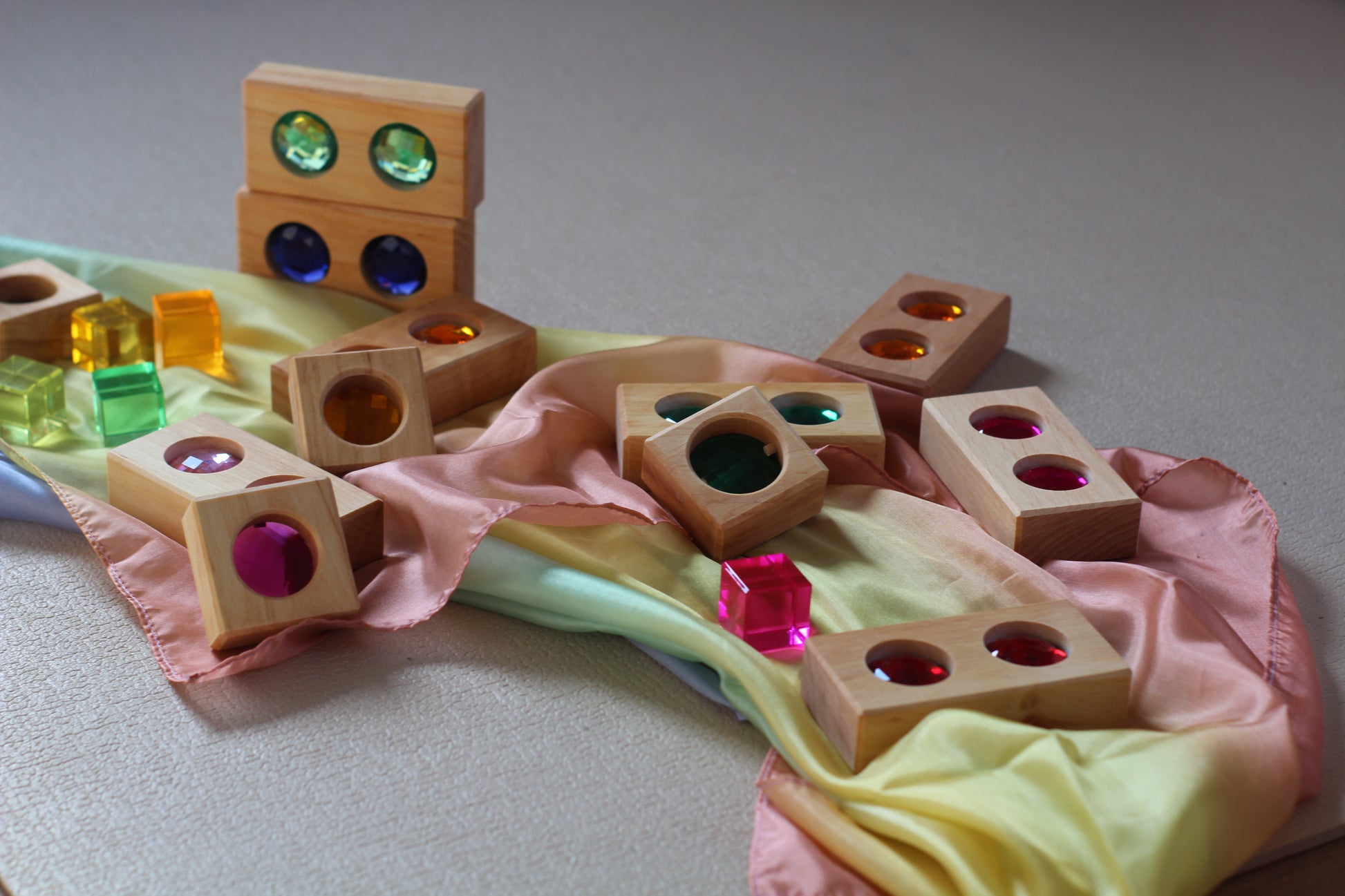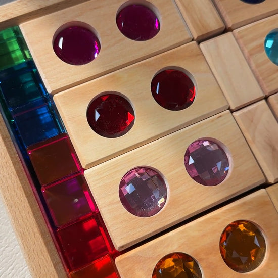 Die „Kleine Farbstraße mit Lichtbauwürfeln“ enthält 20 Quader mit Funkelsteinen, 5 transparente Facettenklötze und zusätzlich 20 Lichtbauwürfel. Insgesamt 45 Teile, aus Erlenholz geölt.