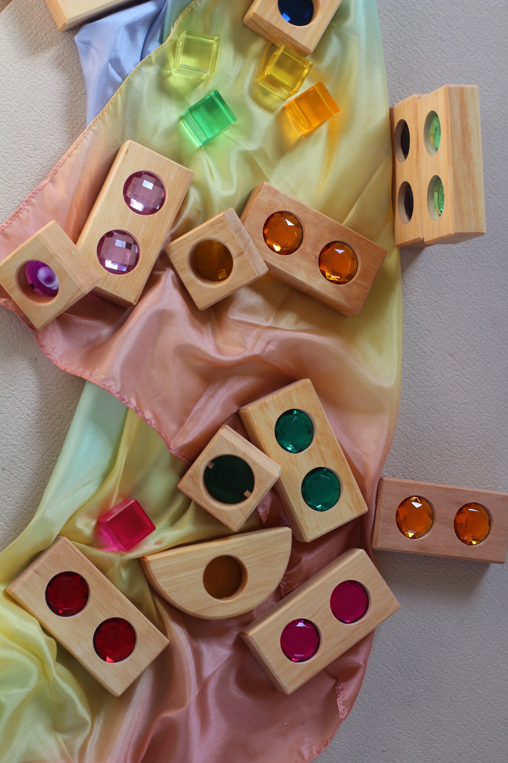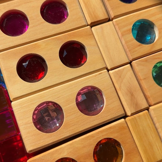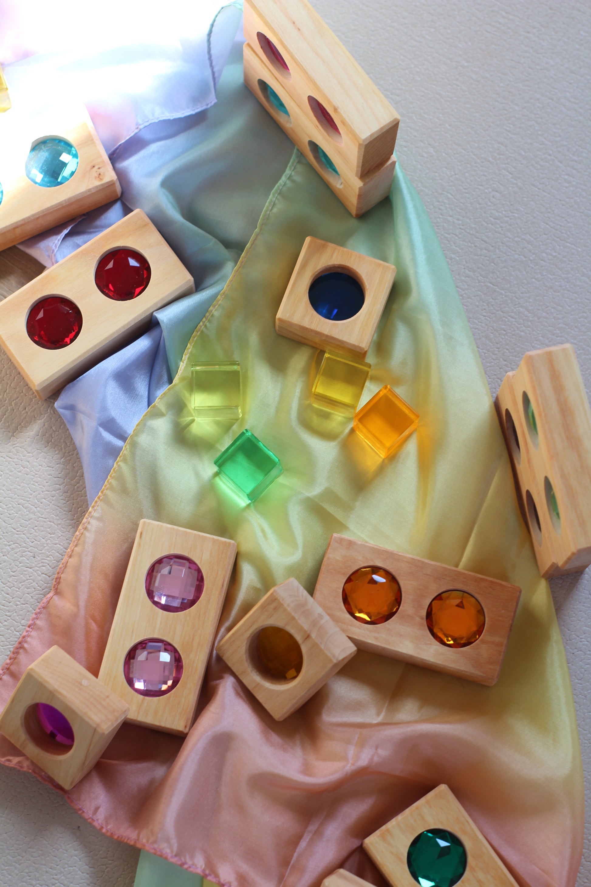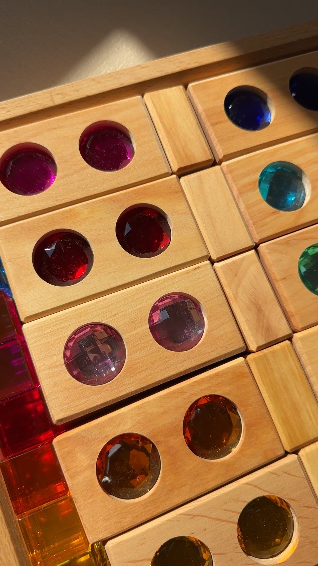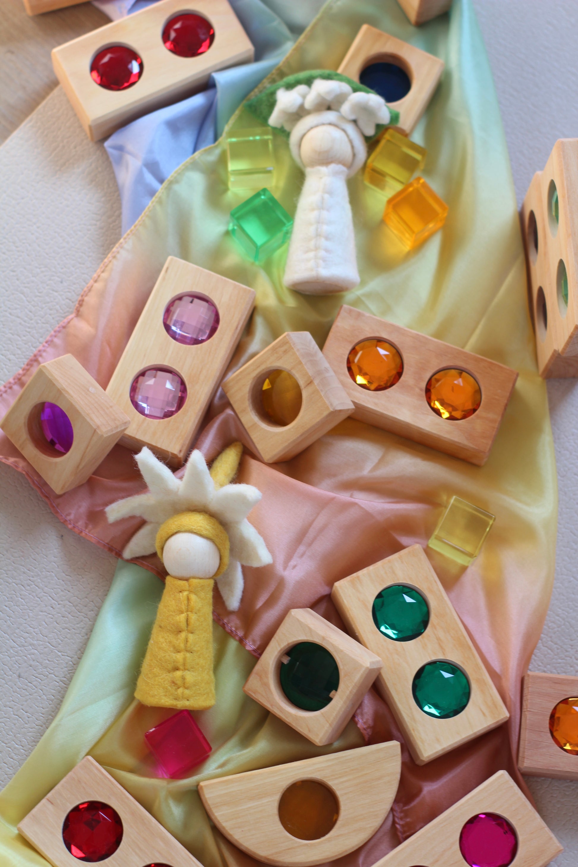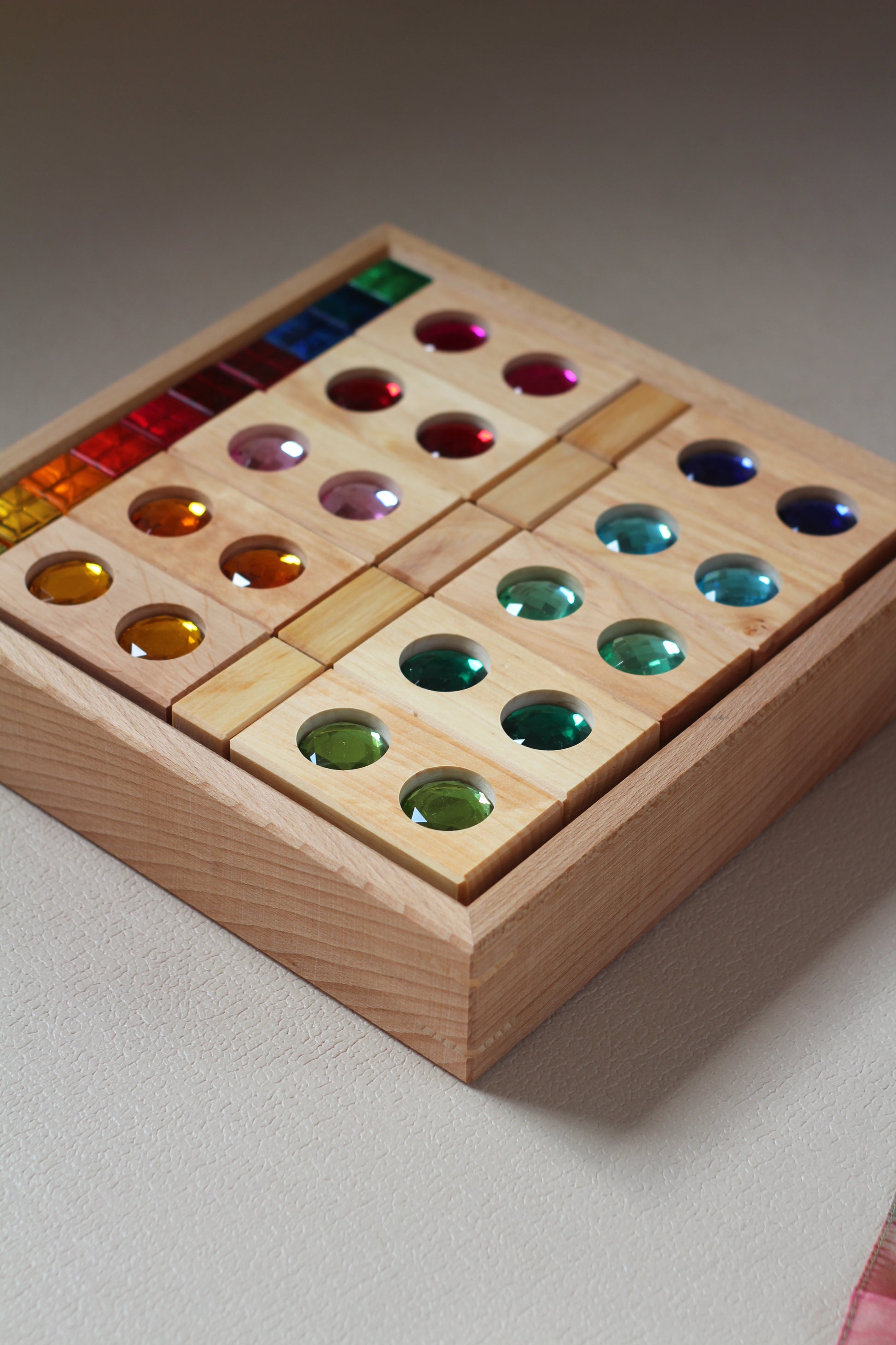 Die „Kleine Farbstraße mit Lichtbauwürfeln“ enthält 20 Quader mit Funkelsteinen, 5 transparente Facettenklötze und zusätzlich 20 Lichtbauwürfel. Insgesamt 45 Teile, aus Erlenholz geölt.