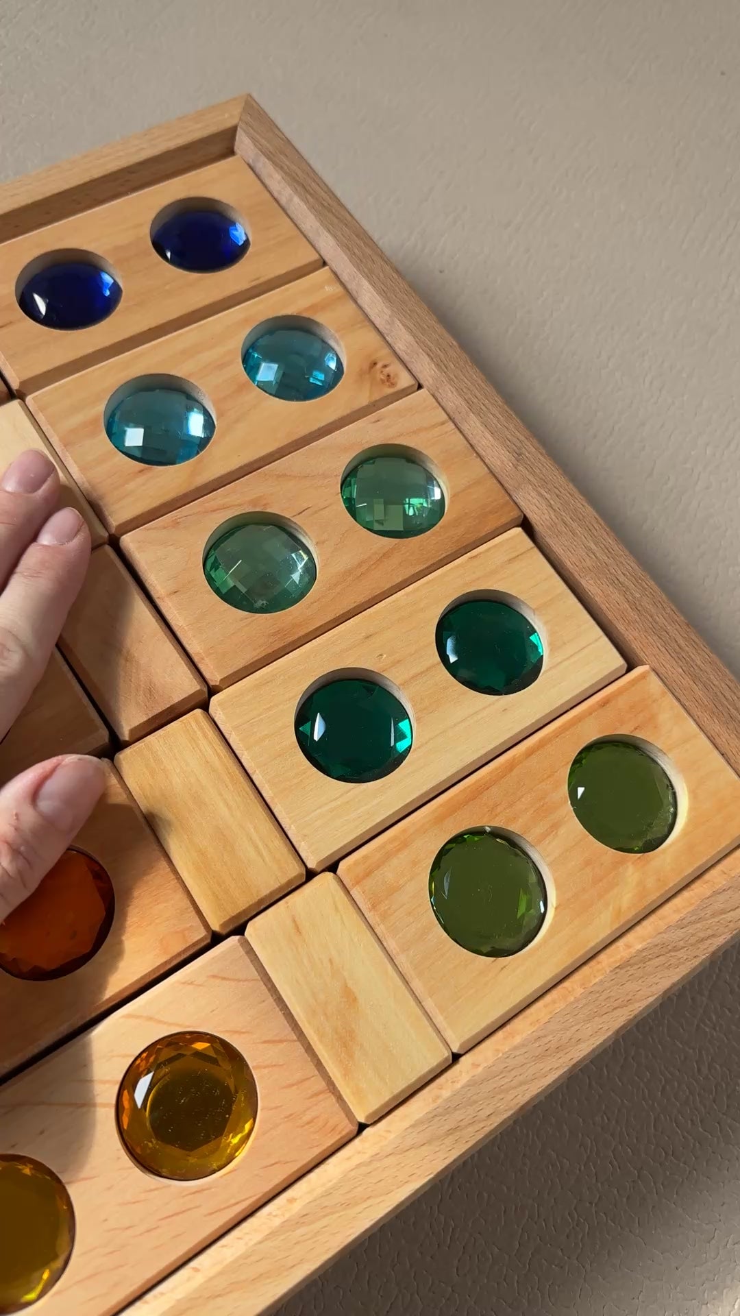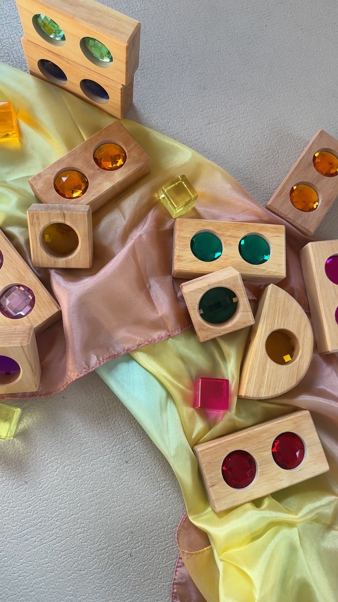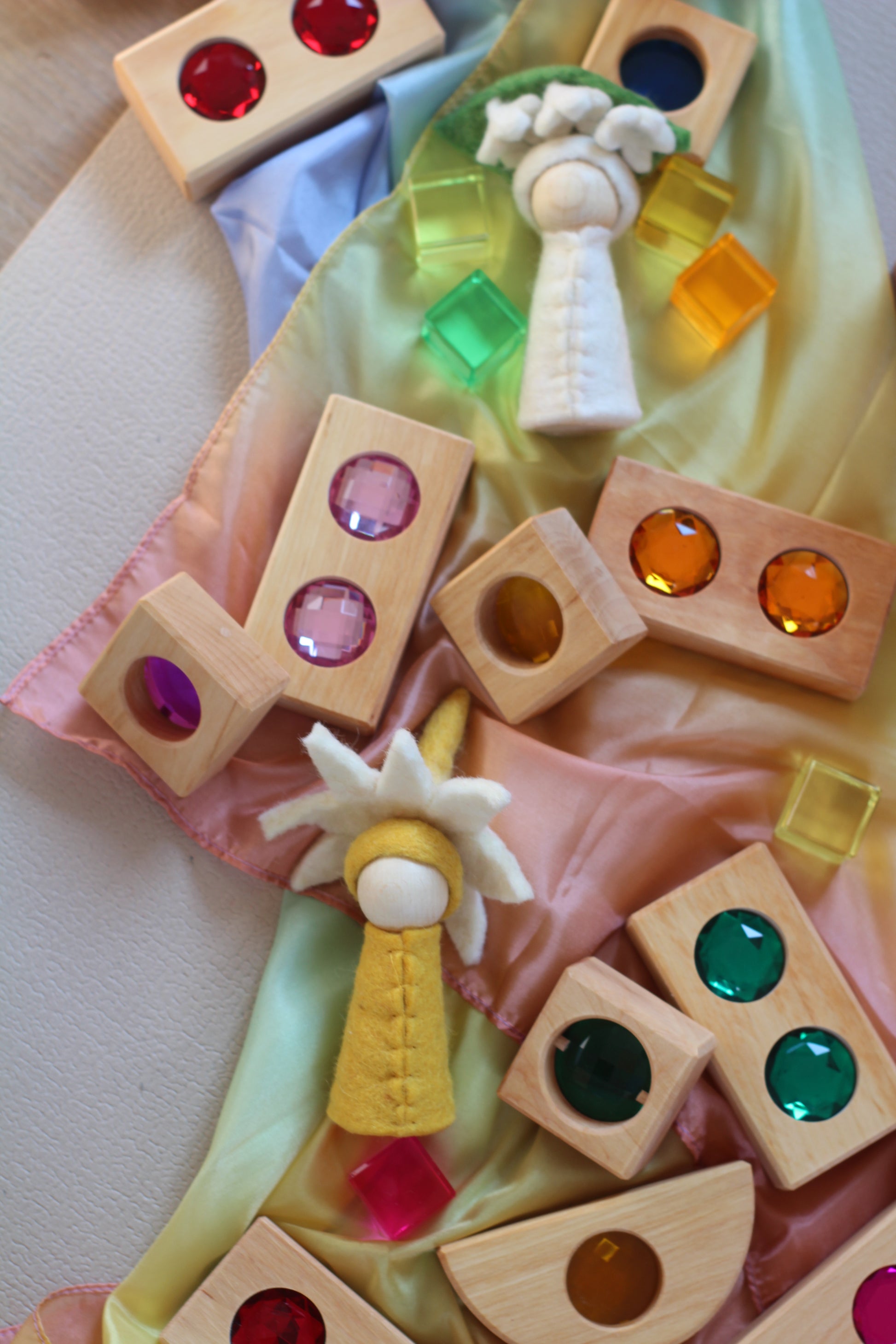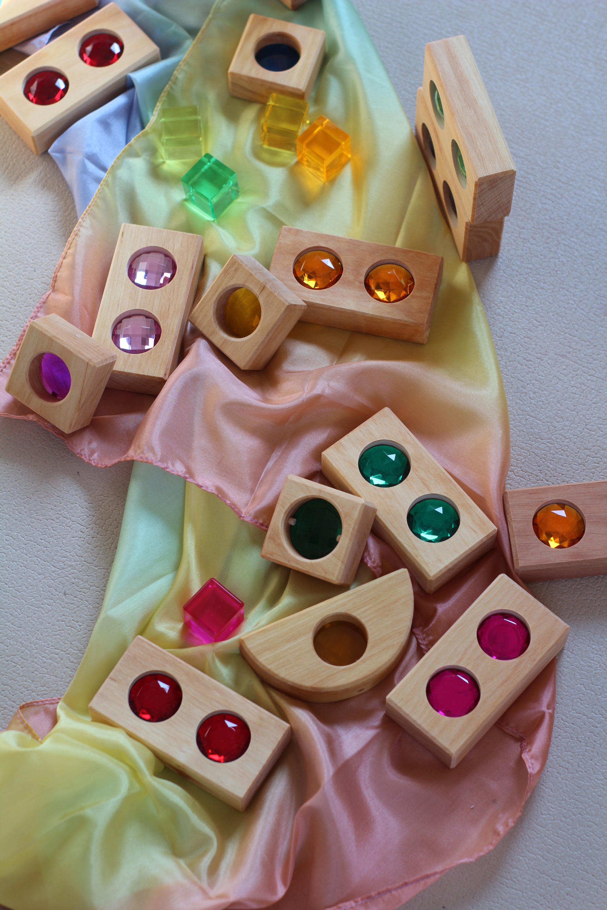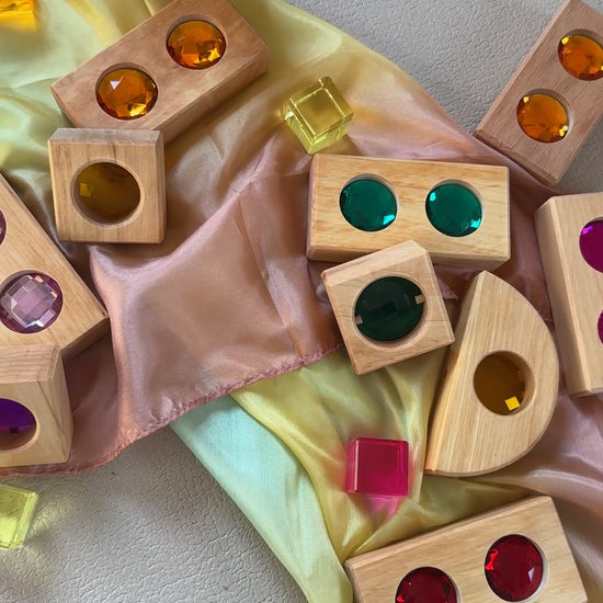 Die „Kleine Farbstraße mit Lichtbauwürfeln“ enthält 20 Quader mit Funkelsteinen, 5 transparente Facettenklötze und zusätzlich 20 Lichtbauwürfel. Insgesamt 45 Teile, aus Erlenholz geölt.