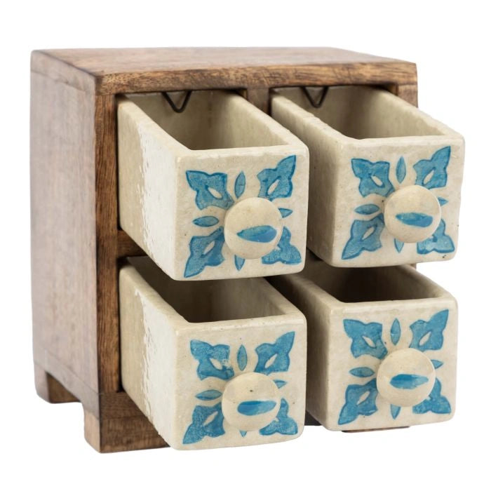 Dieses charmante Schränkchen aus Mango-Holz und Keramik ist das perfekte Accessoire für Dein Zuhause. Mit den Maßen 15 x 15 x 10 cm ist es kompakt und passt perfekt auf jedes Regal, jeden Nachttisch oder Schreibtisch. Die vier handgefertigten Schubladen aus Keramik sind einzigartig und verleihen der Mini Kommode einen besonderen Charakter.