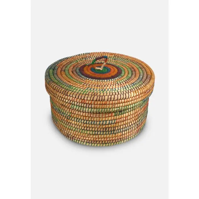 Unser mit Liebe gefertigter Korb mit Deckel bringt Wärme und Stil ins Zuhause. Aus Kaisa-Gras und farbenfroher Jute sorgfältig geflochten, fühlt sich jede Berührung wertvoll und besonders an. Die Kunsthandwerker*innen in Bangladesch schenken jedem Korb Individualität und lassen spürbar Sorgfalt und Tradition einfließen. Mit dem formschönen Deckel kannst Du all Deine kleinen Dinge elegant verstauen und schützt sie vor neugierigen Blicken oder Staub. Das harmonische Farbspiel verleiht jedem Raum einen besonderen Touch und hebt Deine Liebe für Design hervor.