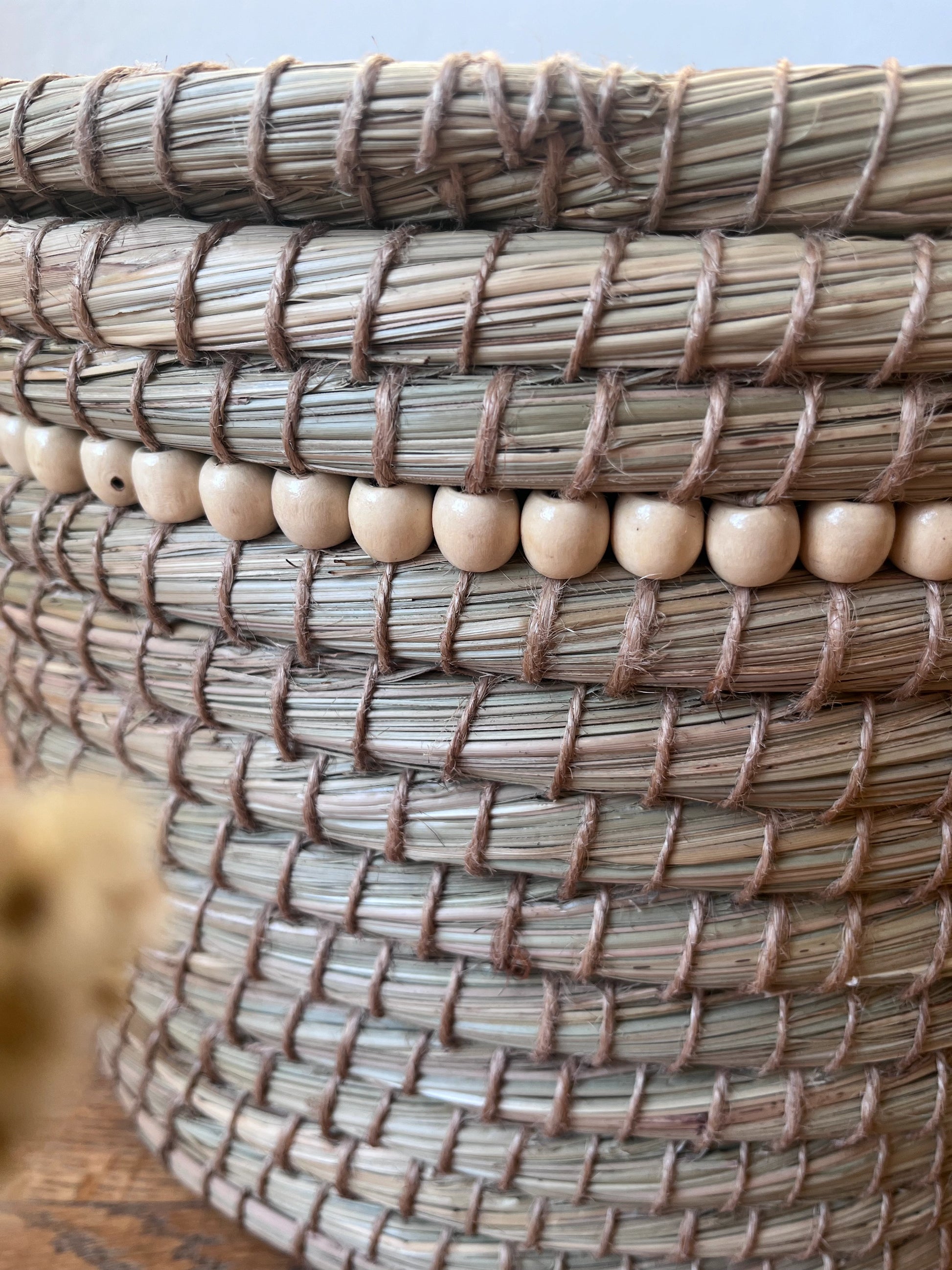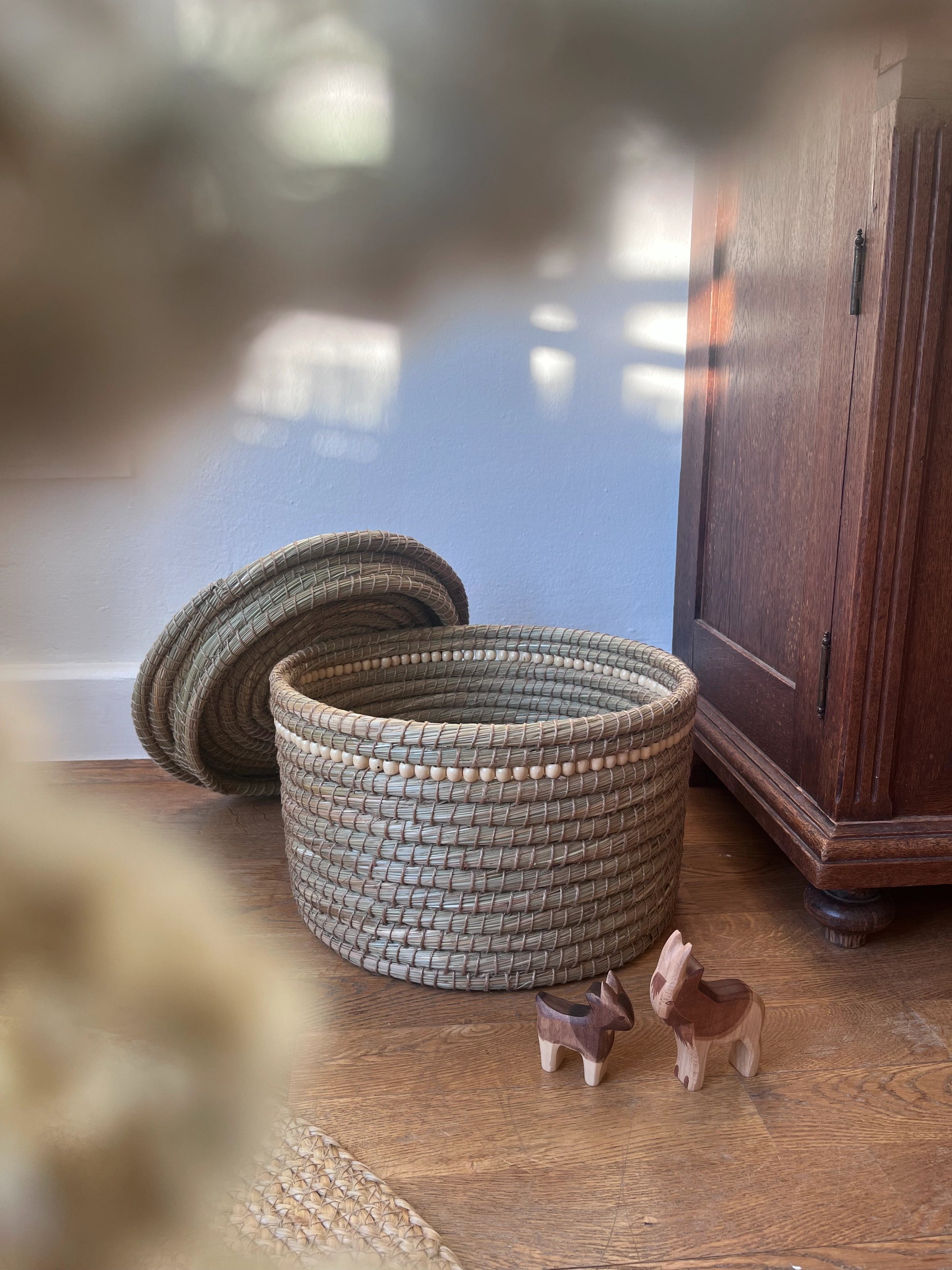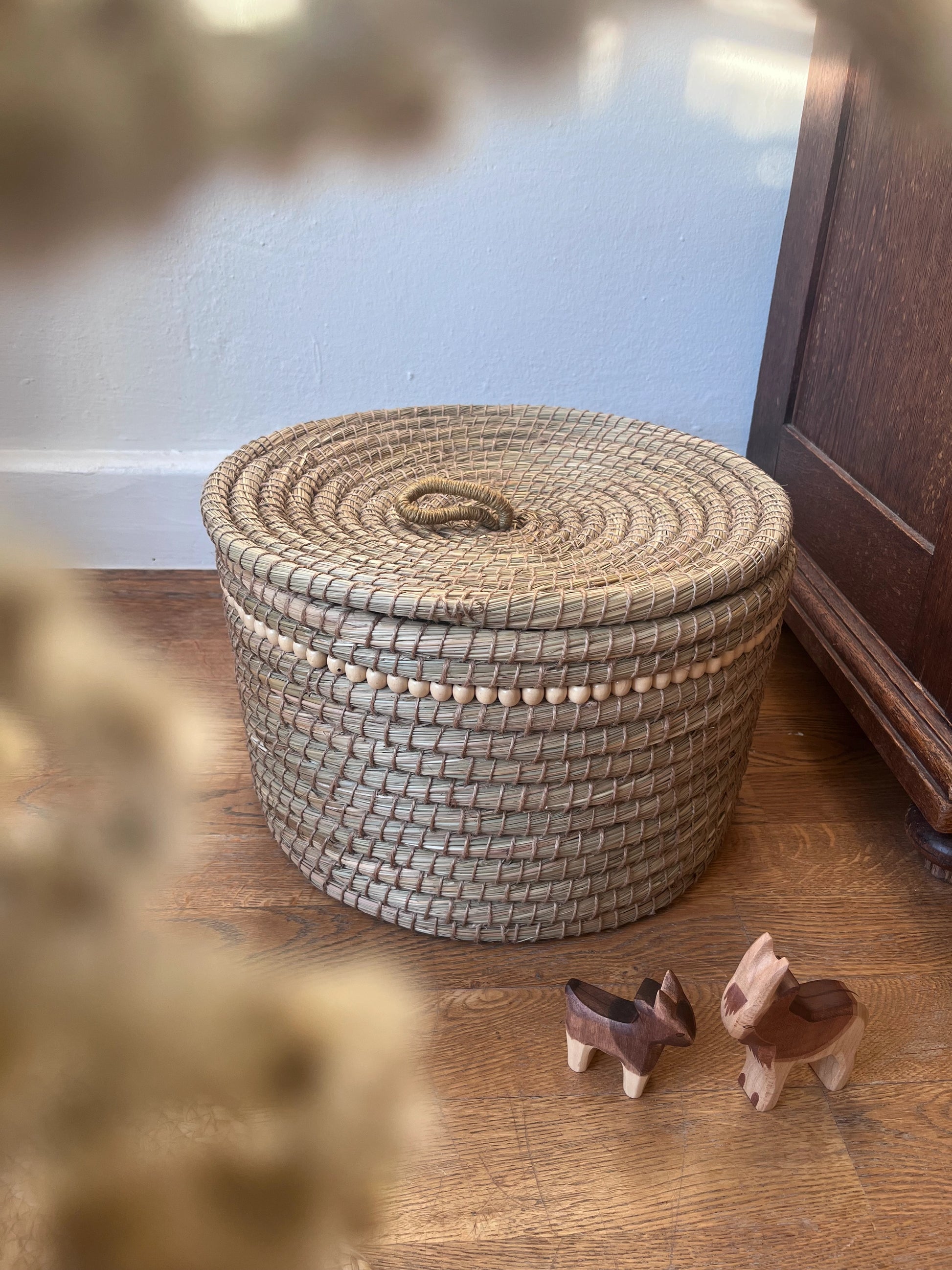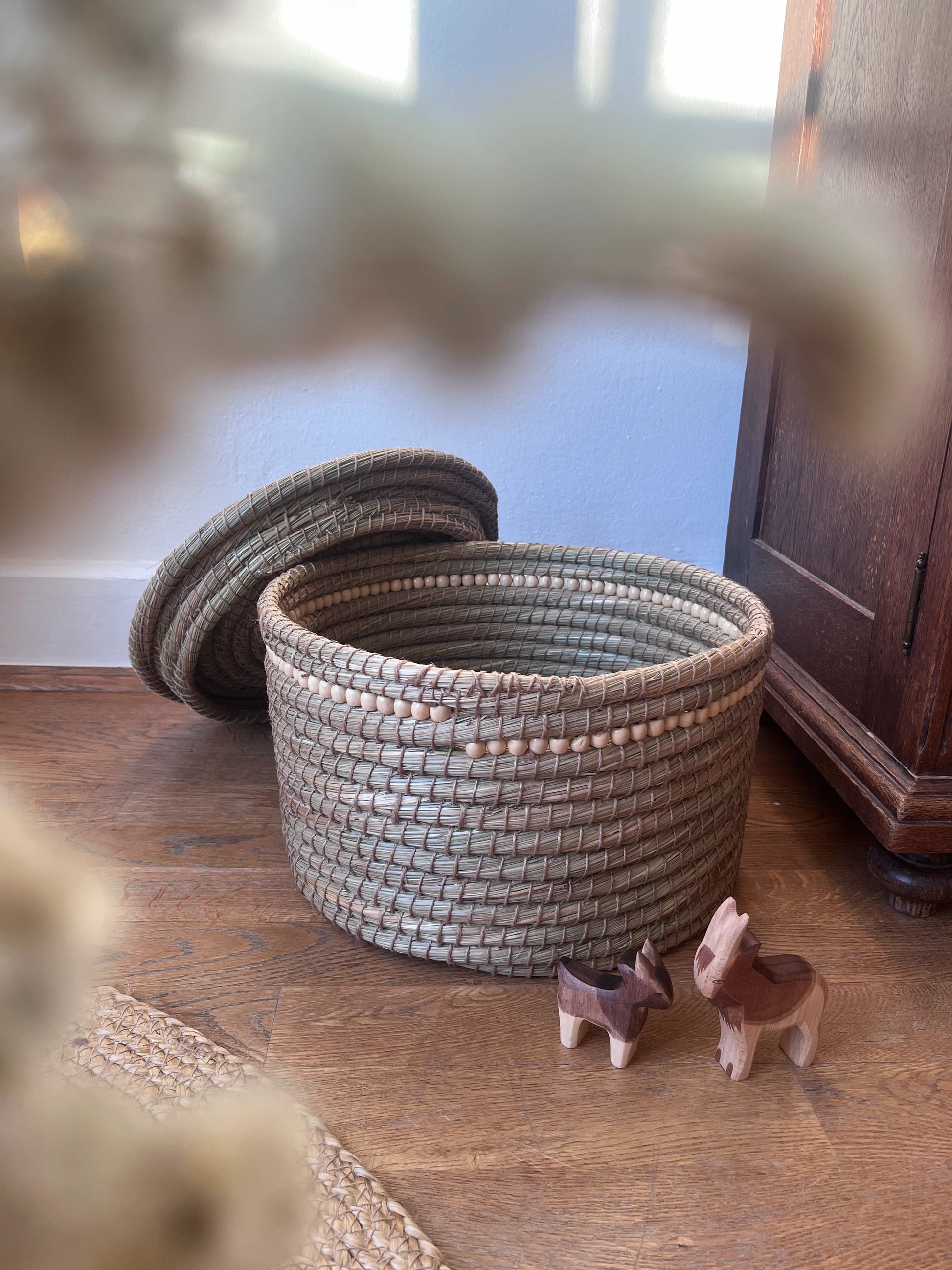 Dieser wunderschöne, geflochtene Korb mit Deckel "Eleganz" aus Kaisa-Gras ist nicht nur ein funktionaler Aufbewahrungskorb, sondern auch ein echtes Highlight für Dein Zuhause. Mit seiner natürlichen Farbe und den versteckten Details aus Holzperlen bringt er eine warme und authentische Atmosphäre in jeden Raum.
