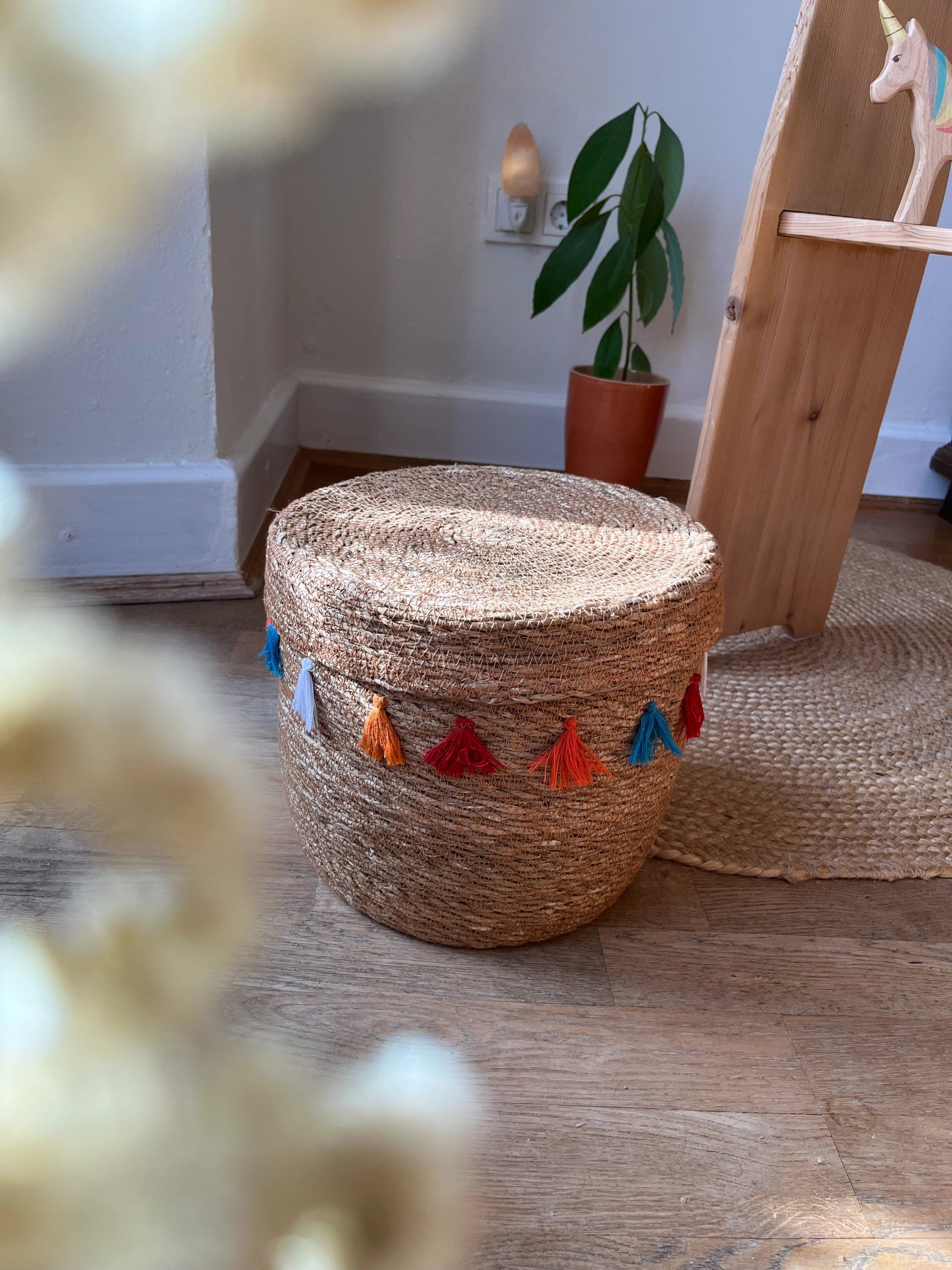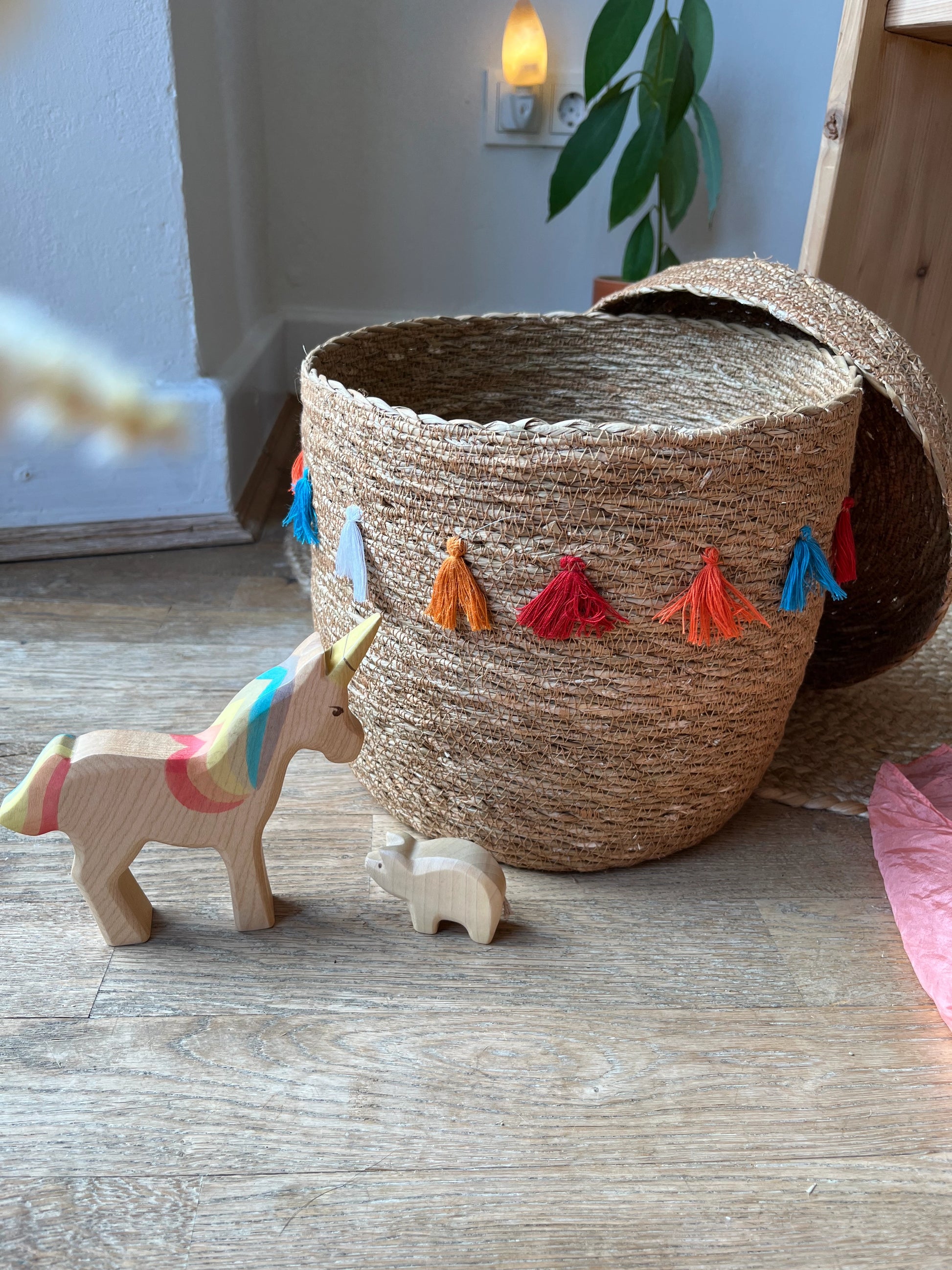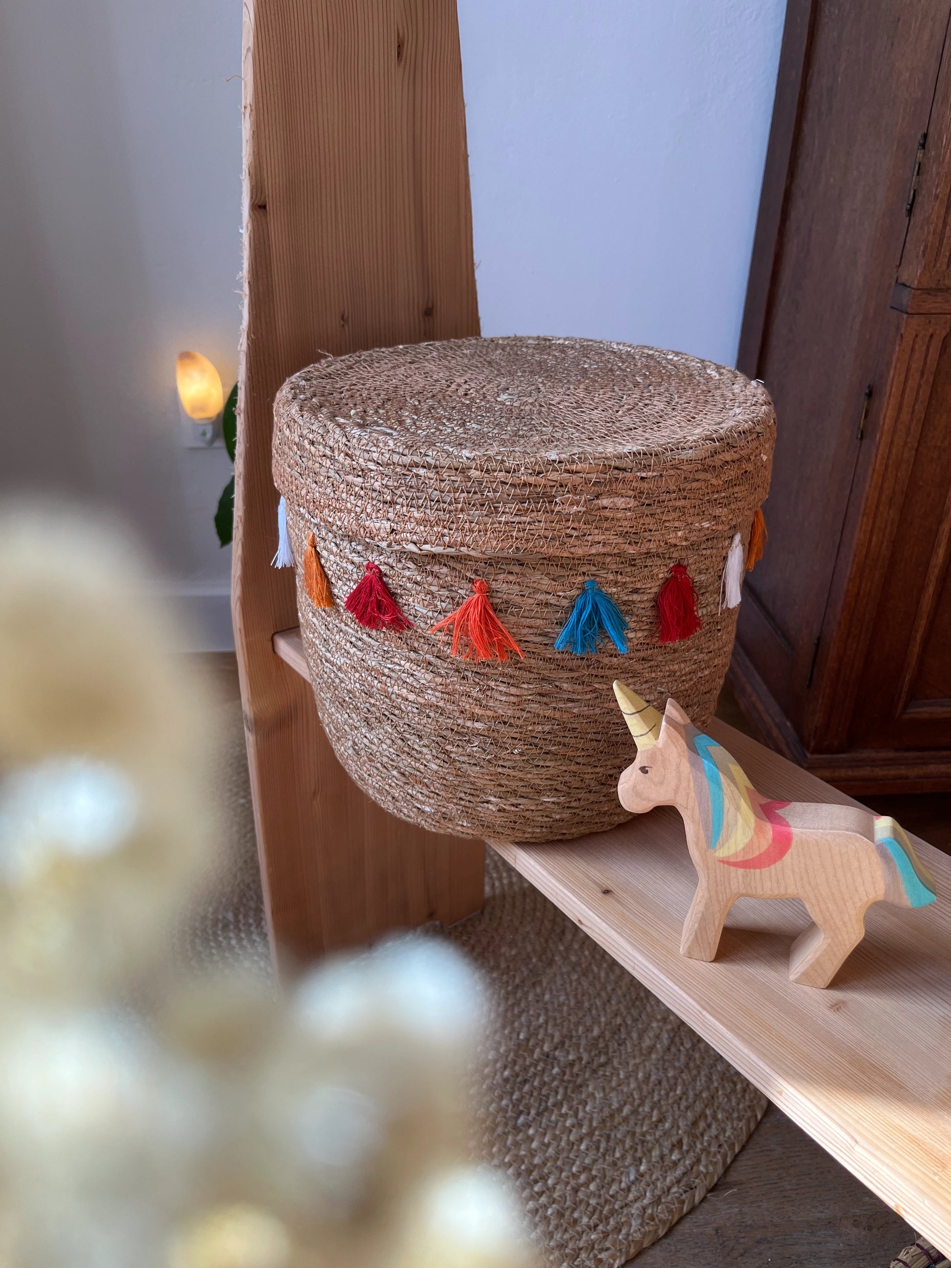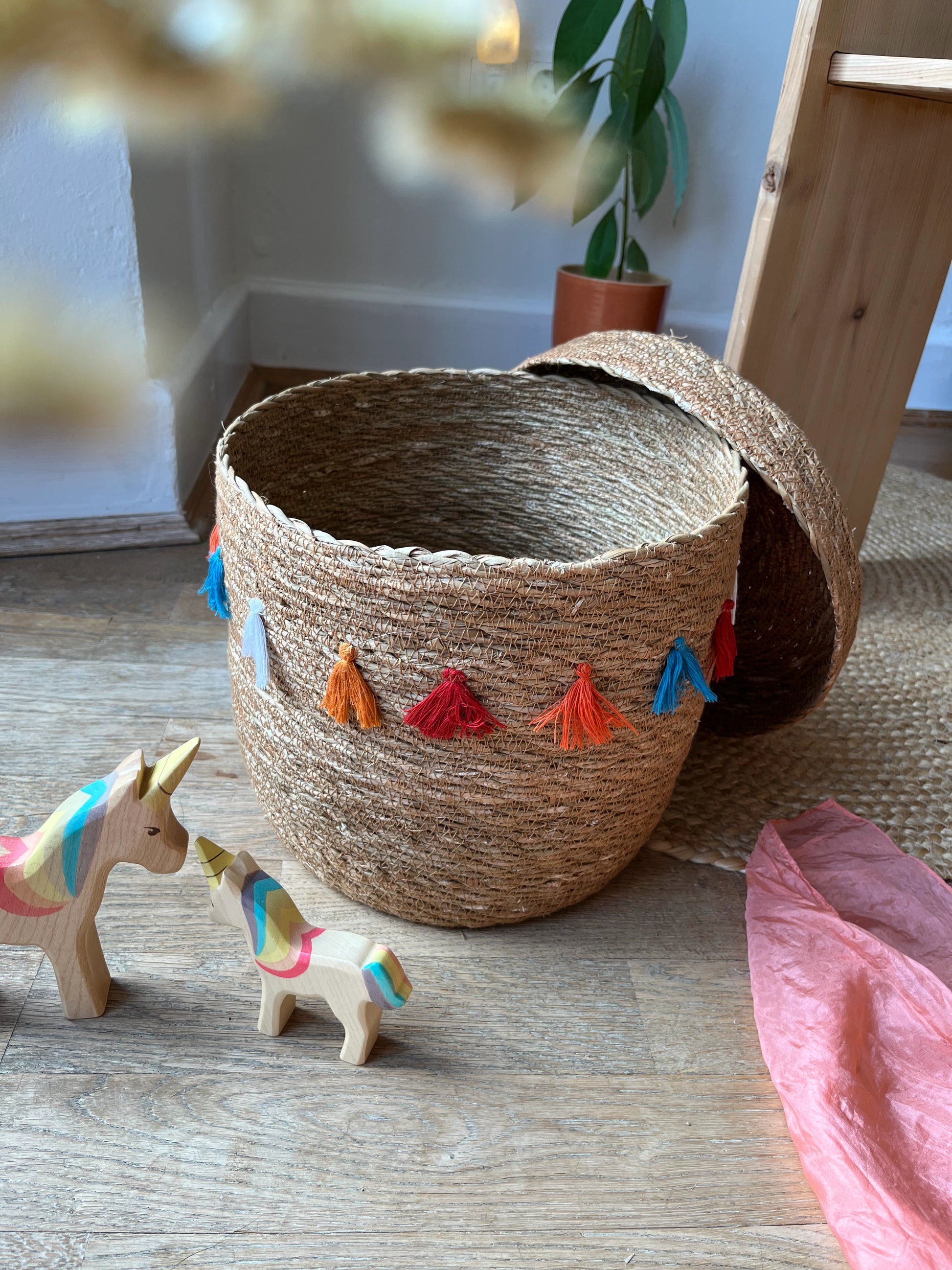 Der geflochtene Korb mit Deckel "Zirkus" aus Hogla-Gras bringt Freude und Farbe in Dein Zuhause. Mit seinen bunten Fransen und der natürlichen Farbgebung wird er zum Hingucker in jedem Raum. Jeder Korb wird in Bangladesch handgefertigt und zeigt das handwerkliche Talent der lokalen Kunsthandwerker*innen.