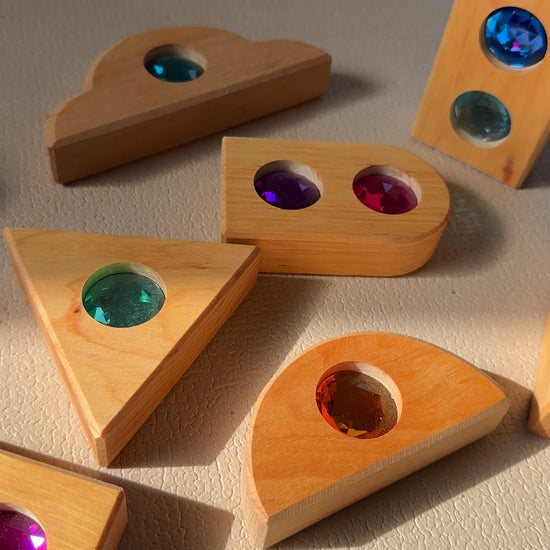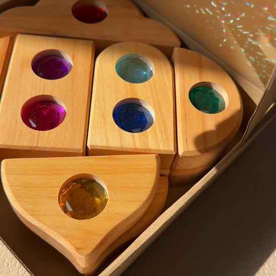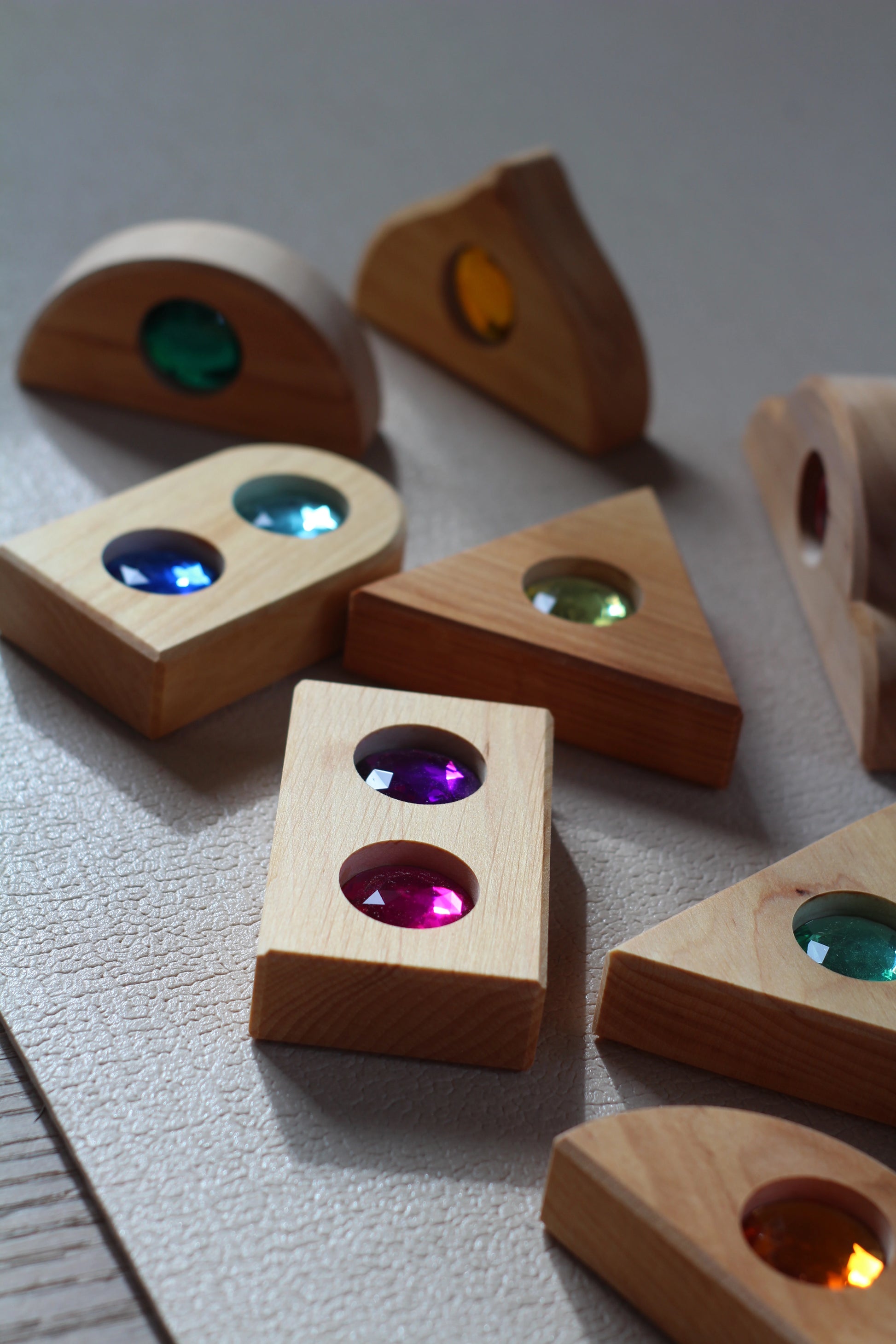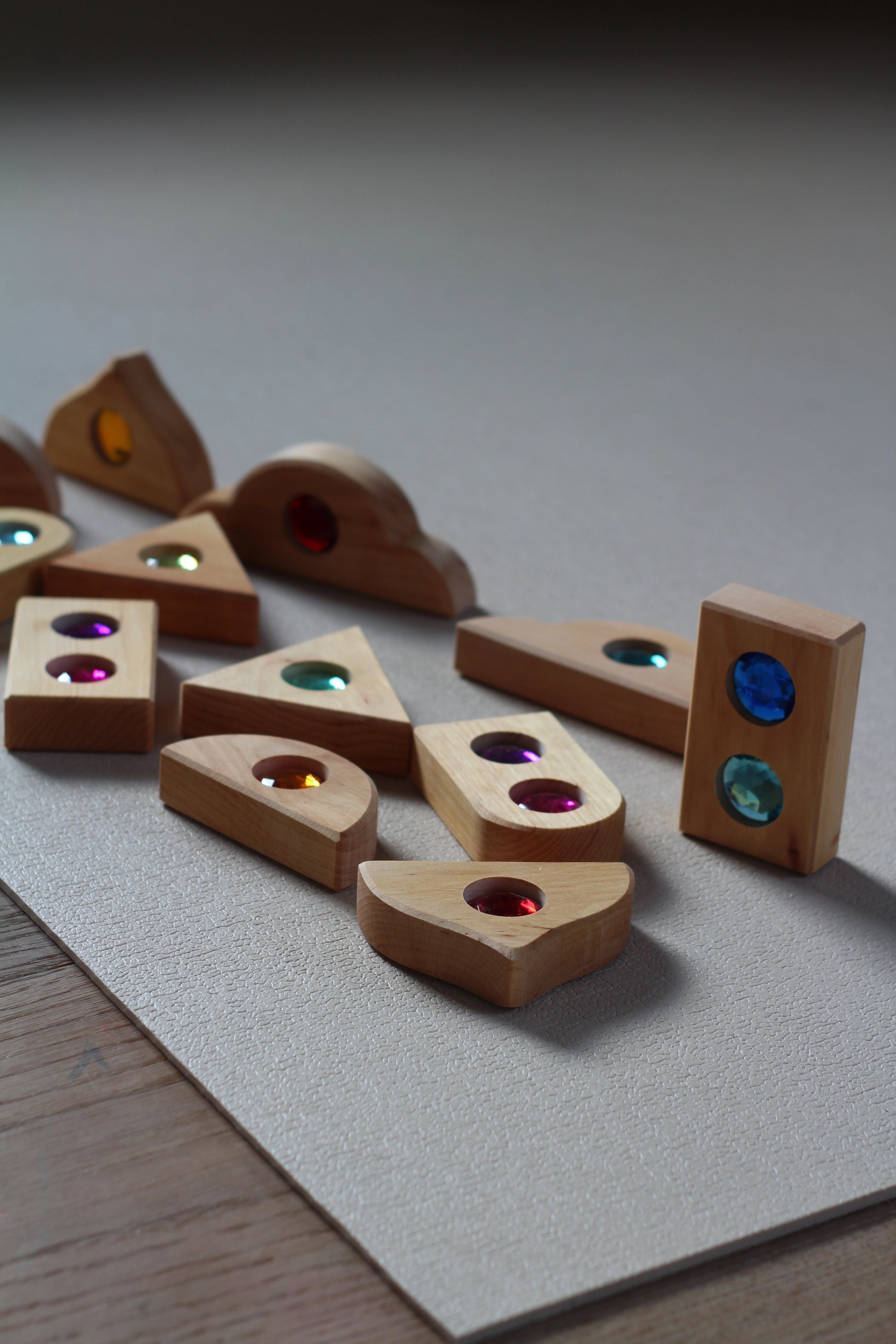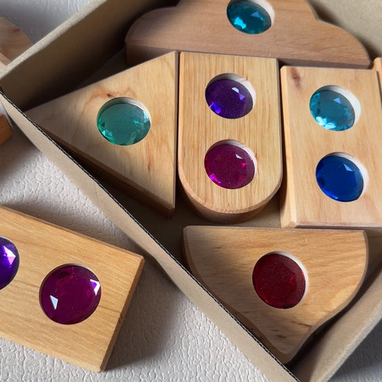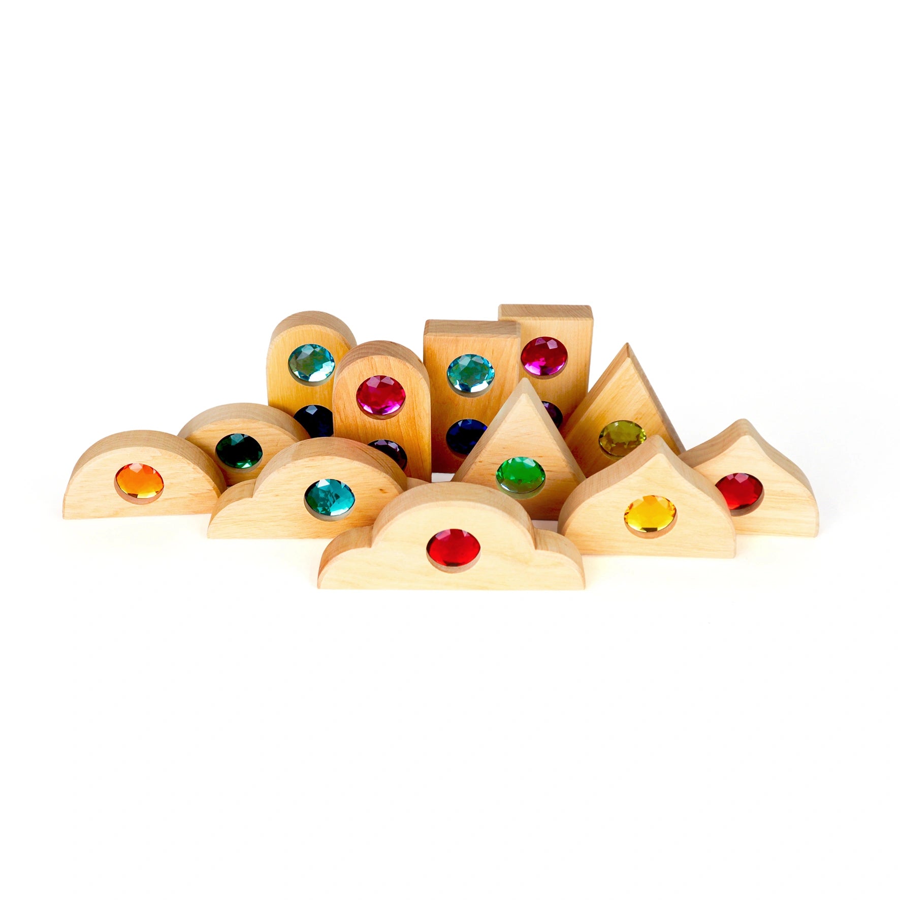 In jedem Märchendach liegen ein oder zwei bunte, Funkelsteine. Die Steine machen die Bauecke zu einer tollen Ergänzung für Schlösser und Burgen.