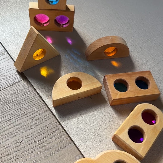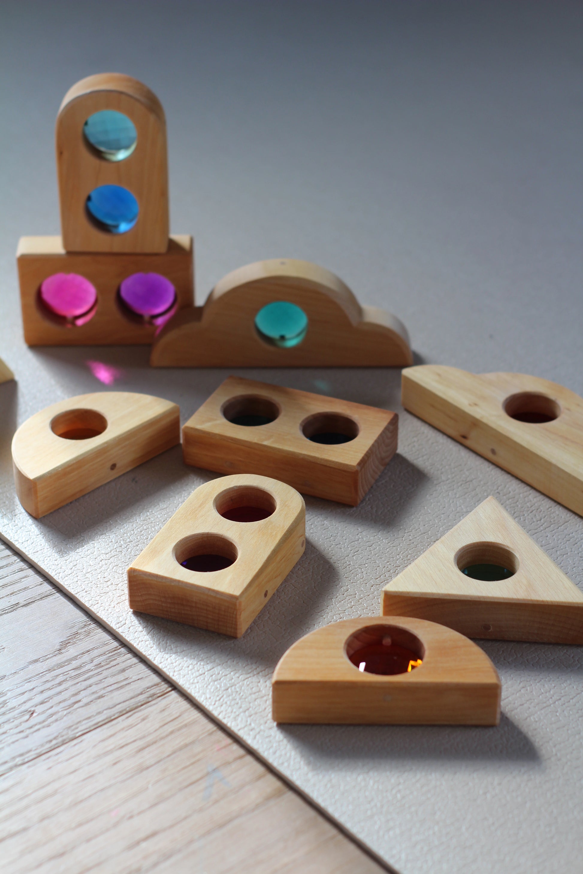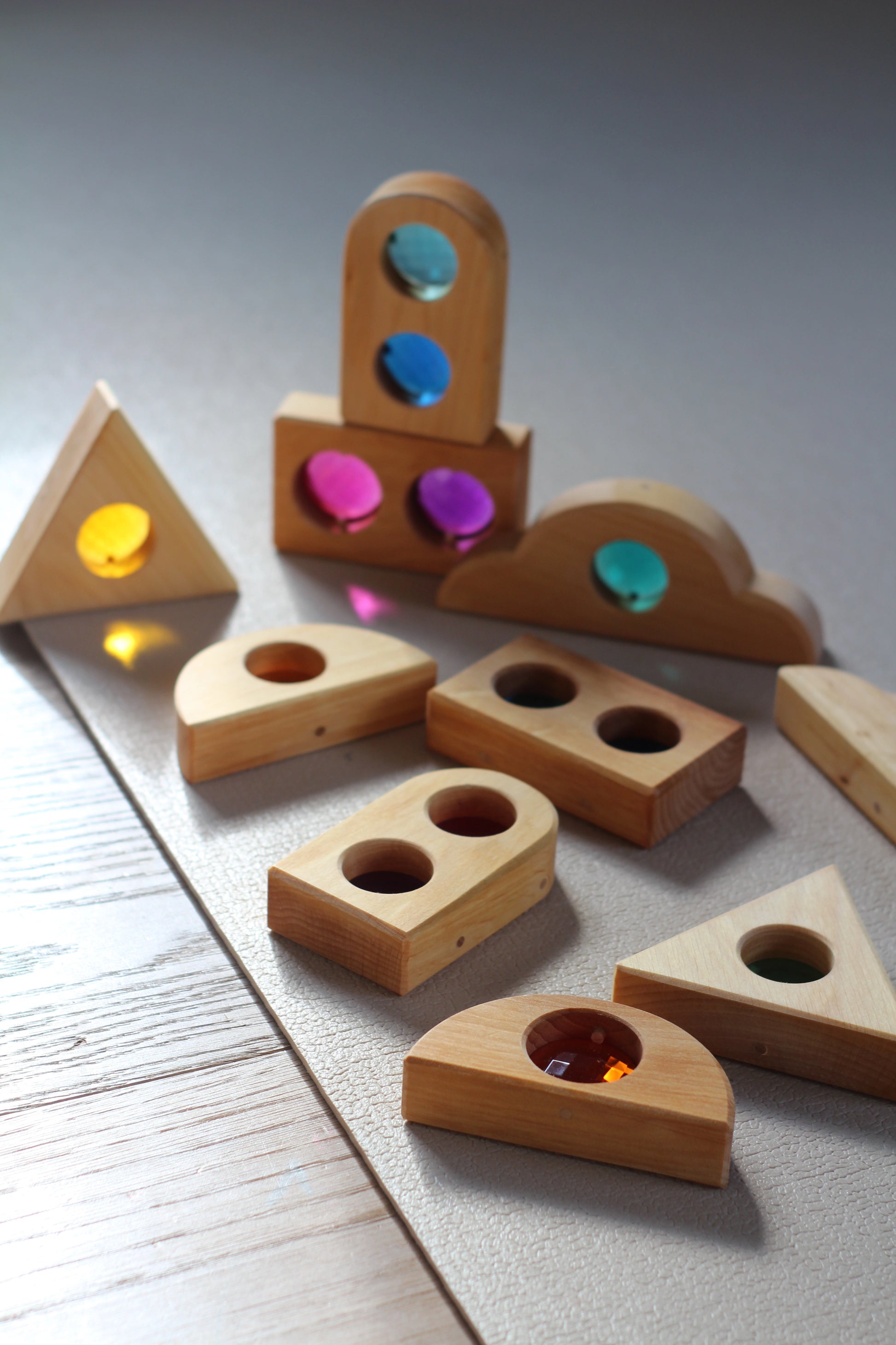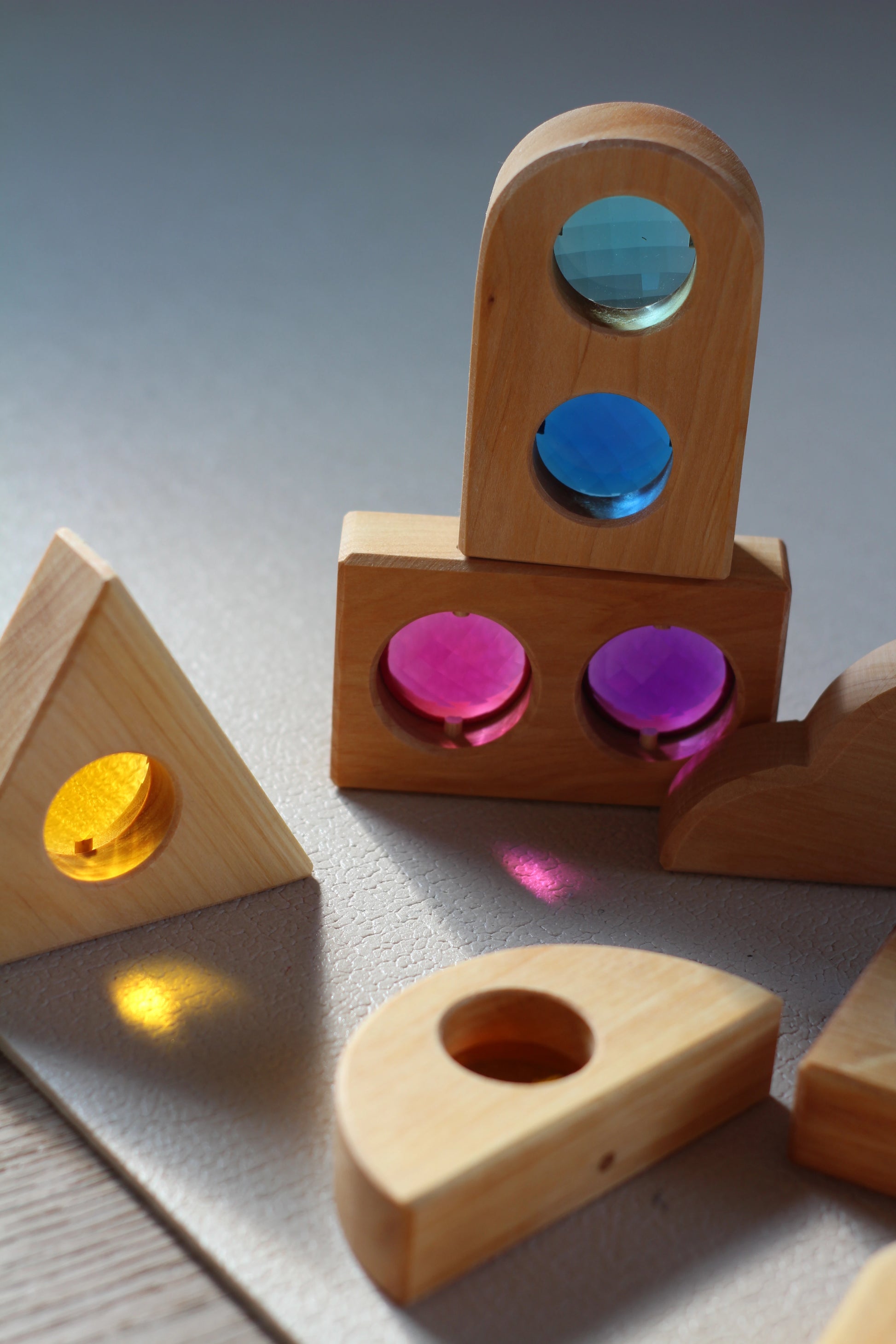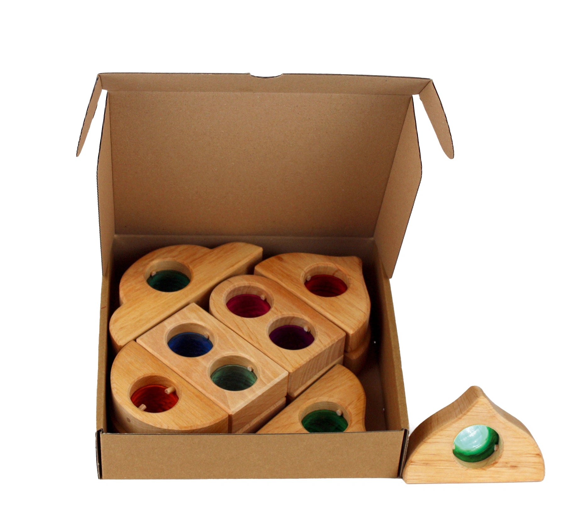 In jedem Märchenfenster liegen ein oder zwei bunte, durchscheinende Funkelsteine. Die facettierten Steine schimmern im Sonnenlicht und machen die Bauecke zu einer tollen Ergänzung für Schlösser und Burgen.