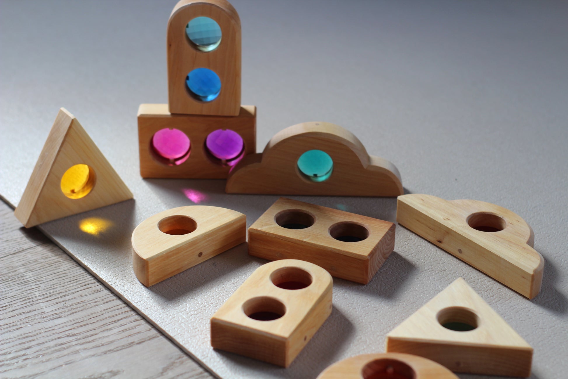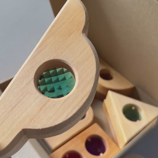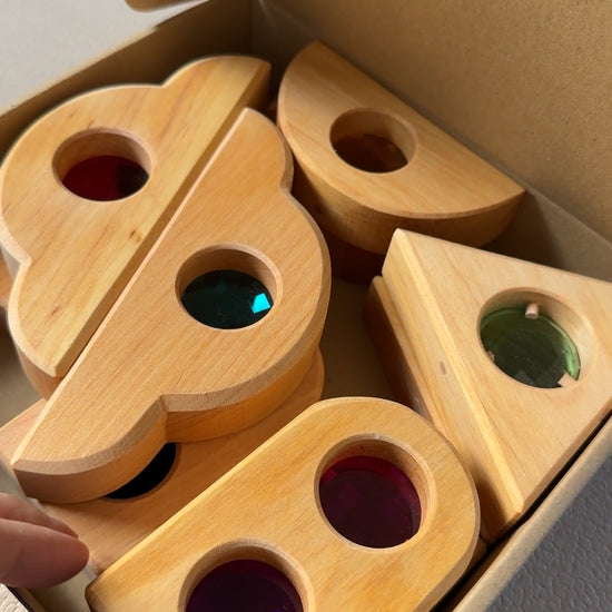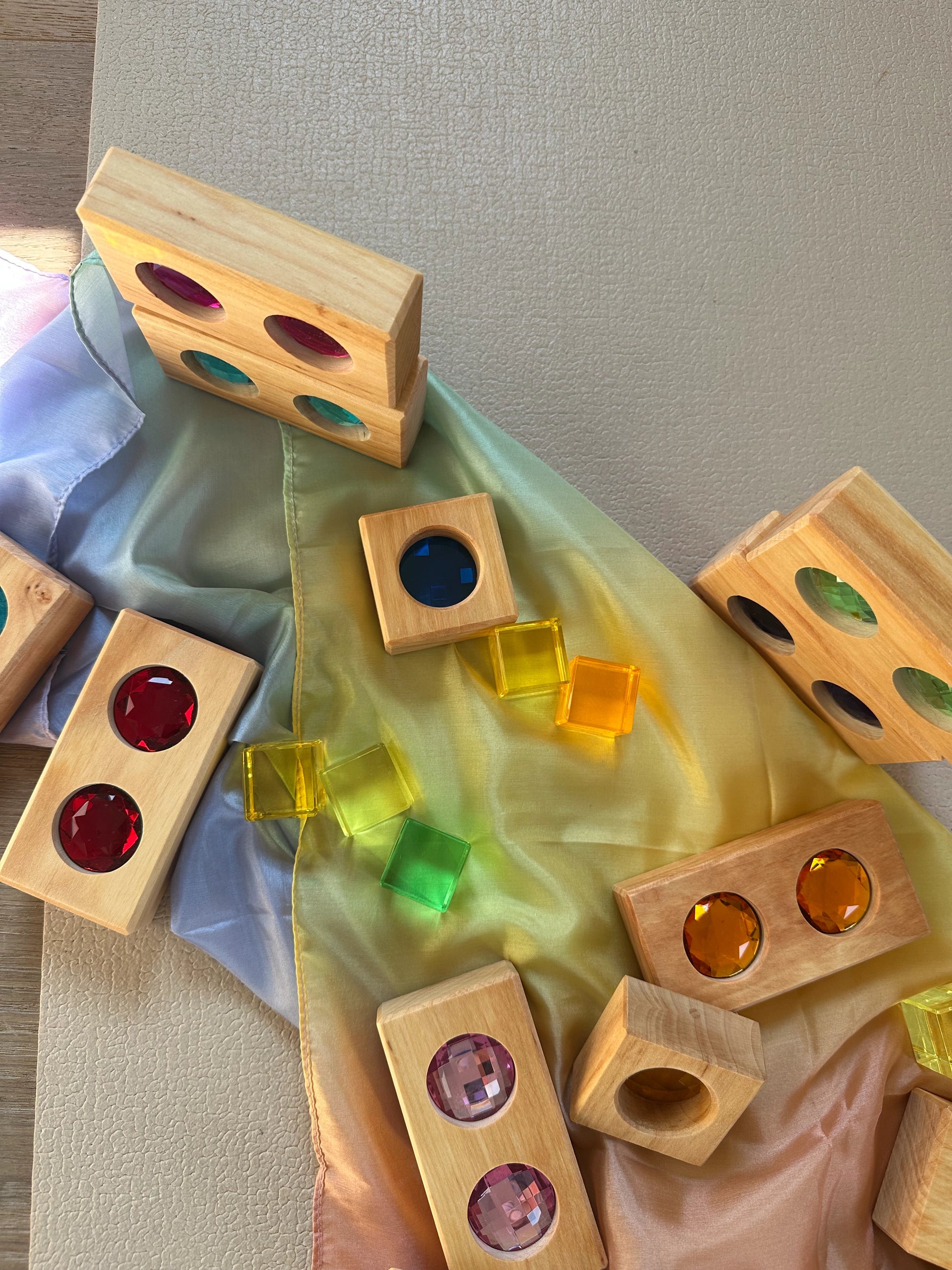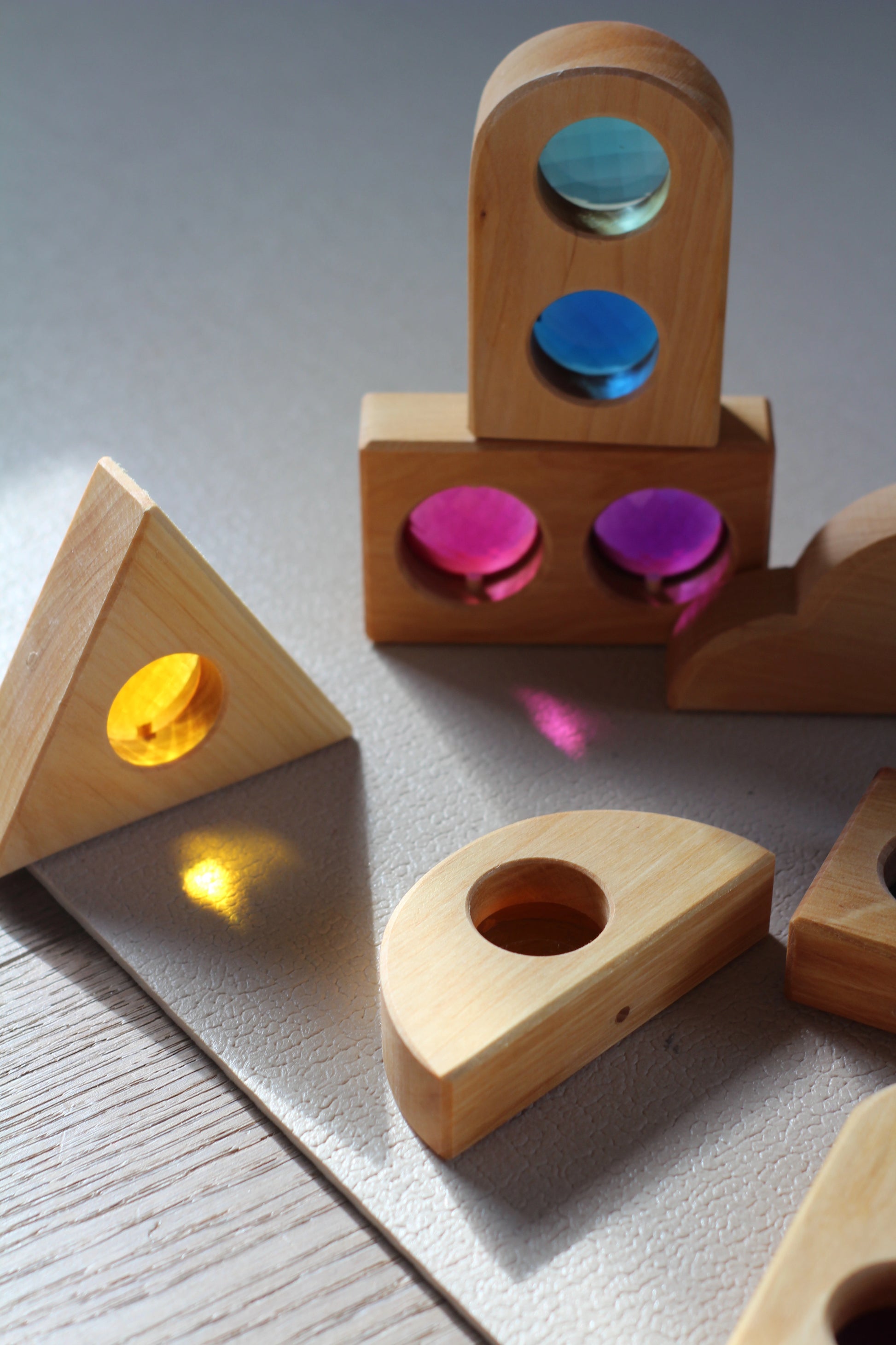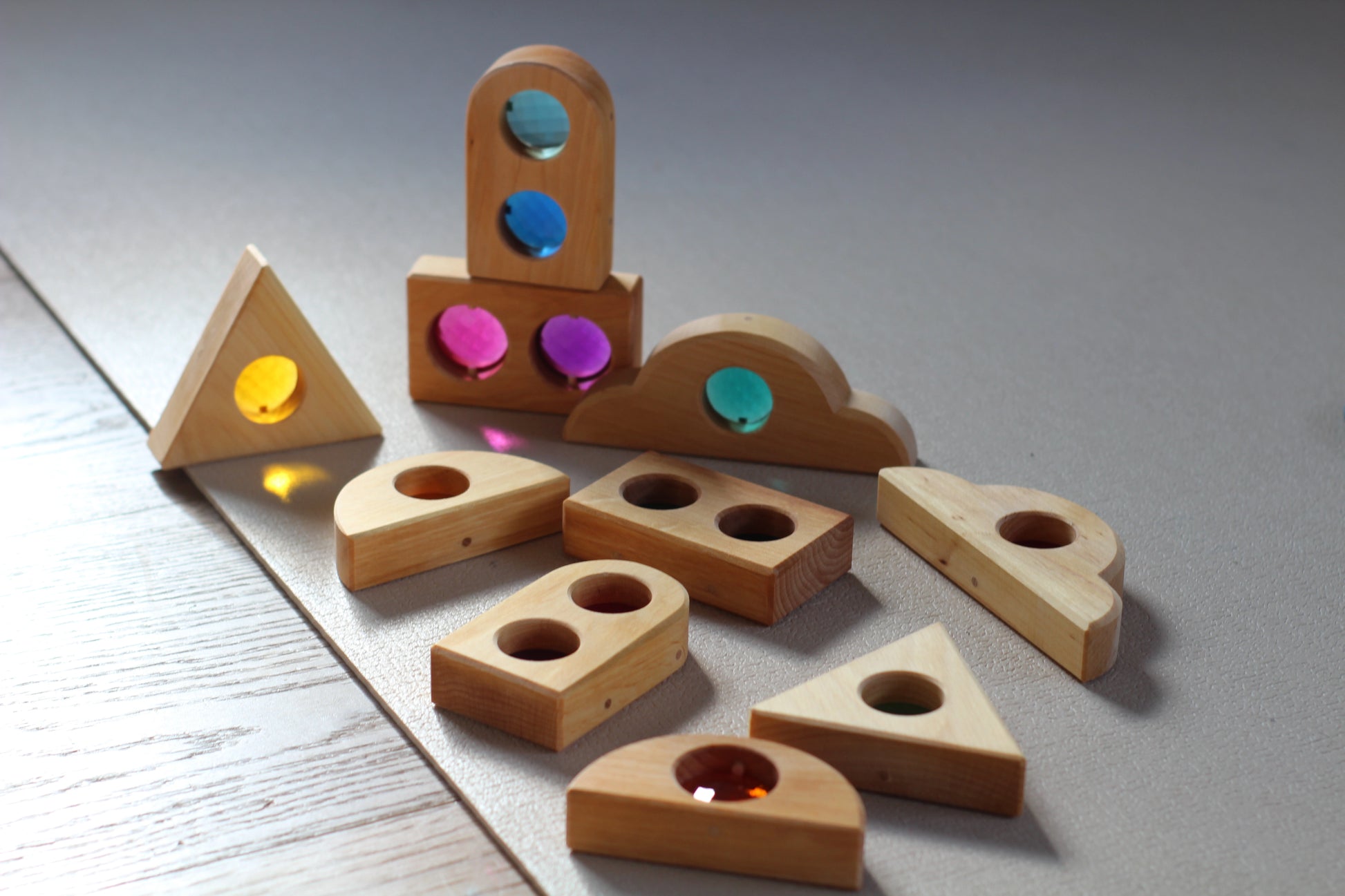 In jedem Märchenfenster liegen ein oder zwei bunte, durchscheinende Funkelsteine. Die facettierten Steine schimmern im Sonnenlicht und machen die Bauecke zu einer tollen Ergänzung für Schlösser und Burgen.