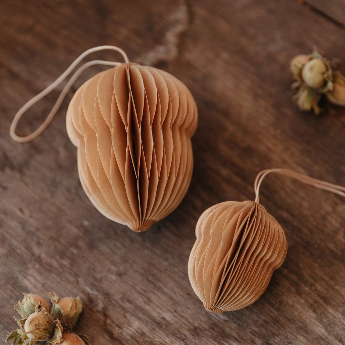 Zeitlose Dekoration im skandinavischen Stil. Mit den Entzückenden Papieranhängern in Form einer Eichel! Diese bezaubernden Papieranhänger fügen Deiner Dekoration im Spätsommer eine sanfte, natürliche Note hinzu. Ihr minimalistisches Design und die erdigen Farbtöne passen perfekt zum skandinavischen Stil und bringen eine ruhige, stilvolle Atmosphäre in Dein Zuhause. Die Papiereicheln eignen sich ideal zum Aufhängen an Zweigen, Ästen oder Sträuchern. So entsteht ein harmonisches Arrangement mit nordischer Leichtigkeit.