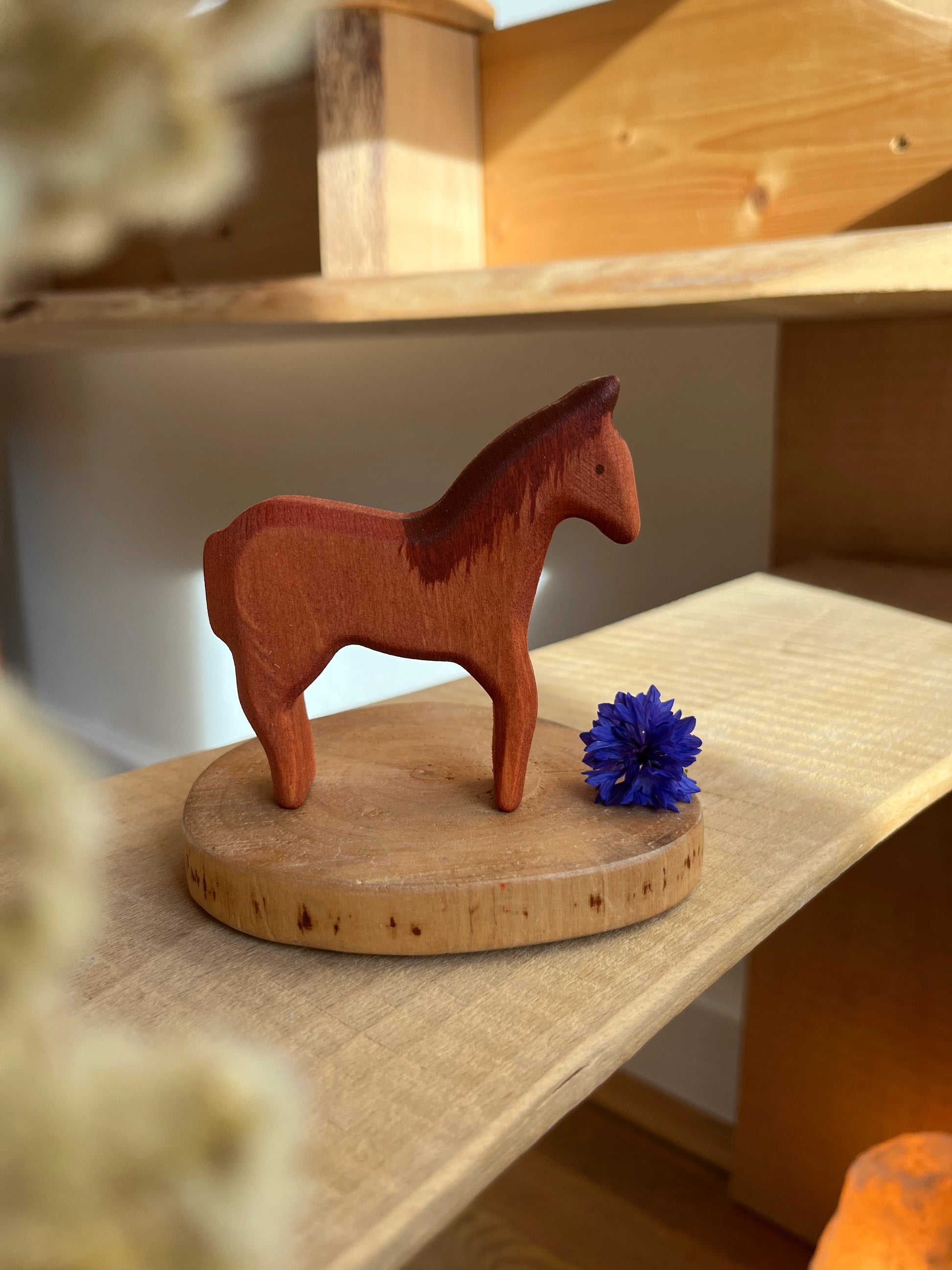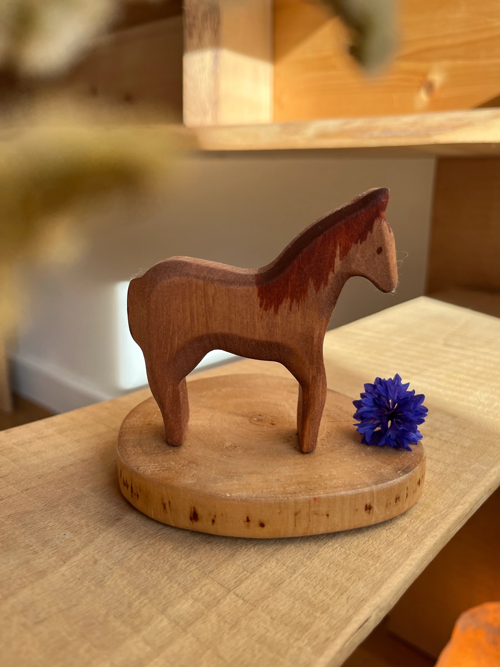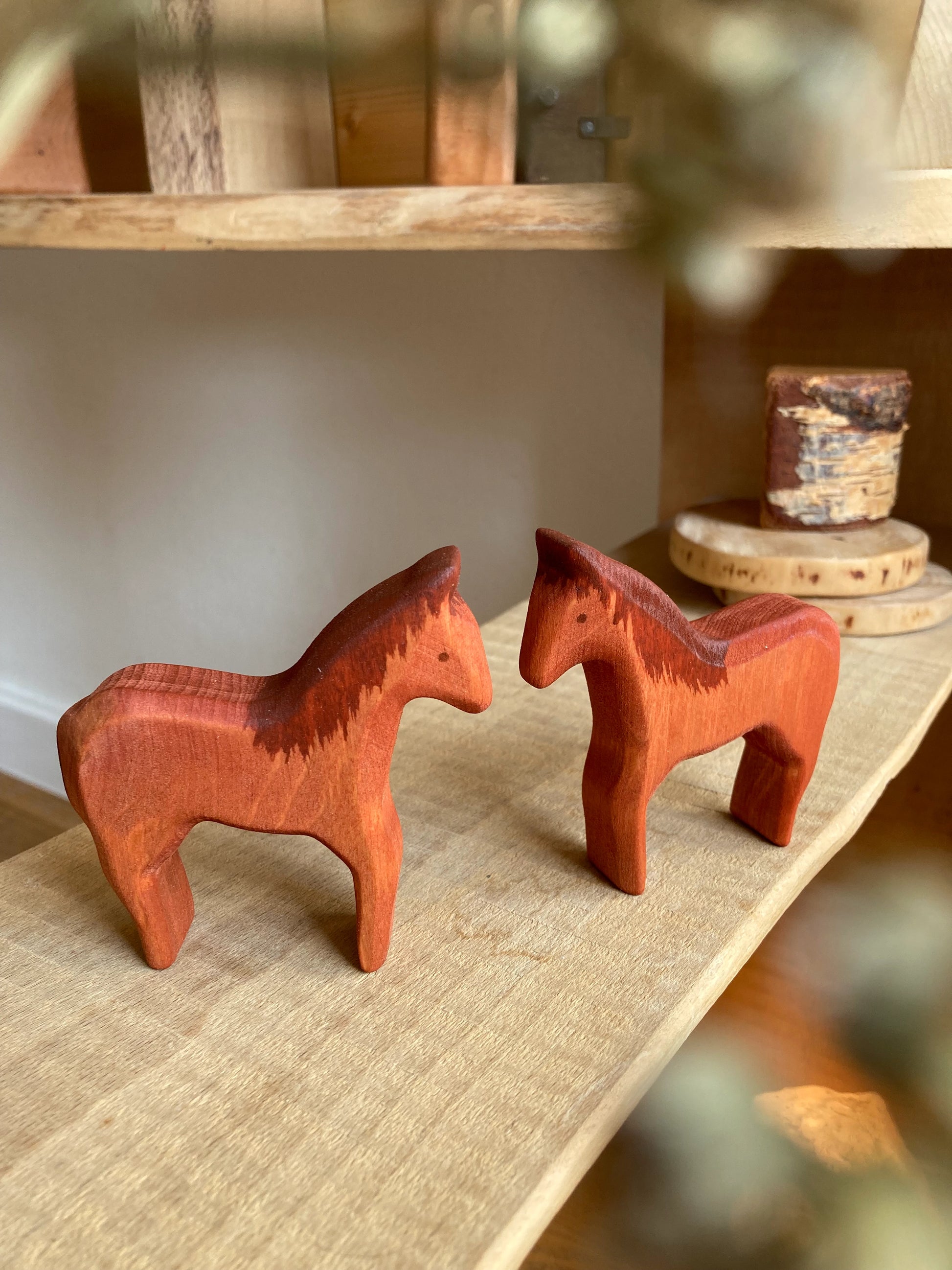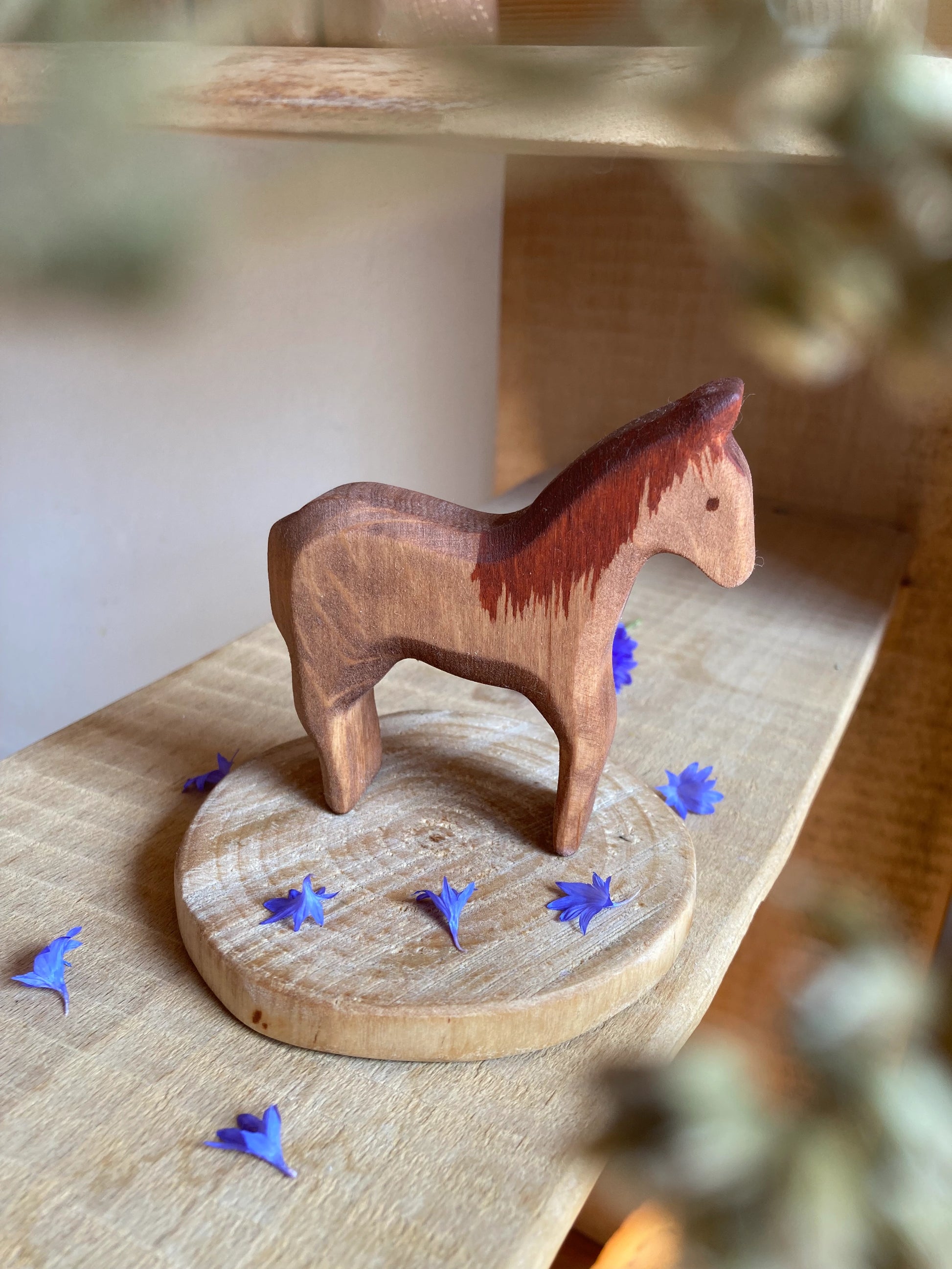 Das Pferd wird aus Erle hergestellt, von Hand bemalt und mit Leinöl geschützt. So entstehen robuste Tiere, die auch eine rauere Umgangsweise beim Spielen zulassen.