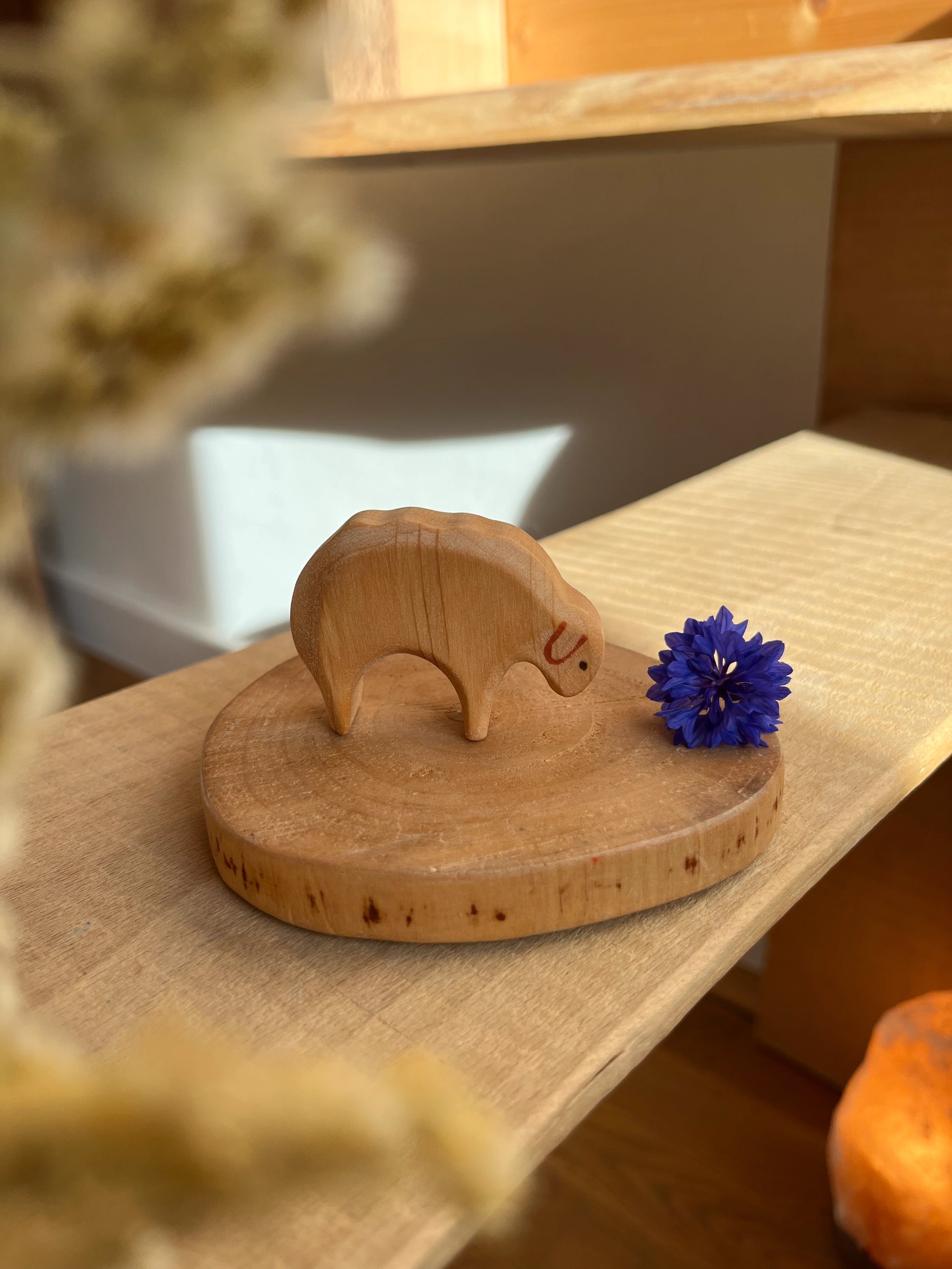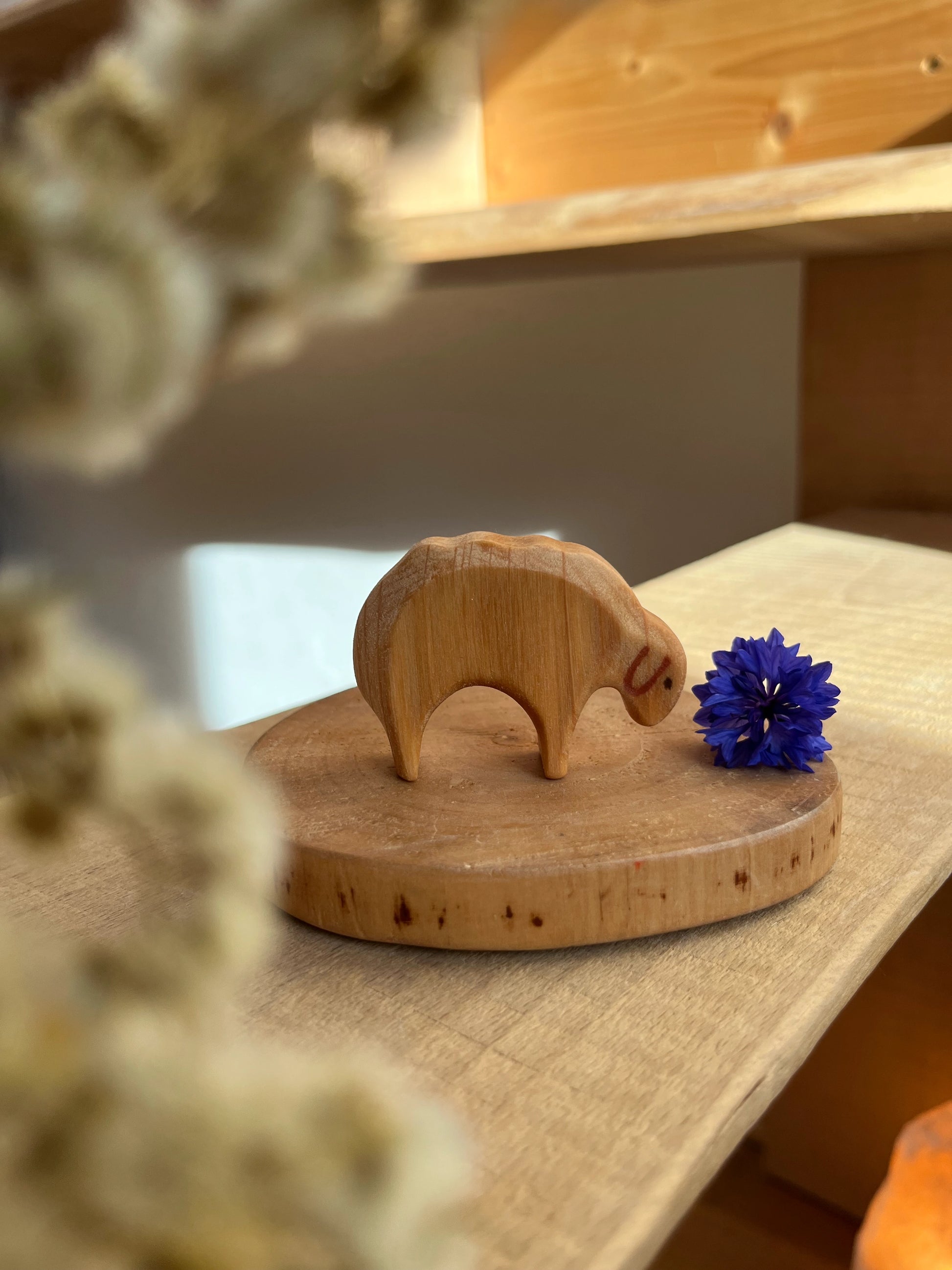 Das Schaf wird aus Erle hergestellt, von Hand bemalt und mit Leinöl geschützt. So entstehen robuste Tiere, die auch eine rauere Umgangsweise beim Spielen zulassen.