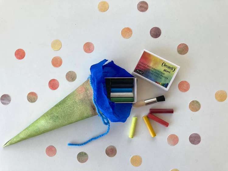 Schiebeschachtel aus Karton mit Reibefläche, 8 kleinen Farbstäbchen (Grundfarben), Reinigungsbürste (Naturborsten), Radierstäbchen.