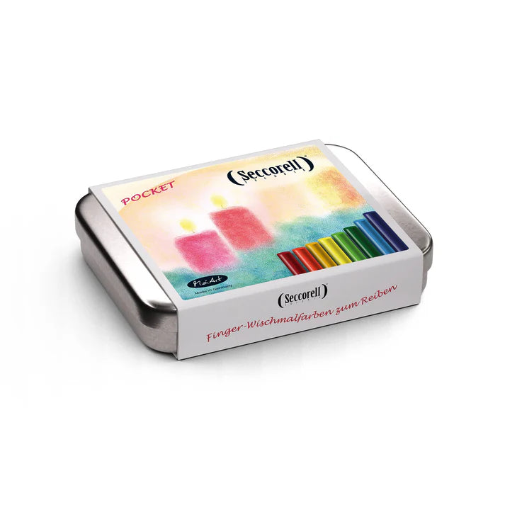 8 Farbstäbchen, Reibeblock, Reinigungsbürste (Naturborsten), Radierstäbchen, alles gebettet auf einer Filzunterlage aus 100% reinem Wollfilz.