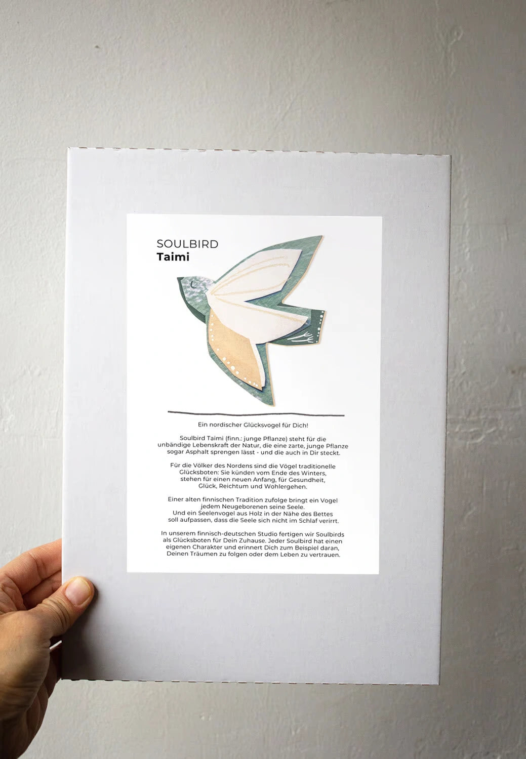 Unsere Soulbirds entstehen nach und nach in unserem finnisch-deutschen Design-Studio in Mixed-Media-Technik als kleine Kunstwerke auf Holz. Ihr erhaltet Euer Exemplar inklusive Echtheits-Zertifikat mit laufender Nummer.