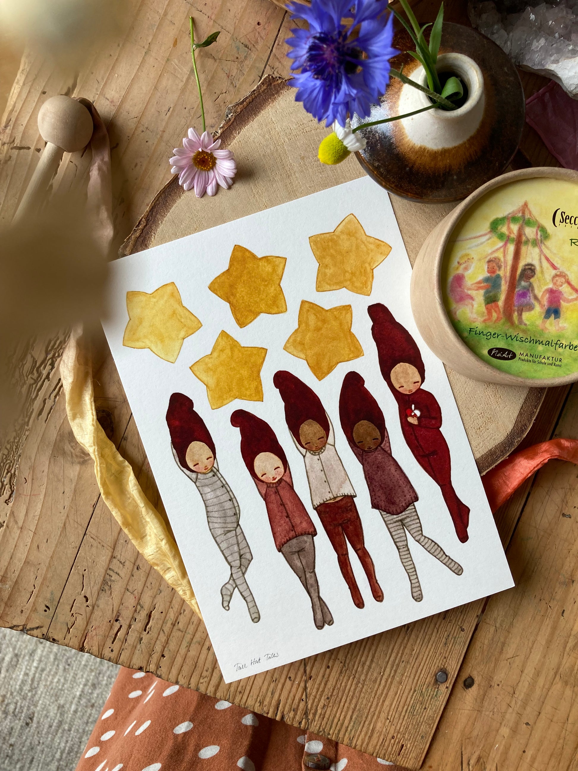 Fünf kleine Elfen, von denen jeder an seinem eigenen Stern hängt — bereit, unsere Welt in dieser dunklen Zeit zum Leuchten zu bringen. Schneide sie aus und klebe oder nähe sie zusammen, sodass jede Elfe an ihrem eigenen kleinen Stern hängt.