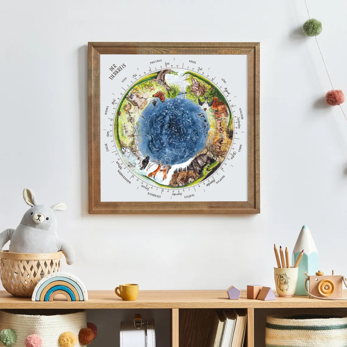 Eine lebendige, detailgetreue Sternkarte für Kinder mit den Sternbildern des Tierkreises und zugleich ein farbenfrohes Mandala mit Tieren: perfekt als Geschenk zur Einschulung für kleine Sterngucker oder als Kinderzimmer Weltall Deko!